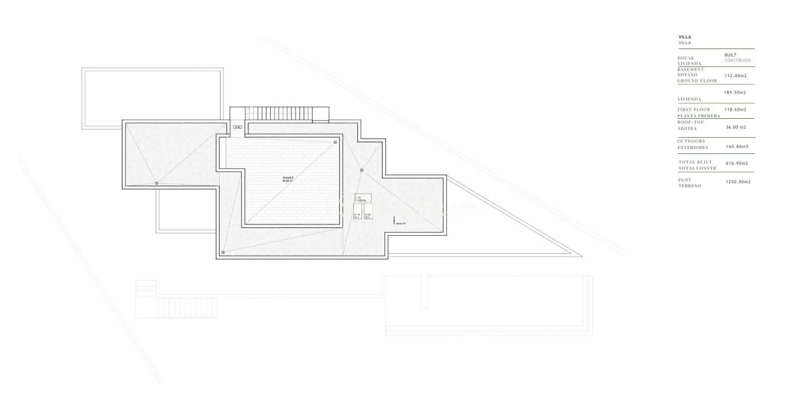 L’habitatge s’assenta sobre una parcel·la enjardinada de 1.250 m² i ofereix una superfície construïda de 616,90 m², distribuïts en dues plantes principals i un ampli semisoterrani amb garatge. La propietat compta a més amb espectaculars terrasses, porxos i una piscina privada amb vistes al camp de golf.