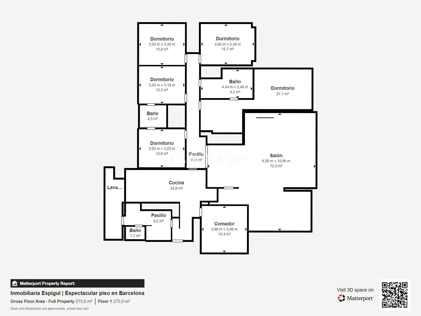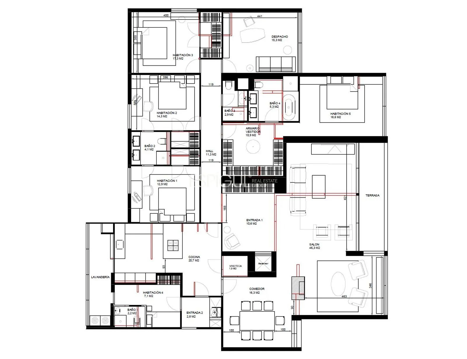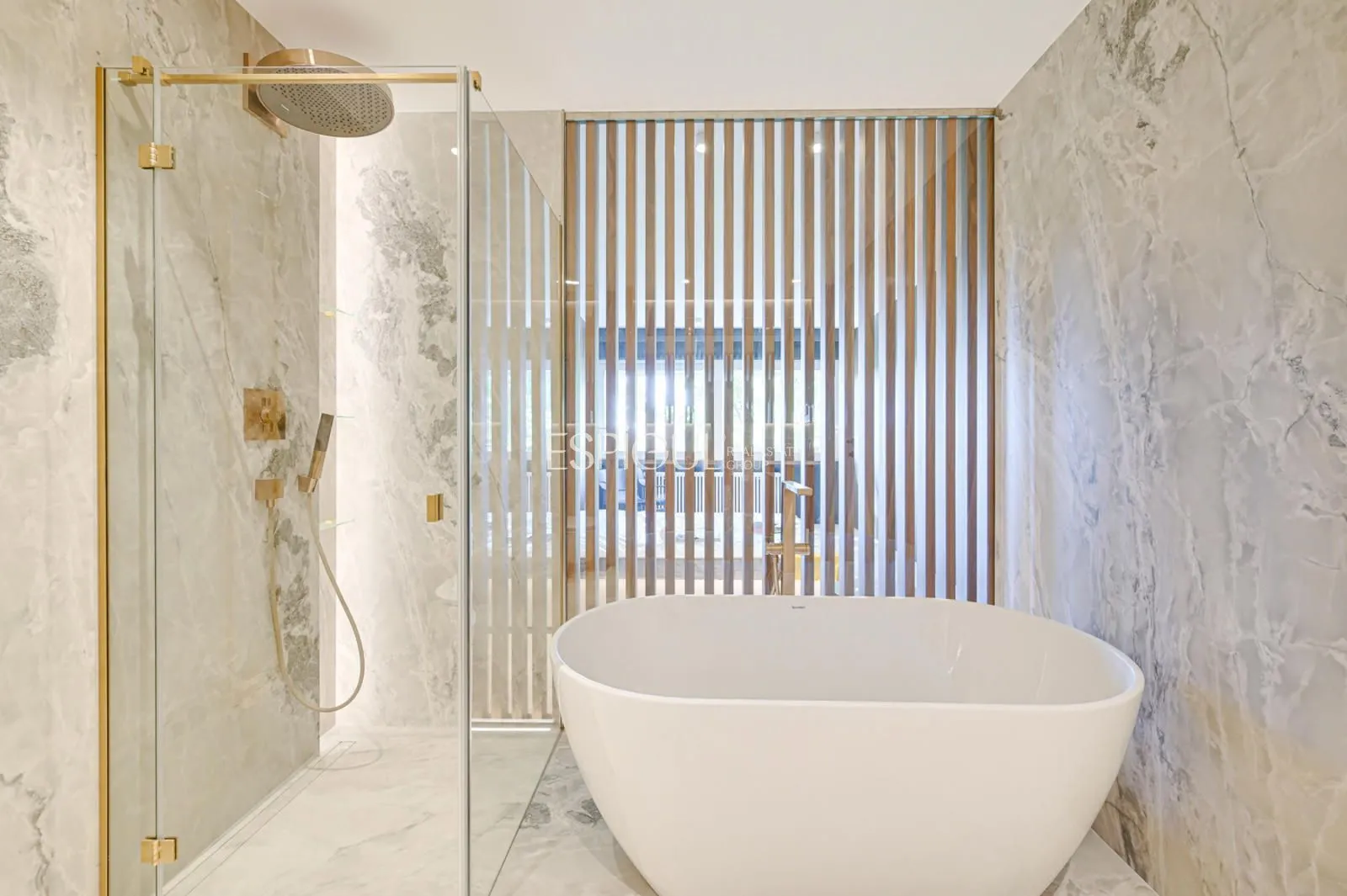El saló-menjador, dividit en dos ambients, es converteix en el cor de la llar, amb sortida directa a una agradable terrassa privada amb vistes al jardí comunitari. El menjador incorpora una vinoteca integrada de disseny, ideal per als amants del vi i la gastronomia. La cuina independent, de línies netes i estil funcional, està completament equipada i des d’ella, s’accedeix a una pràctica zona d’aigües amb galeria. La vivenda alberga cinc dormitoris amb armaris encastats, entre ells una suite amb bany complet i vestidor. Es completa amb dos banys addicionals i un lavabo de cortesia.