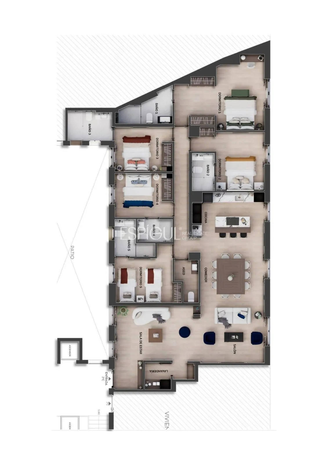 L´ampli vestíbul d´entrada condueix a un impressionant saló-menjador amb cuina integrada, un espai diàfan i lluminós concebut per gaudir tant de la vida quotidiana com de moments socials. La cuina, equipada amb electrodomèstics premium, combina estètica moderna i practicitat.