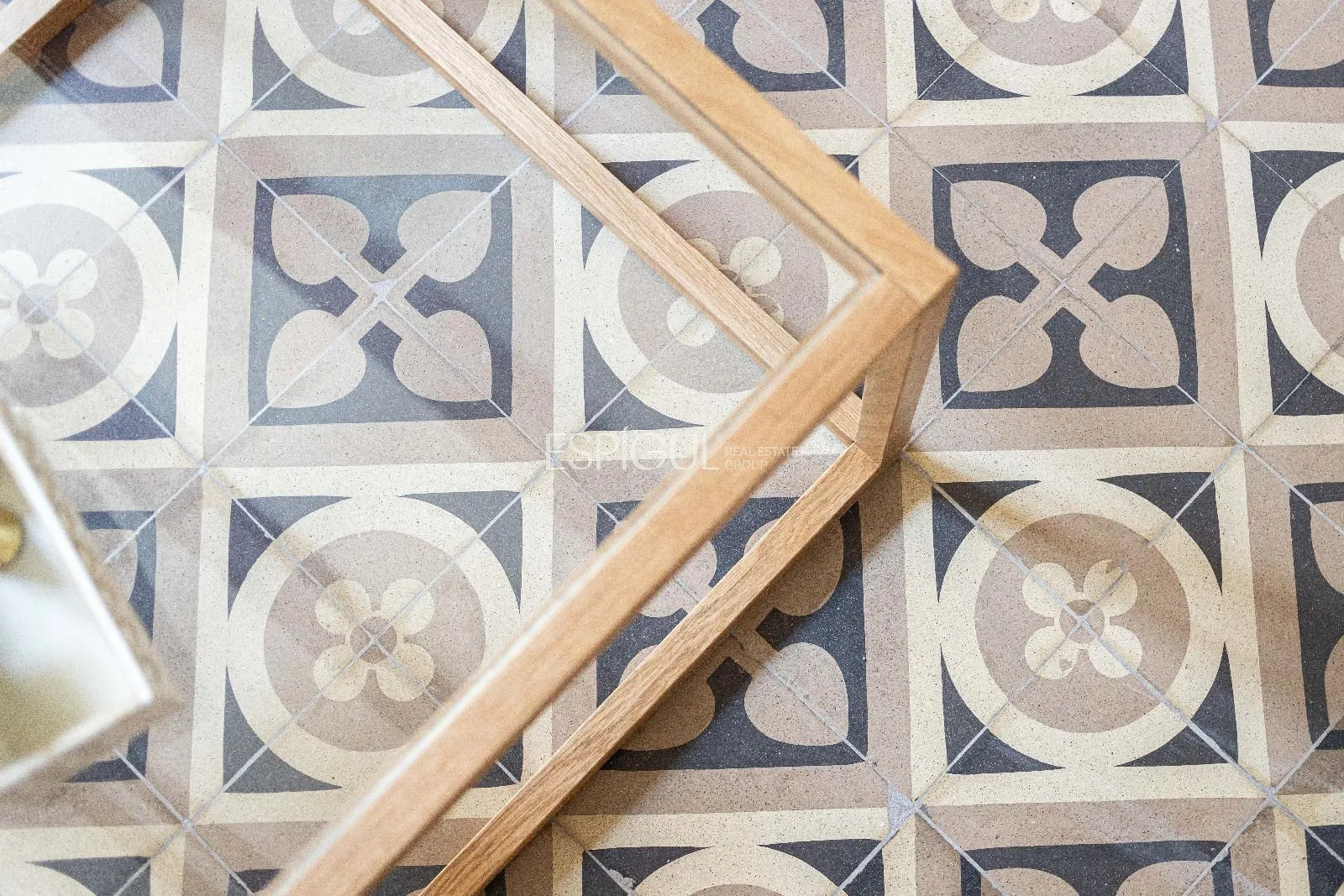 Cada racó reflecteix l’excel·lència d’una rehabilitació executada amb sensibilitat i dedicació on materials nobles i acabats de qualitat aporten calidesa, distinció i caràcter. La fusteria de fusta, els terres hidràulics originals i les bigues vistes restaurades es combinen amb una acurada decoració neutra, aconseguint una harmoniosa fusió entre el clàssic i el contemporani.