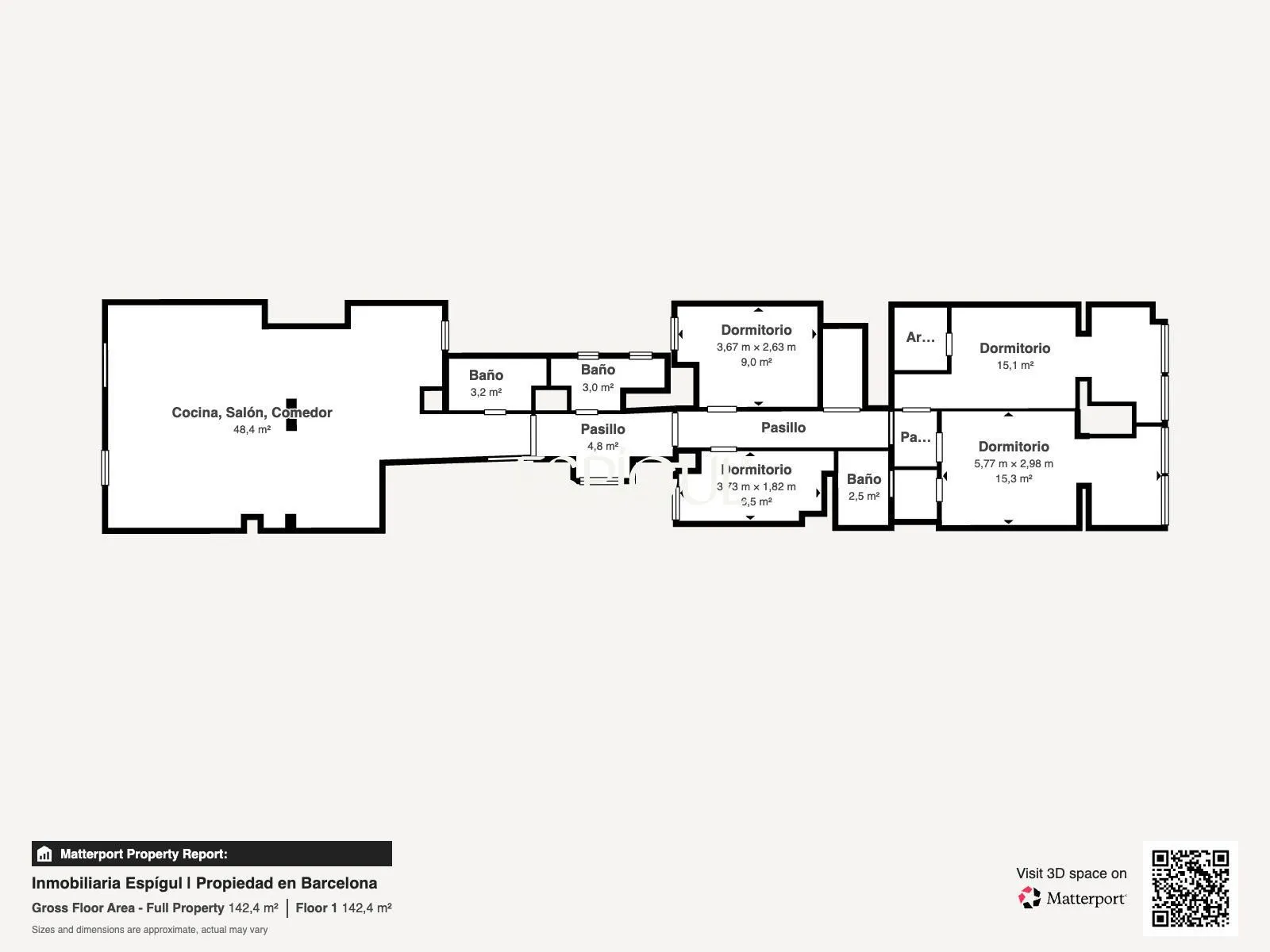 La zona de nit disposa de quatre dormitoris, un d’ells en suite, a més de tres banys complets, configurats per brindar amplitud, funcionalitat i versatilitat a famílies o a qui busca un espai exclusiu per viure i treballar.