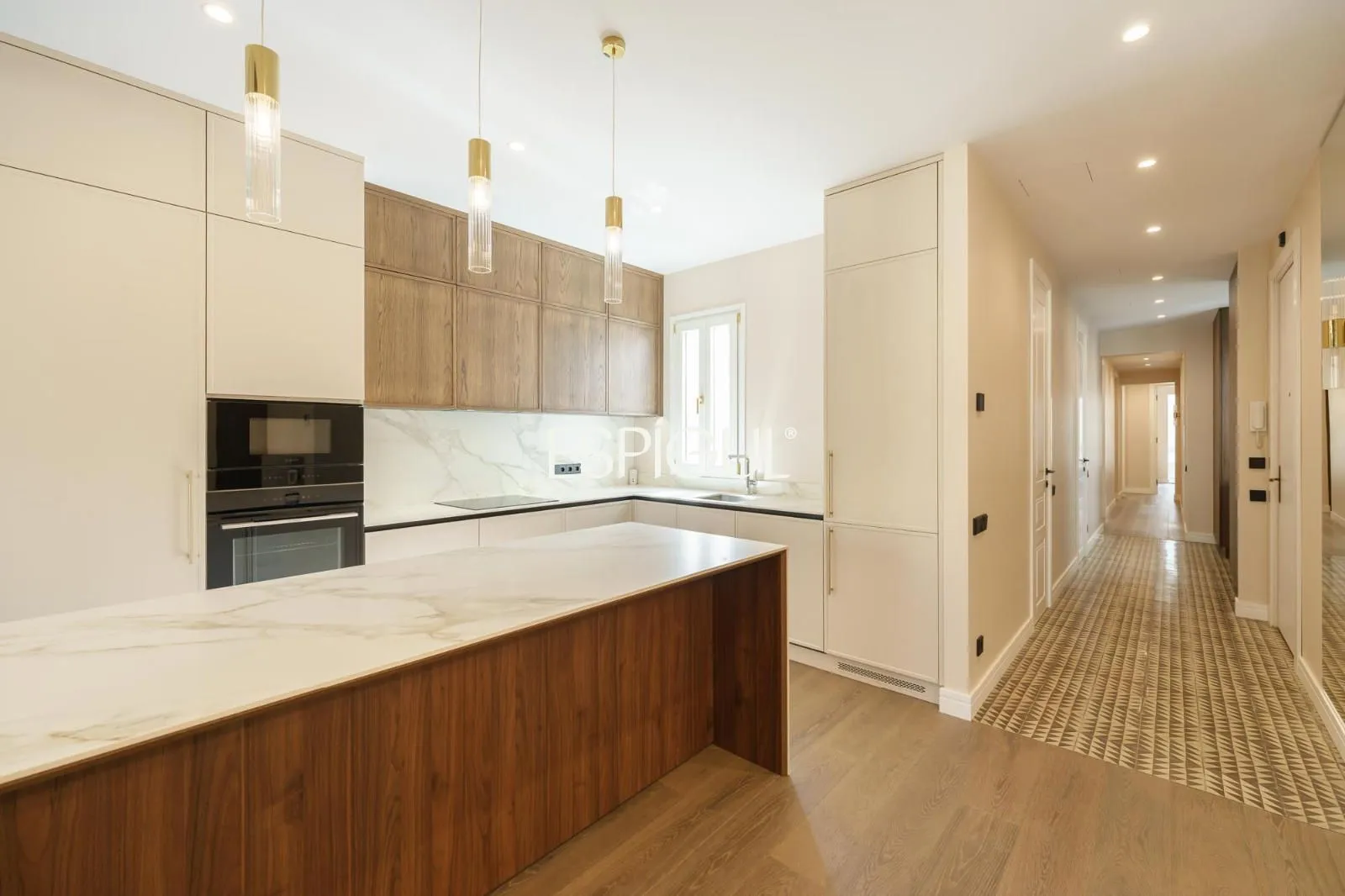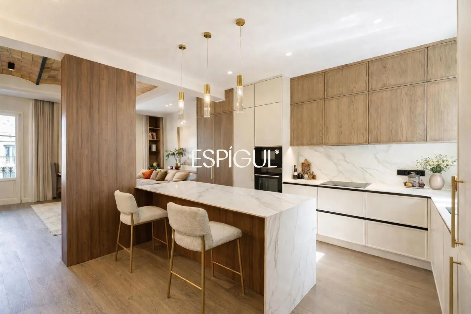 El saló-menjador de 50 m², banyat de llum natural, es connecta amb una cuina oberta de disseny amb illa central i electrodomèstics d’alta gamma, i compta amb sortida directa a dos balcons amb vistes úniques.