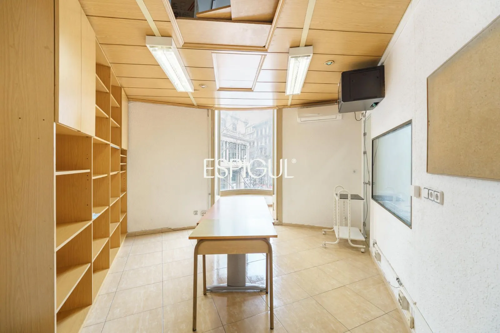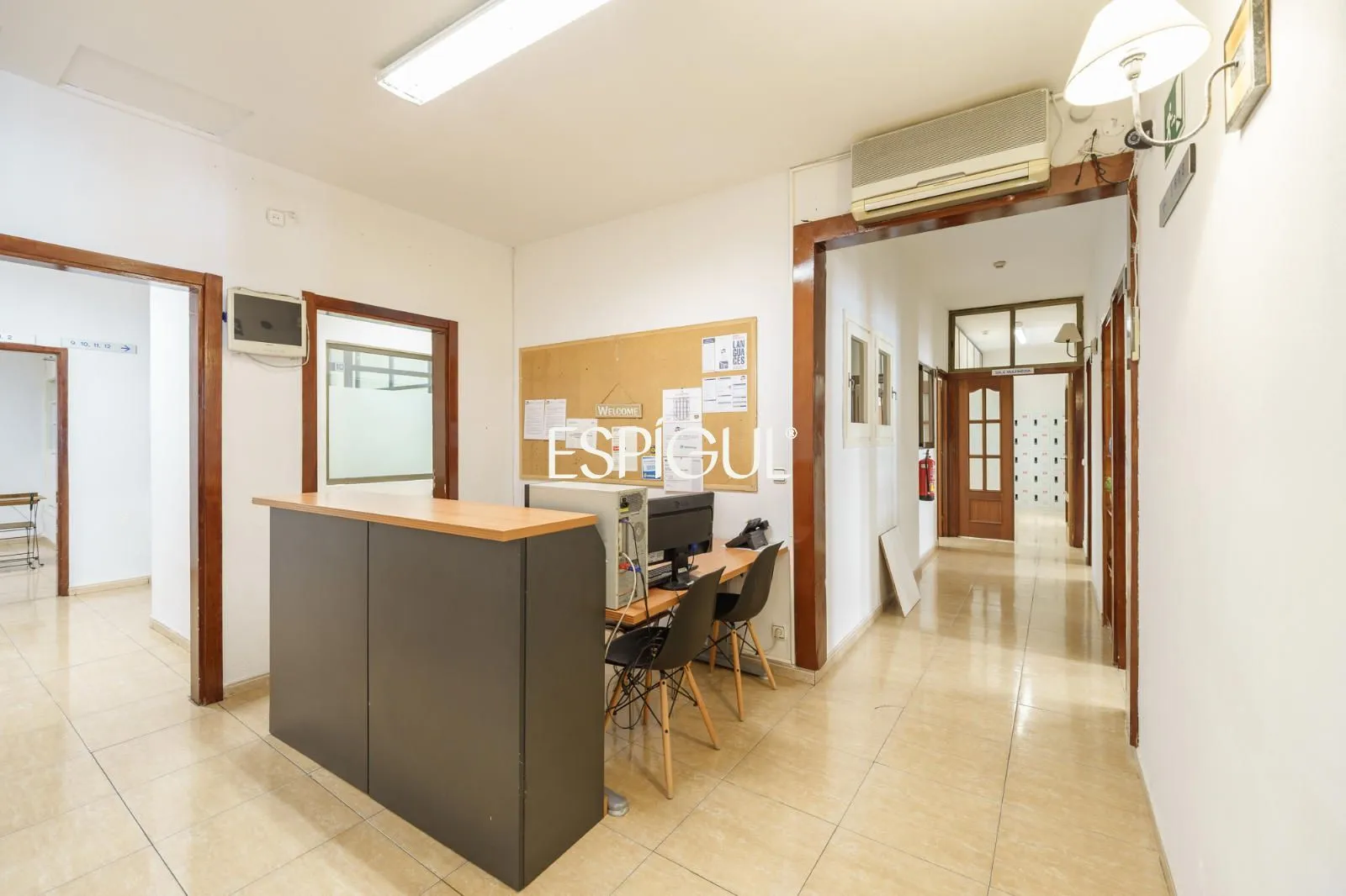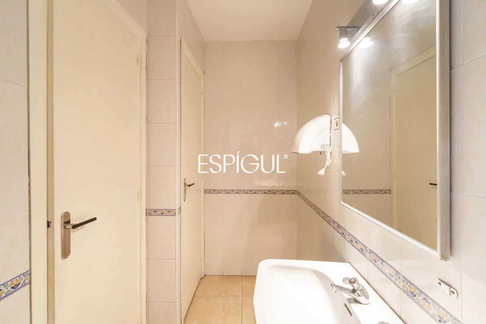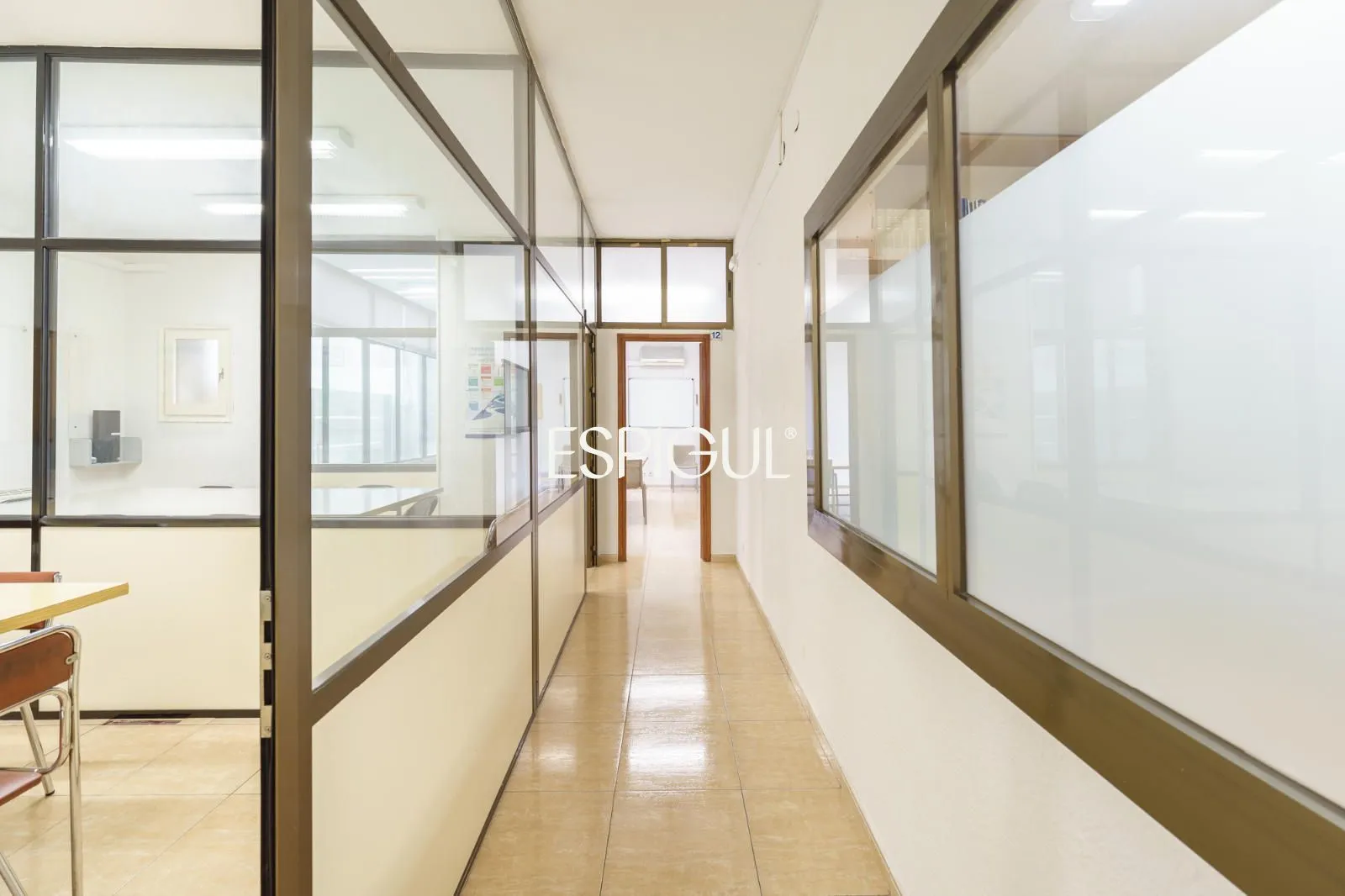 La propietat ocupa actualment la unió de dues entitats, sumant 415 m² construïts en una sola planta. Els seus sostres de gairebé quatre metres d’altura aporten una sensació d’amplitud excepcional i permeten recuperar elements originals com l’emblemàtica volta catalana, que es pot realçar en una futura rehabilitació. A ambdós extrems, galeries envidrades inunden els espais de llum natural i reforcen el caràcter clàssic de l’habitatge.