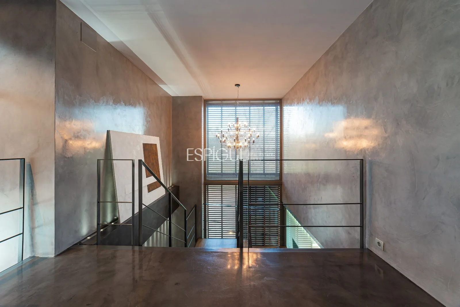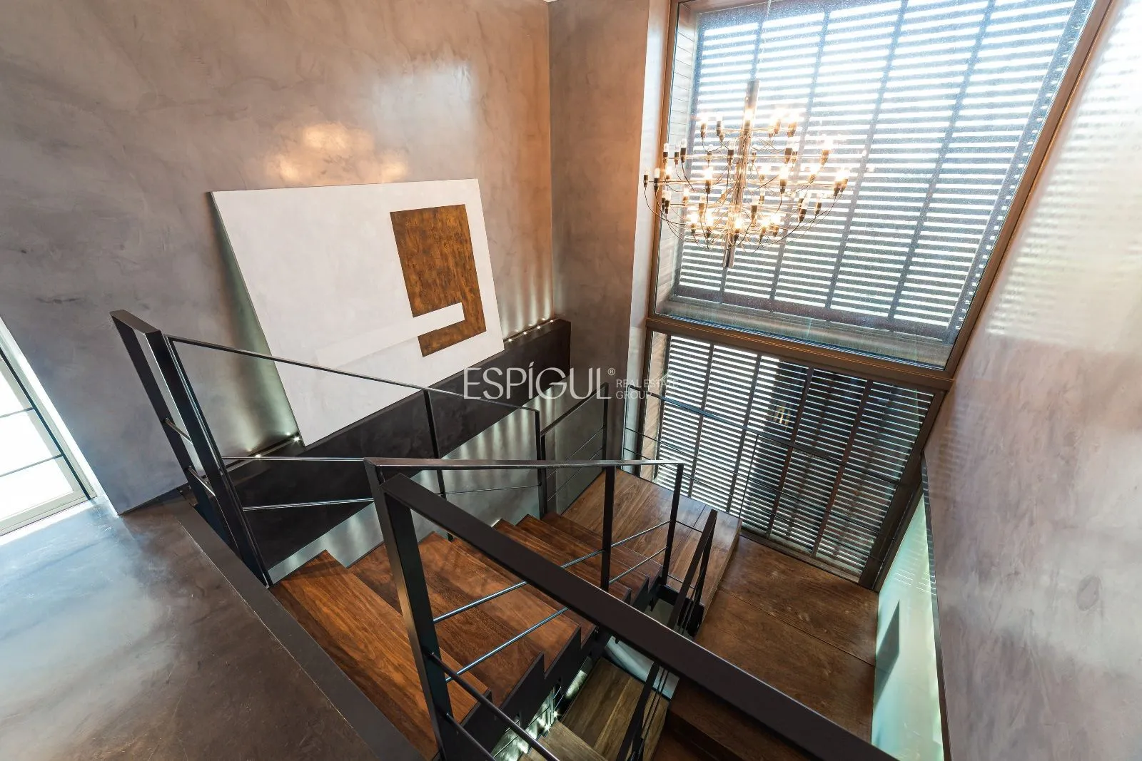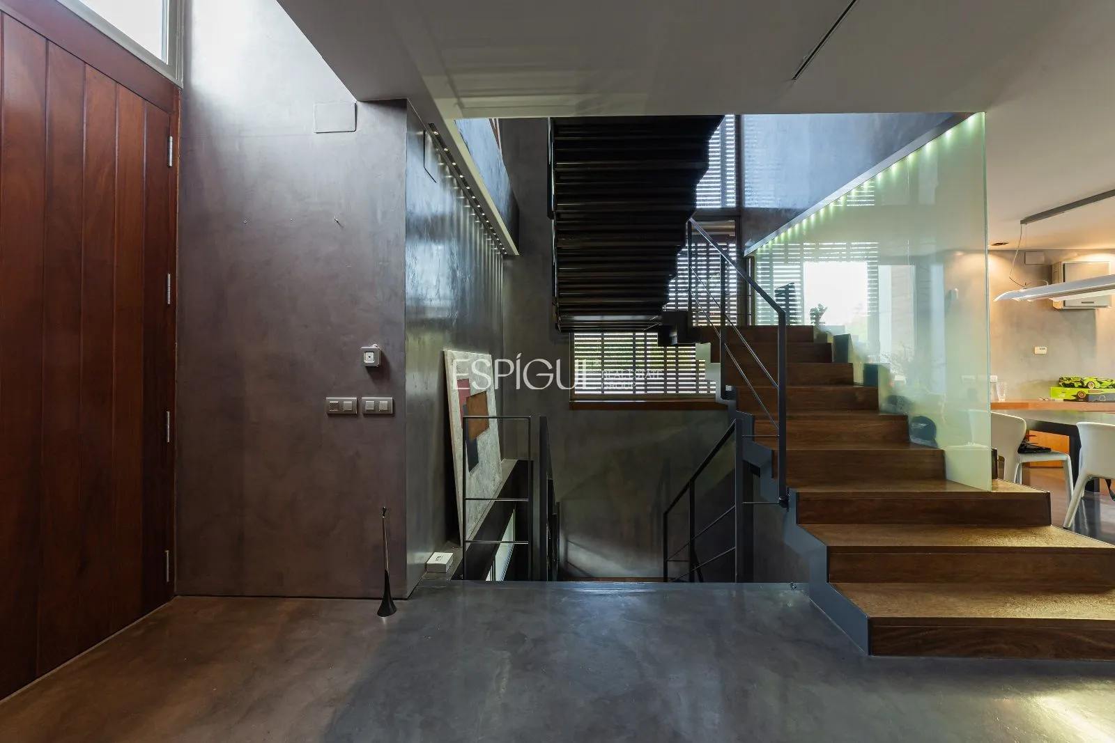 L’escala principal té graons de fusta natural sobre estructura d’acer pintada en tons grisos. Un translúcid de disseny connecta tota la casa amb un joc de llums que també podria ser destinat a ascensor, si es precisés.
