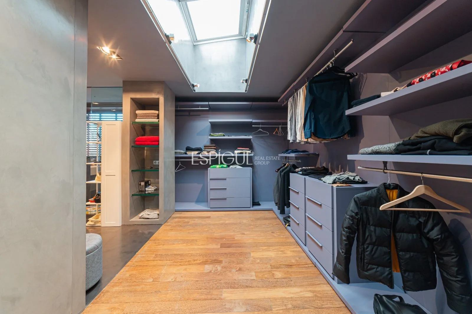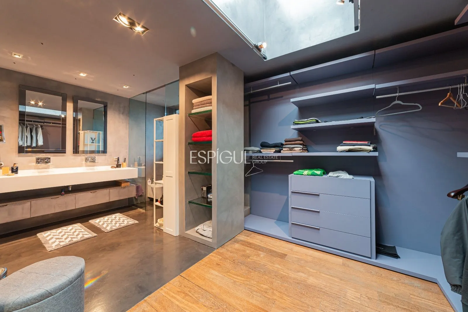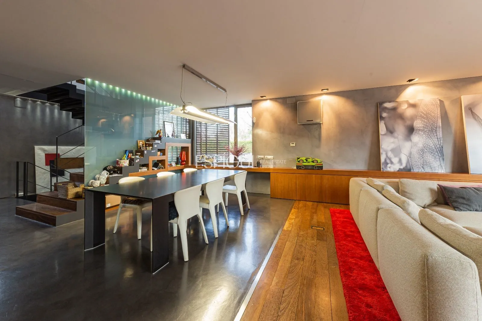 L’escala principal té graons de fusta natural sobre estructura d’acer pintada en tons grisos. Un translúcid de disseny connecta tota la casa amb un joc de llums que també podria ser destinat a ascensor, si es precisés.