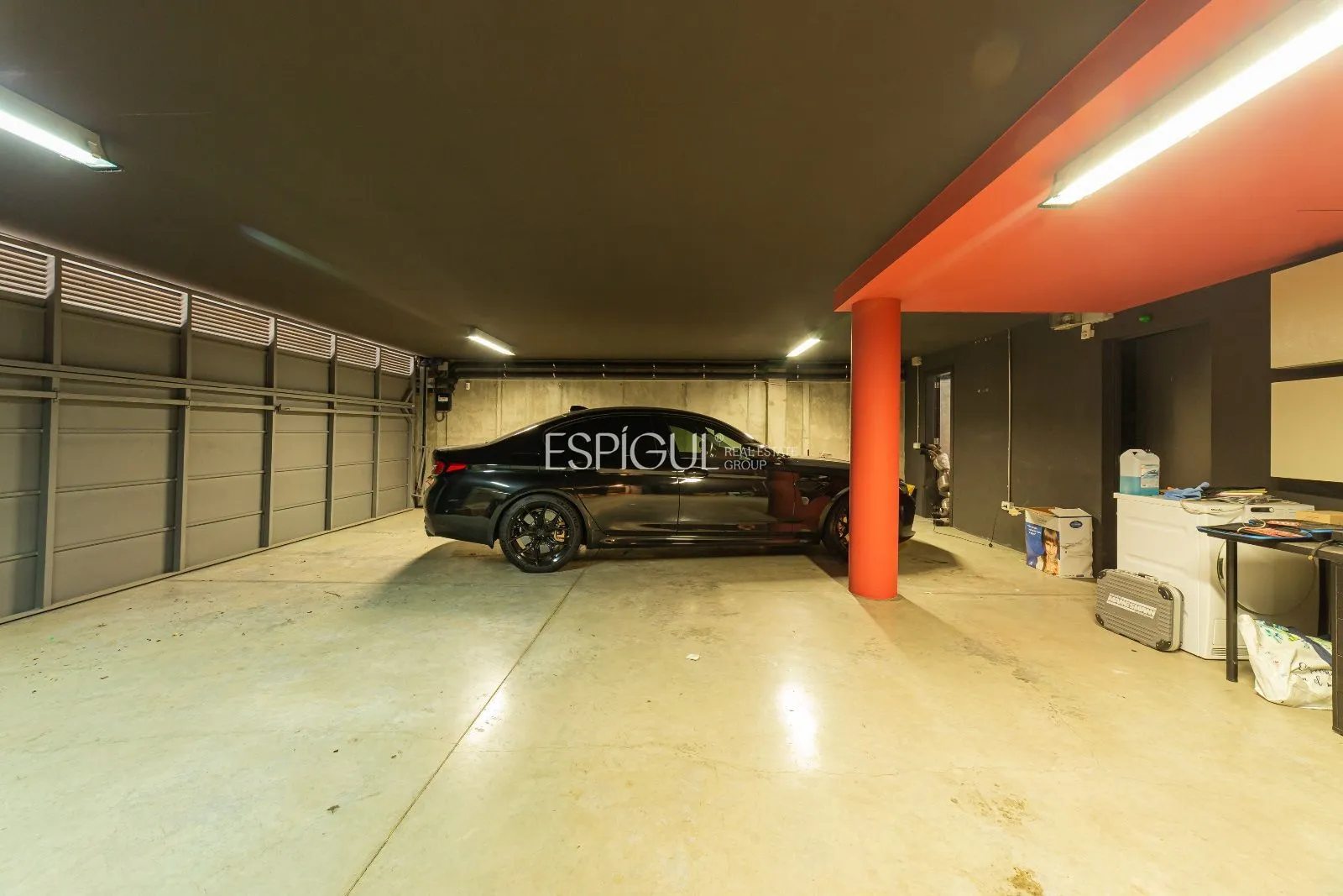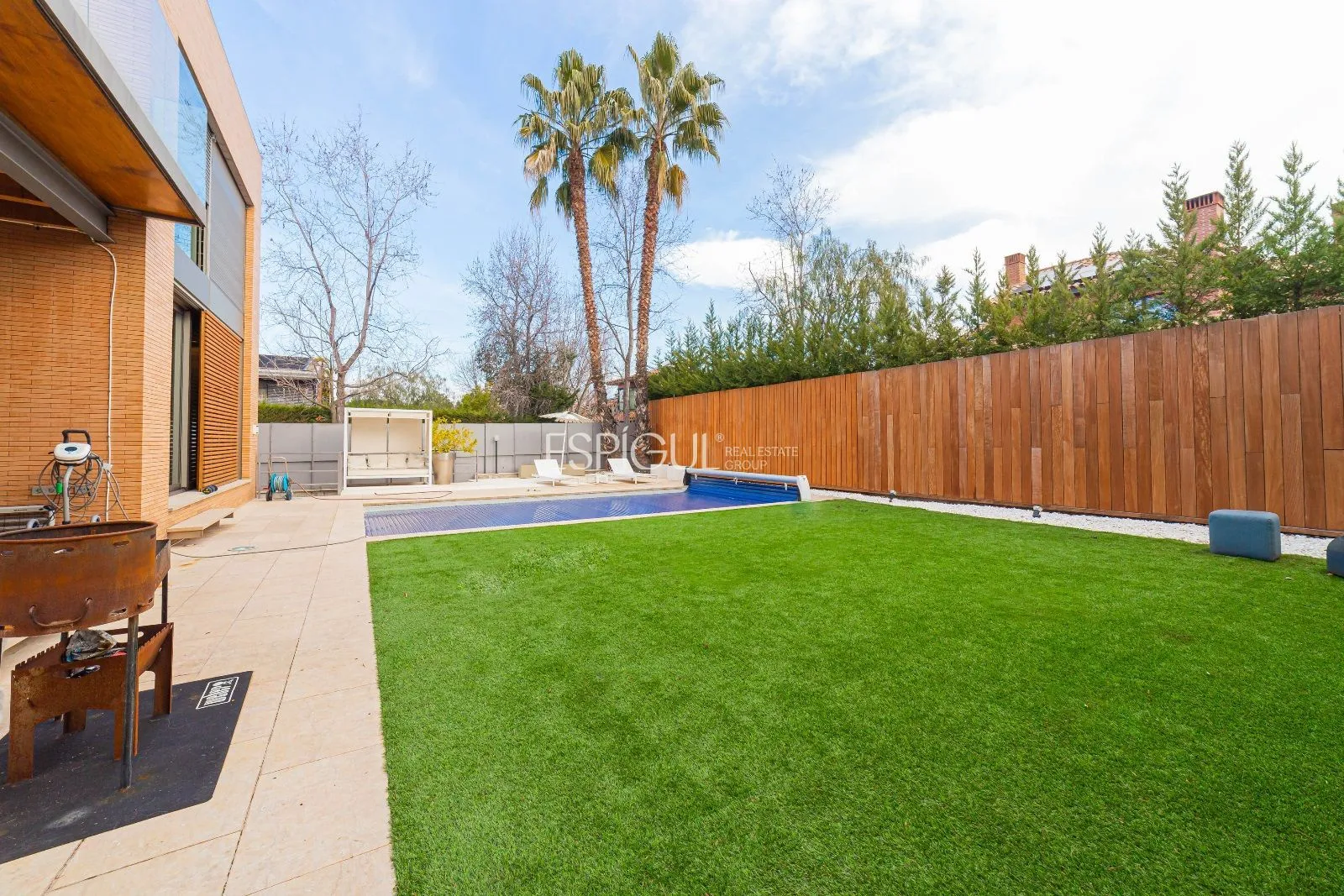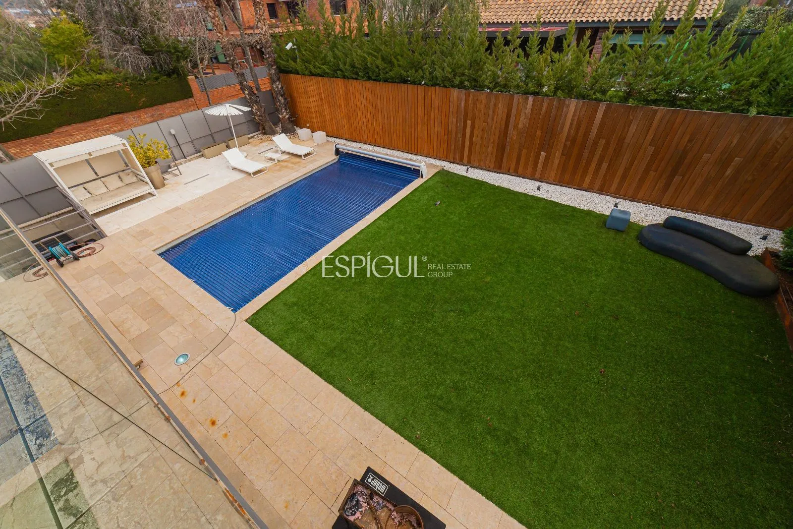 La parcel·la disposa d’un pou d’aigua natural connectat al reg automàtic, per la qual cosa el consum d’aigua per al reg del jardí és nul. Realitzada per l’arquitecte Albert Artigas i l’interiorisme ha estat realitzat per la prestigiosa dissenyadora, Estrella Salietti, amb mobles i equipament de les millors marques de luxe i disseny com Cassina, Natuzzi, Kartell, Bulthap, Gaggenau, Fontana Arte, Axor Stark Hansgrove, Duravit, Ritmonia, combinant amb acabats de microciment gris amb calefacció radiant. Fusteria Technal de primera gamma d’alumini anoditzat de color gris amb trencament de pont tèrmic, vidre tèrmic i cambra d’aire. Les persianes són d’alumini enrotllables amb lames orientables o persianes corredisses de lames de fusta per a exterior.