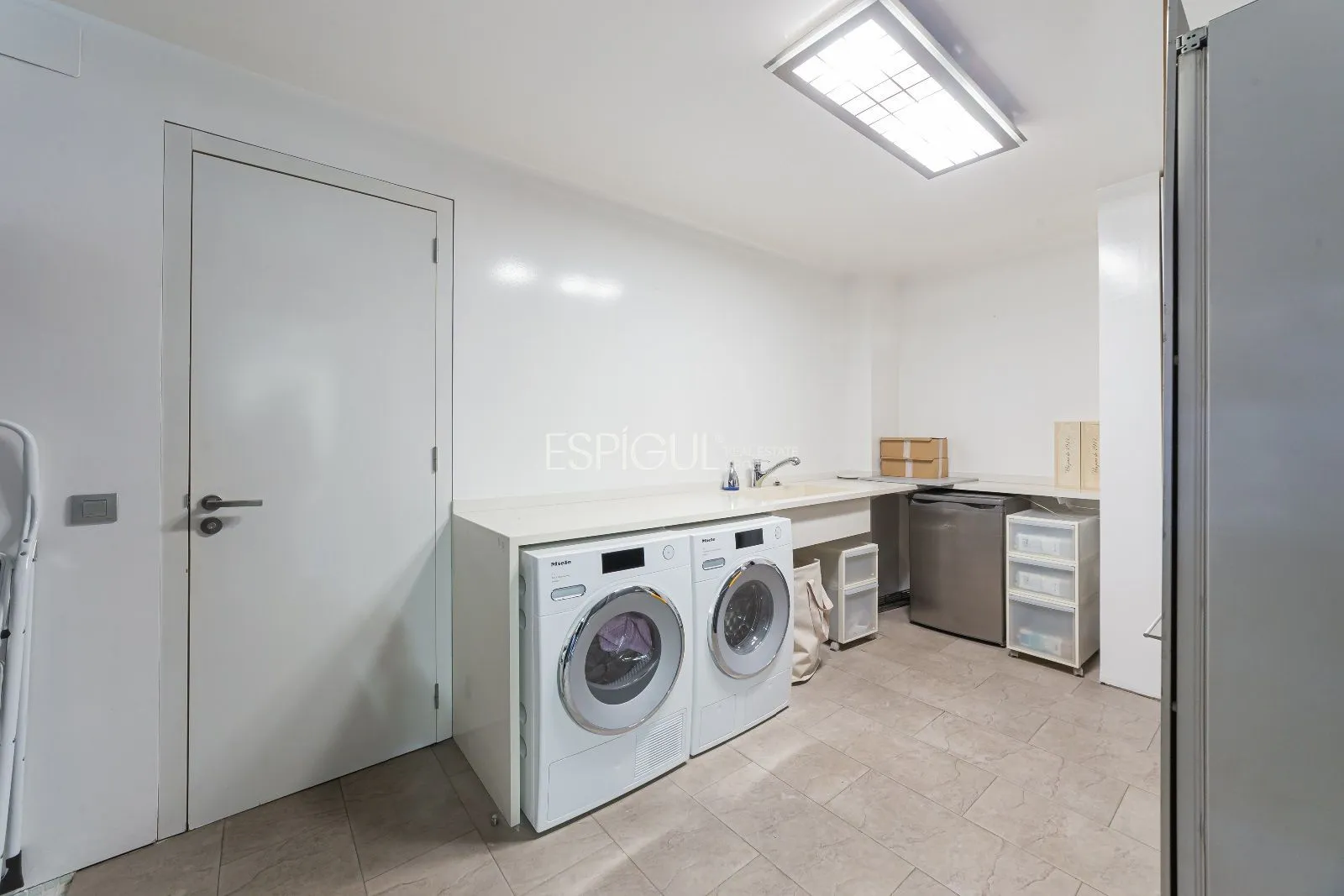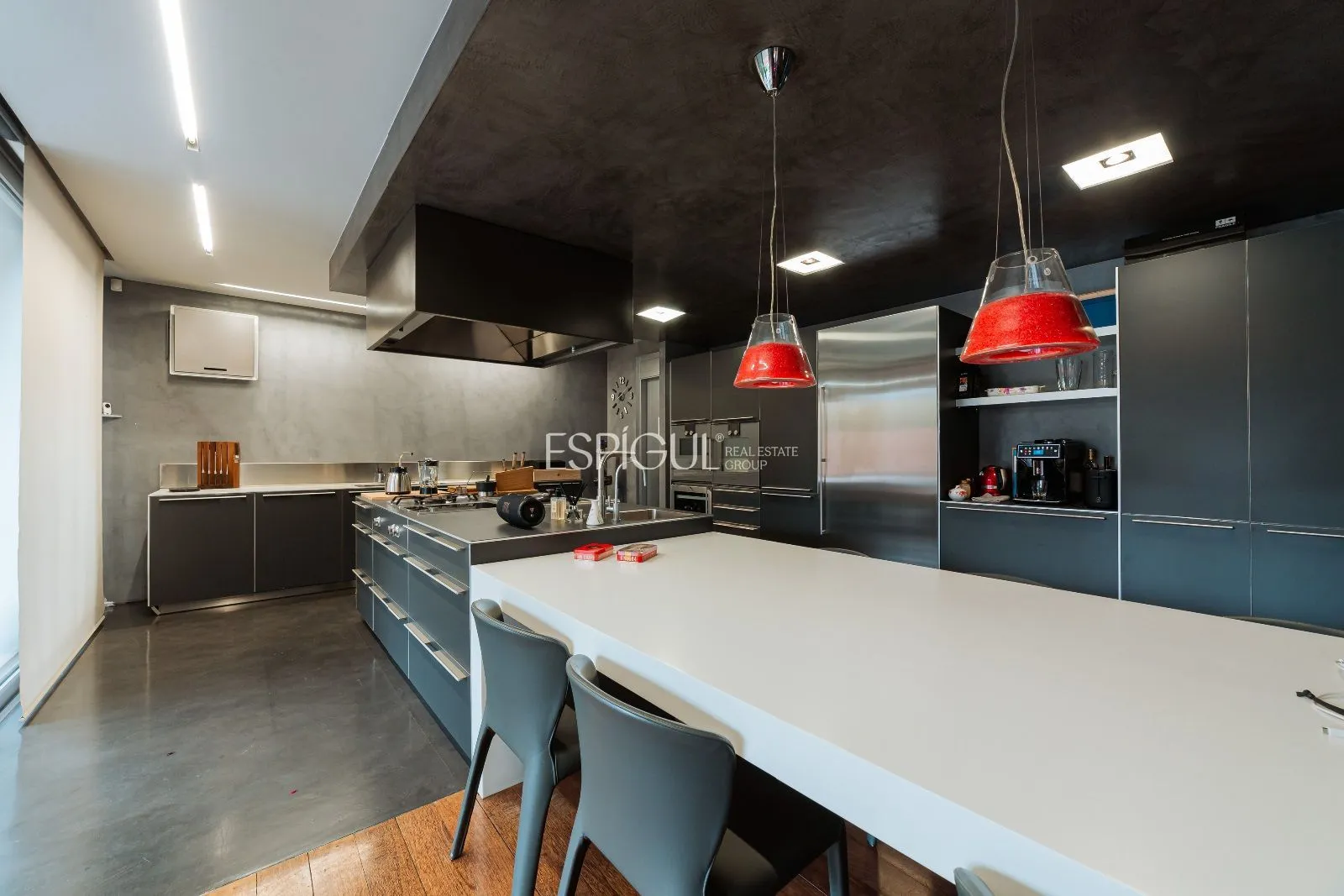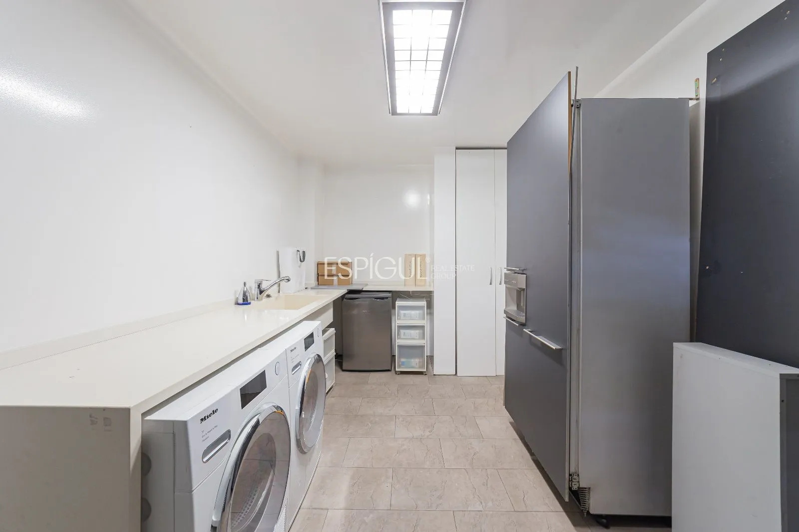 La primera planta disposa d’una gran sala d’estar amb menjador i una altra majestuosa cuina amb illa central, safareig i habitació de servei amb bany propi i un lavabo. Una gran illa central que domina l’espai de la cuina, prolongant-se amb una taula blanca. La cuina està equipada amb mobiliari de Bulthaup, campana d’extracció d’Altex, electrodomèstics Gaggenau i llum Fontana Arte. Els terres combinen microciment gris amb fusta natural diversificant en zones i usos. Ambdues estances adquireixen una excel·lent il·luminació natural i projecten l’interior cap a l’exterior. La gran amplitud de la casa que genera aquesta projecció es materialitza a la sala d’estar que es converteix en la zona de piscina climatitzada a l’exterior, mentre que la projecció de la cuina es converteix en el gran porxo exterior d’estructura de fusta que es mostra com a avantsala del jardí privat. Aquest porxo de fusta dona servei a la sala d’estar, menjador i cuina i es converteix en l’avantsala de la resta de jardí.