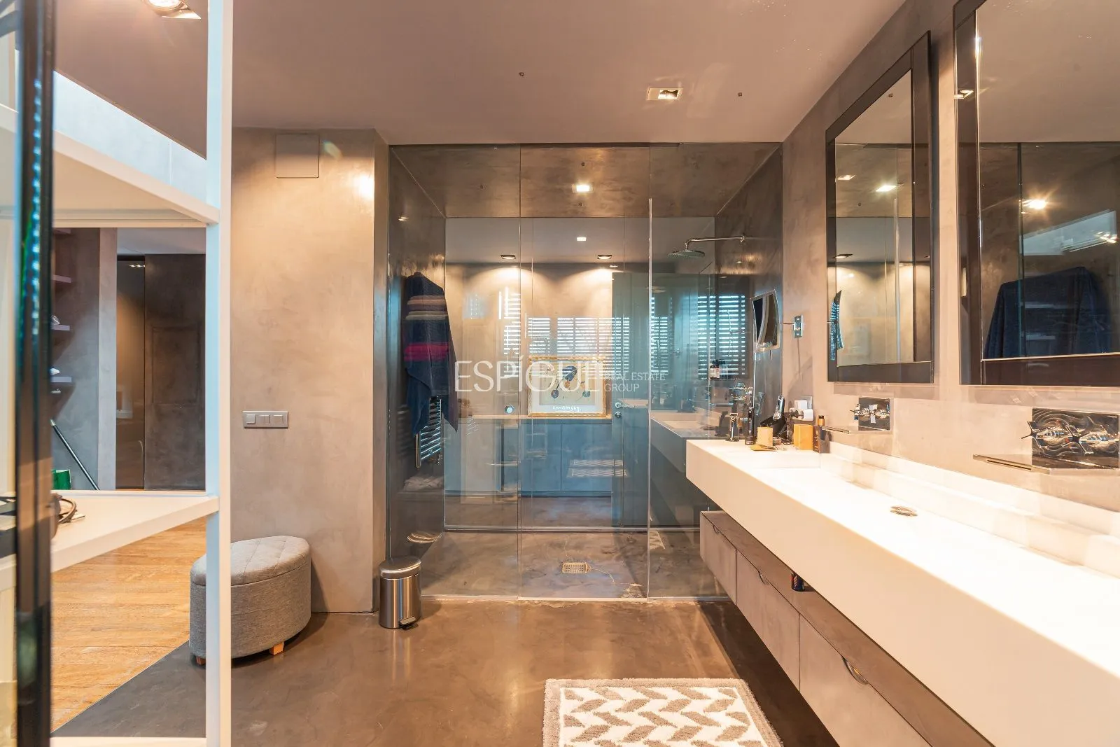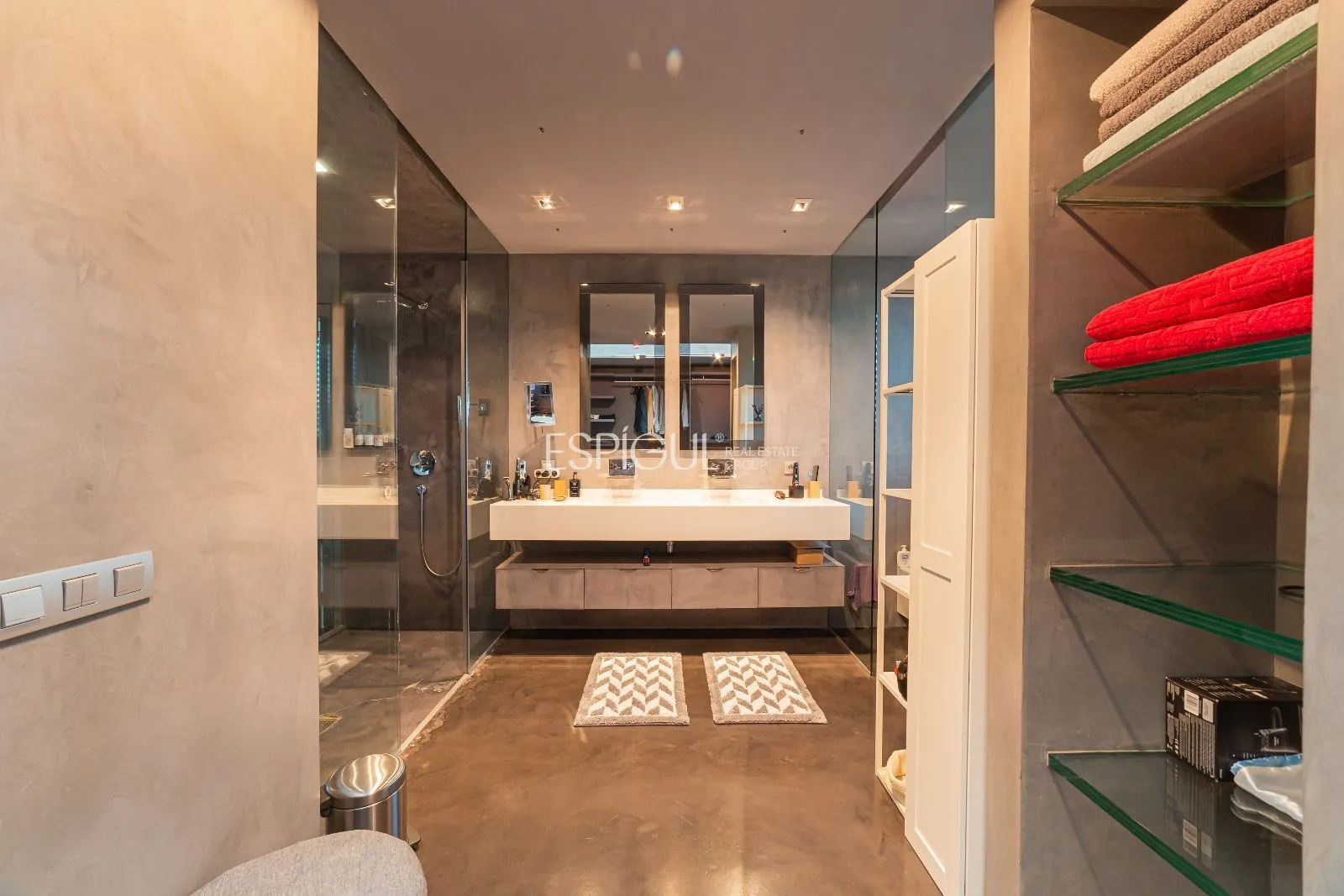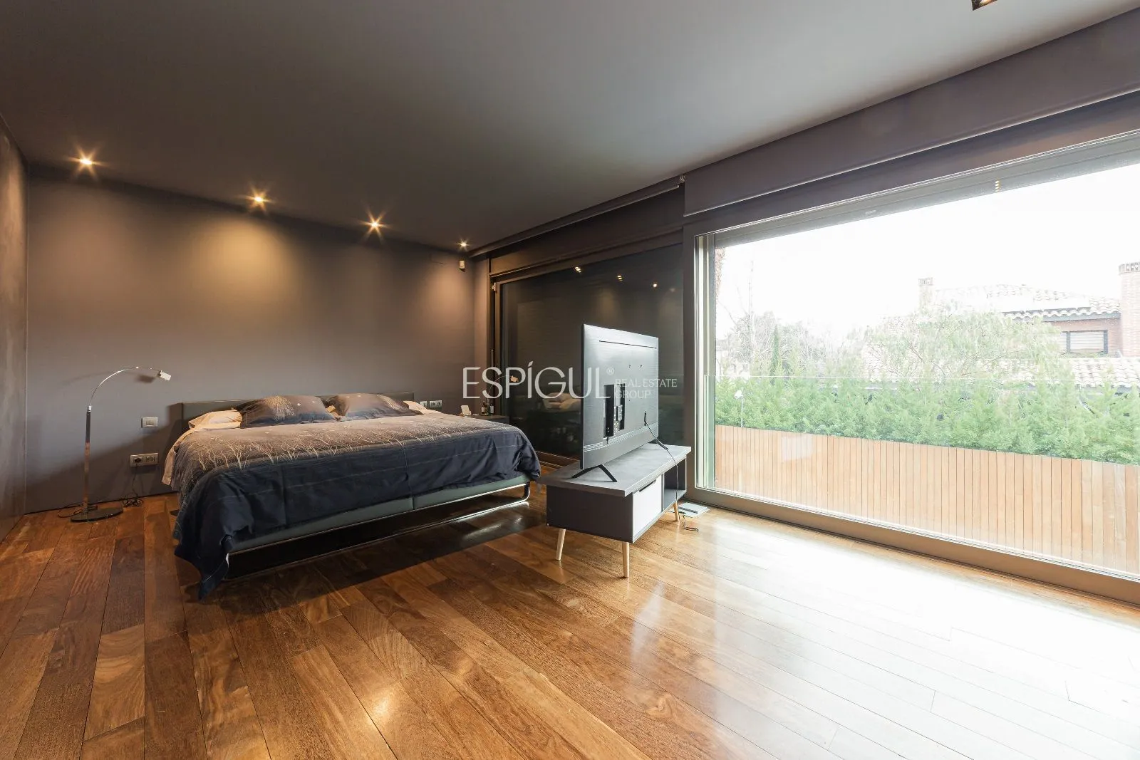 A la segona planta trobem 4 habitacions suite més. La màster suite disposa d’un ampli vestidor amb entrada de llum natural amb mobiliari Cassina i bany amb diversos tancaments de vidre laminat transparent. Disposa del lavabo realitzat amb una peça sencera de marbre, aixetes de paret de Ritmonio amb aigua en cascada i acabats de microciment, vàters suspesos de Starck per a Duravit i dutxa Starck Hansgrohe amb termòstat encastat. Tres dormitoris suite amb armaris encastats i grans finestrals amb vistes al jardí i piscina amb accés a una àmplia terrassa.