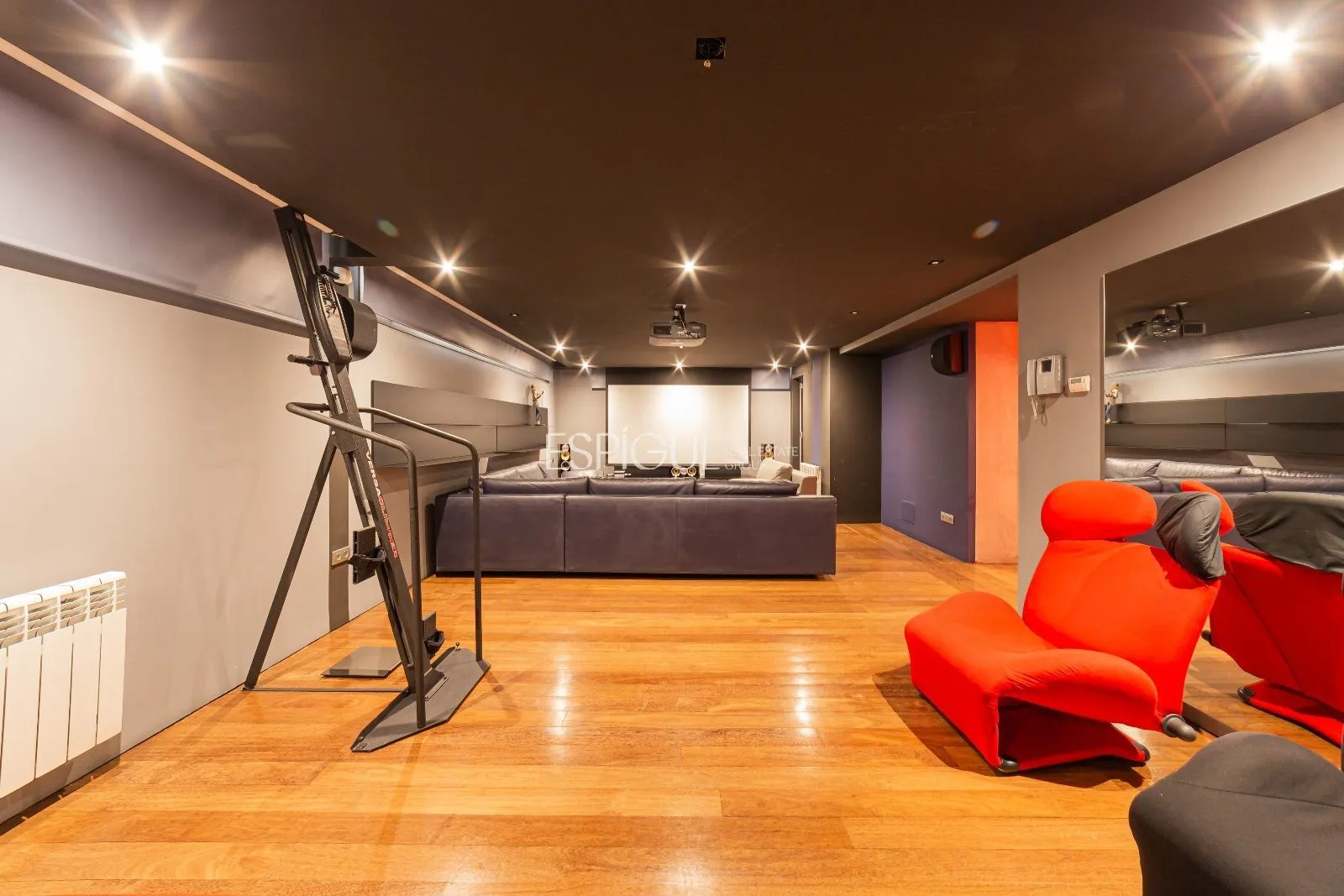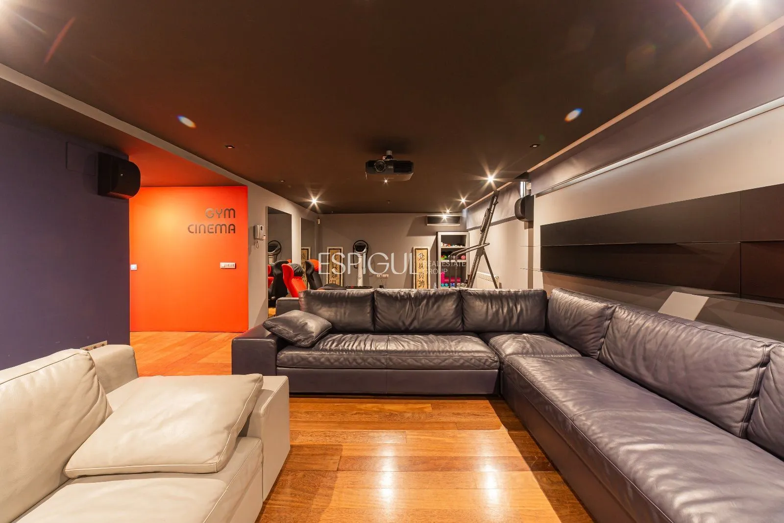La planta baixa, de forma rectangular, conté una sala de cinema totalment equipada amb pantalla de plasma TV TX65, projector 3D Panasonic i equip de so envoltant de Bowers & Wilkins model CM, gimnàs totalment equipat, una biblioteca i despatx, un bany. Ampli garatge per a 3 cotxes, sala de màquines, sala polivalent amb accés directe al jardí i àmplia zona d’armaris.