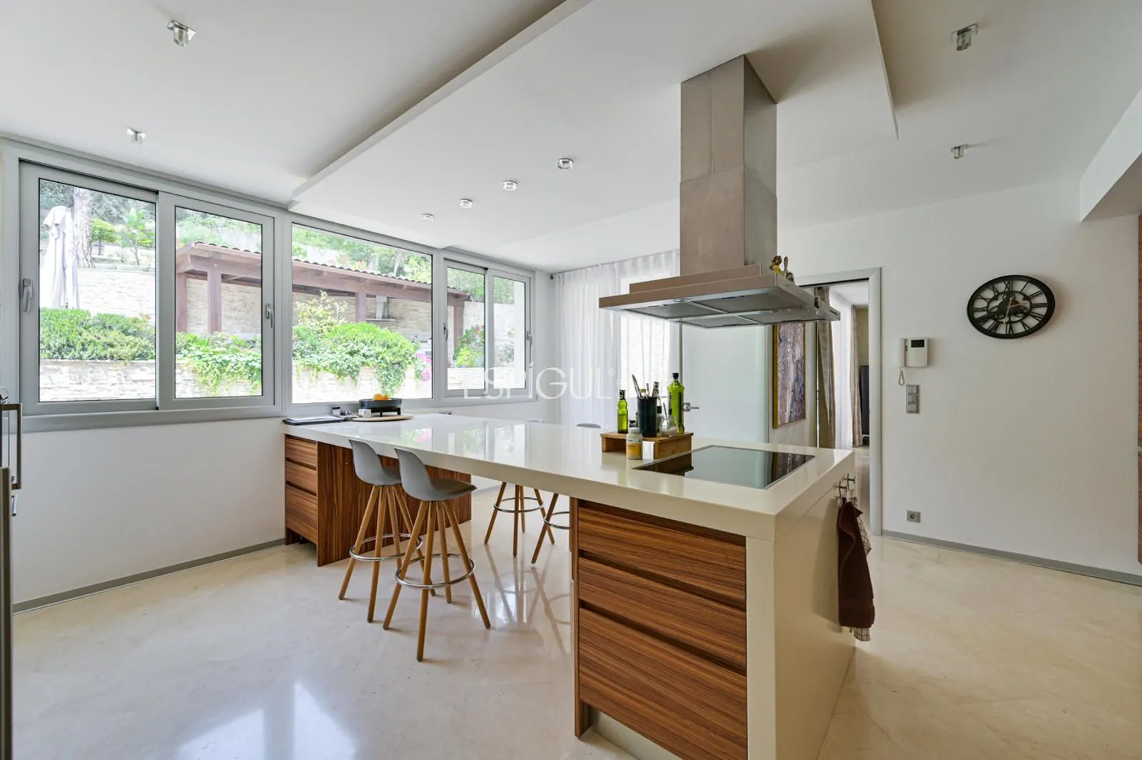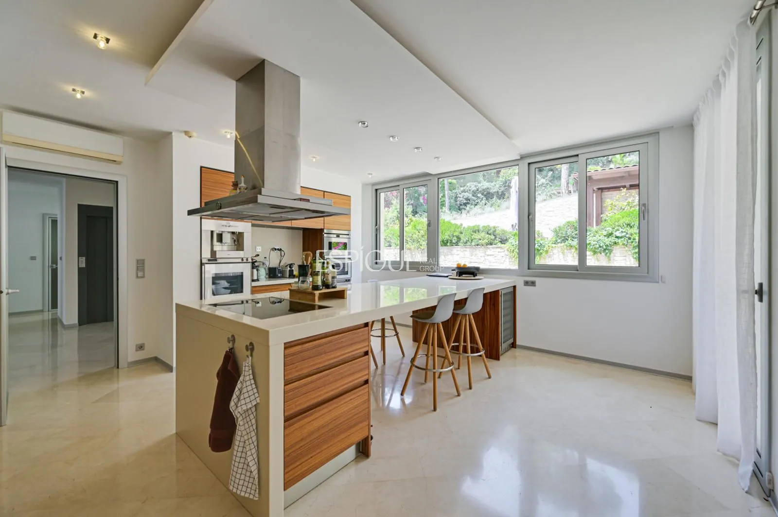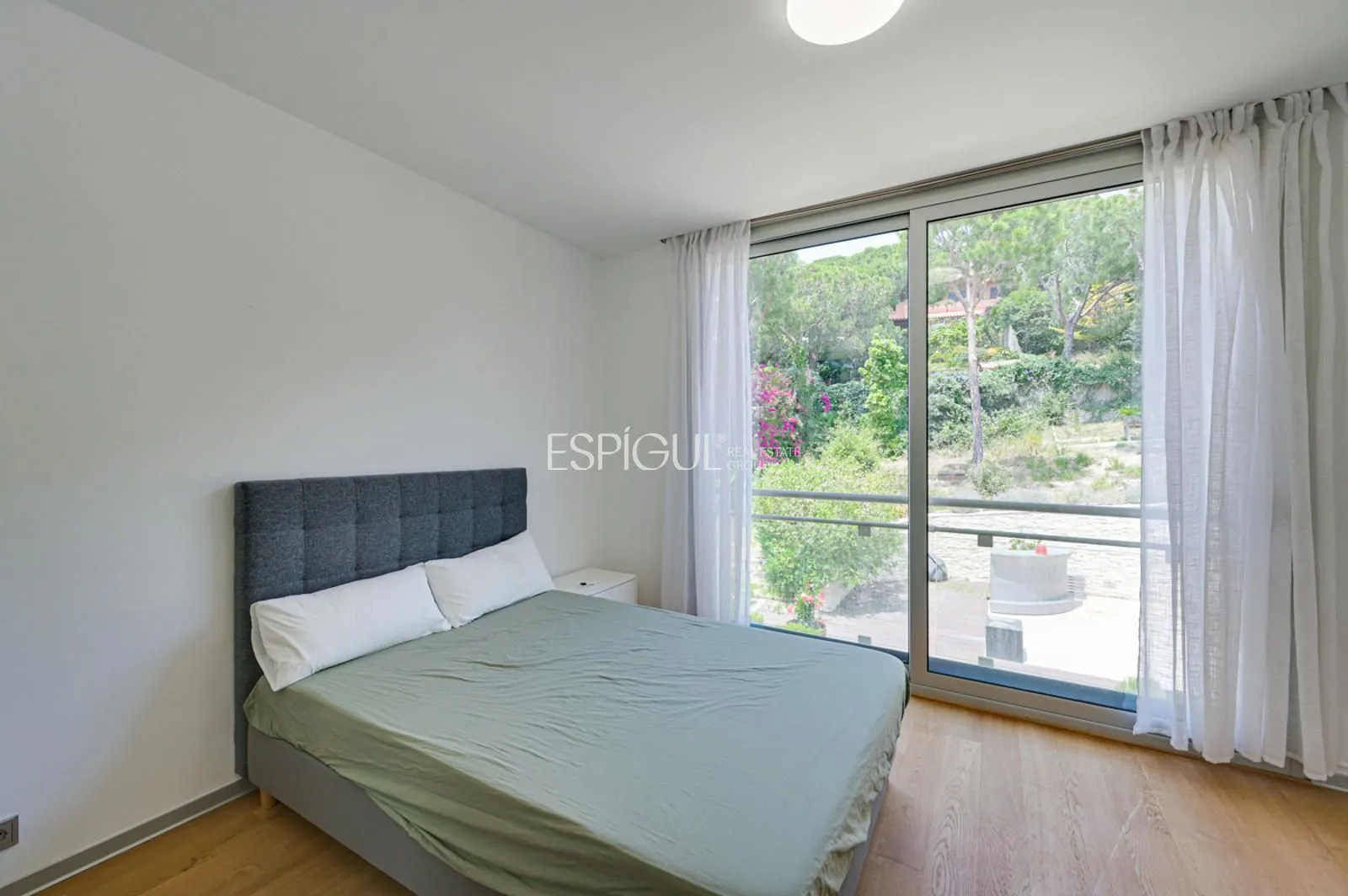 Accedim a l’habitatge a través d’un elegant rebedor que dona pas a un impressionant saló-menjador amb grans finestrals que integren l’interior amb el jardí, permetent gaudir de les vistes des de qualsevol angle. La cuina, de grans dimensions i completament equipada amb electrodomèstics d’alta gamma, és perfecta tant per al dia a dia com per organitzar reunions familiars o amb amics. Aquesta planta compta a més amb una habitació tipus suite ideal per a convidats o per a despatx, i una pràctica zona de bugaderia independent.