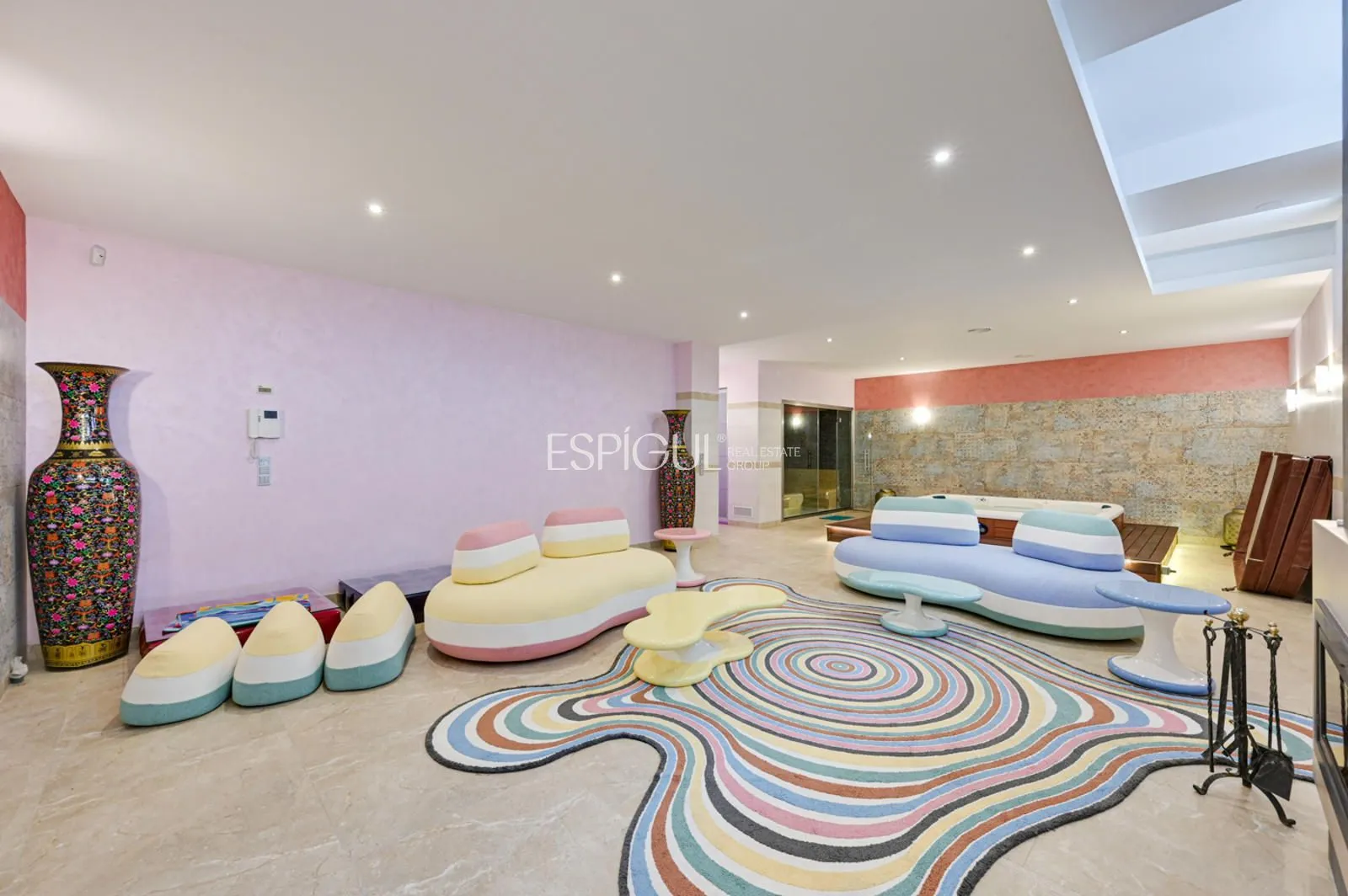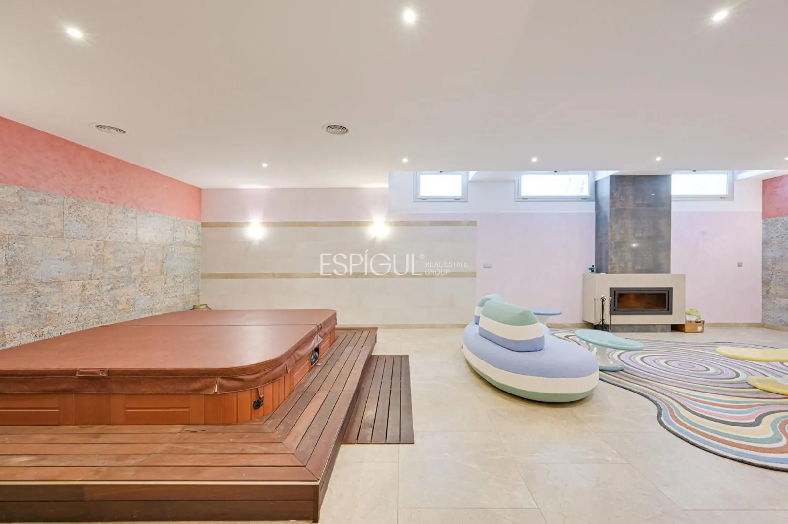 El soterrani és un altre dels grans atractius de la casa. Aquí trobem una elegant sala polivalent amb xemeneia, perfecta per a cinema a casa, reunions o zona de jocs, a més d’una exclusiva àrea wellness amb jacuzzi per a sis persones, sauna i bany complet. La planta es completa amb un ampli garatge amb capacitat per a fins a sis vehicles.