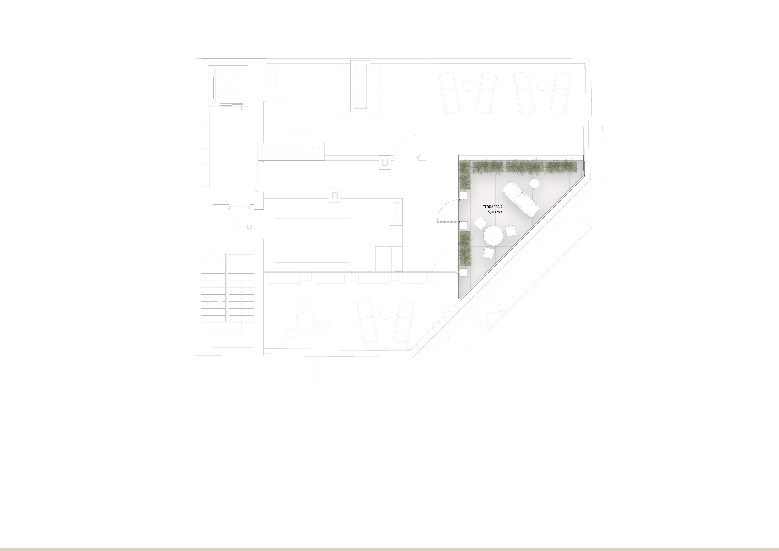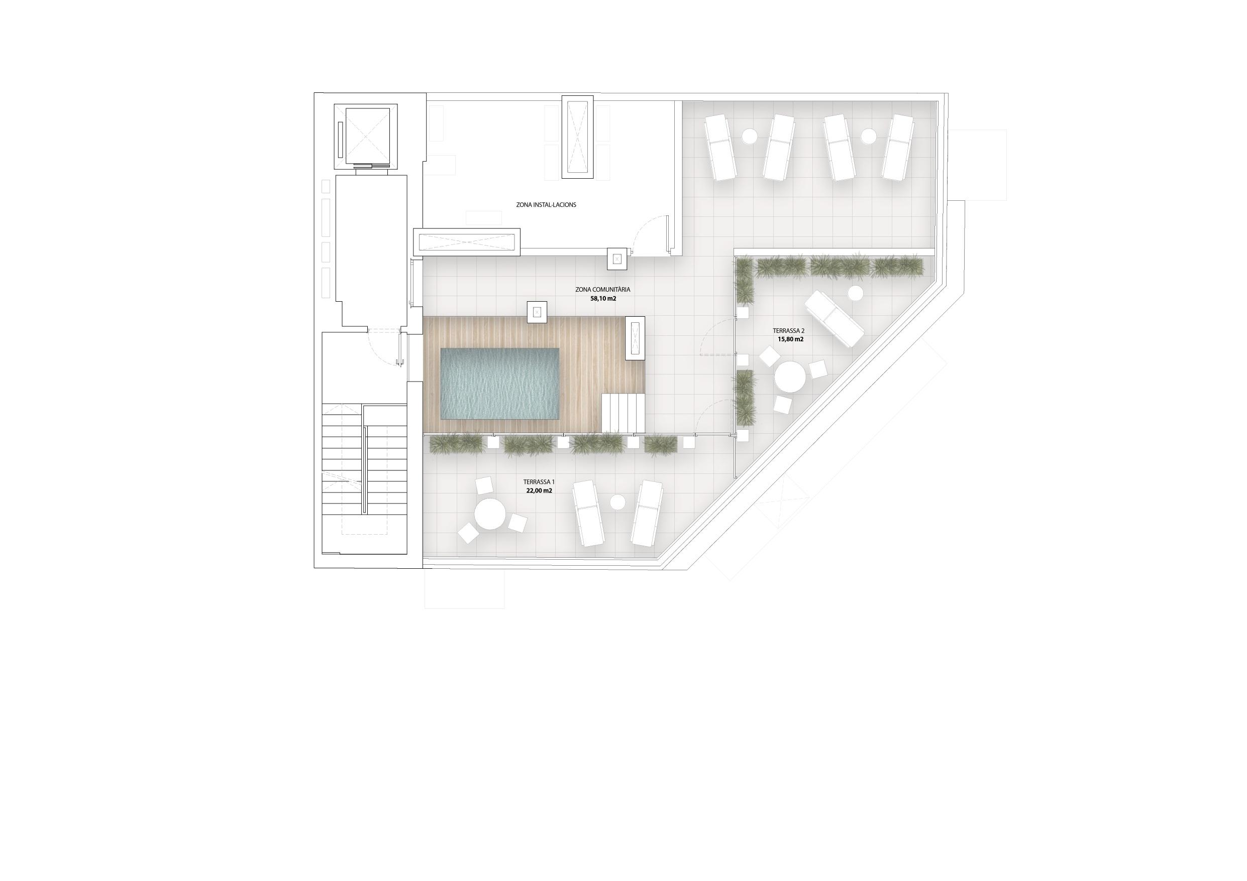 The top floor houses an exclusive penthouse with a private terrace, while the rooftop offers communal solarium and chill-out areas, with panoramic city views, ideal for relaxing and enjoying Barcelona’s sunny climate.