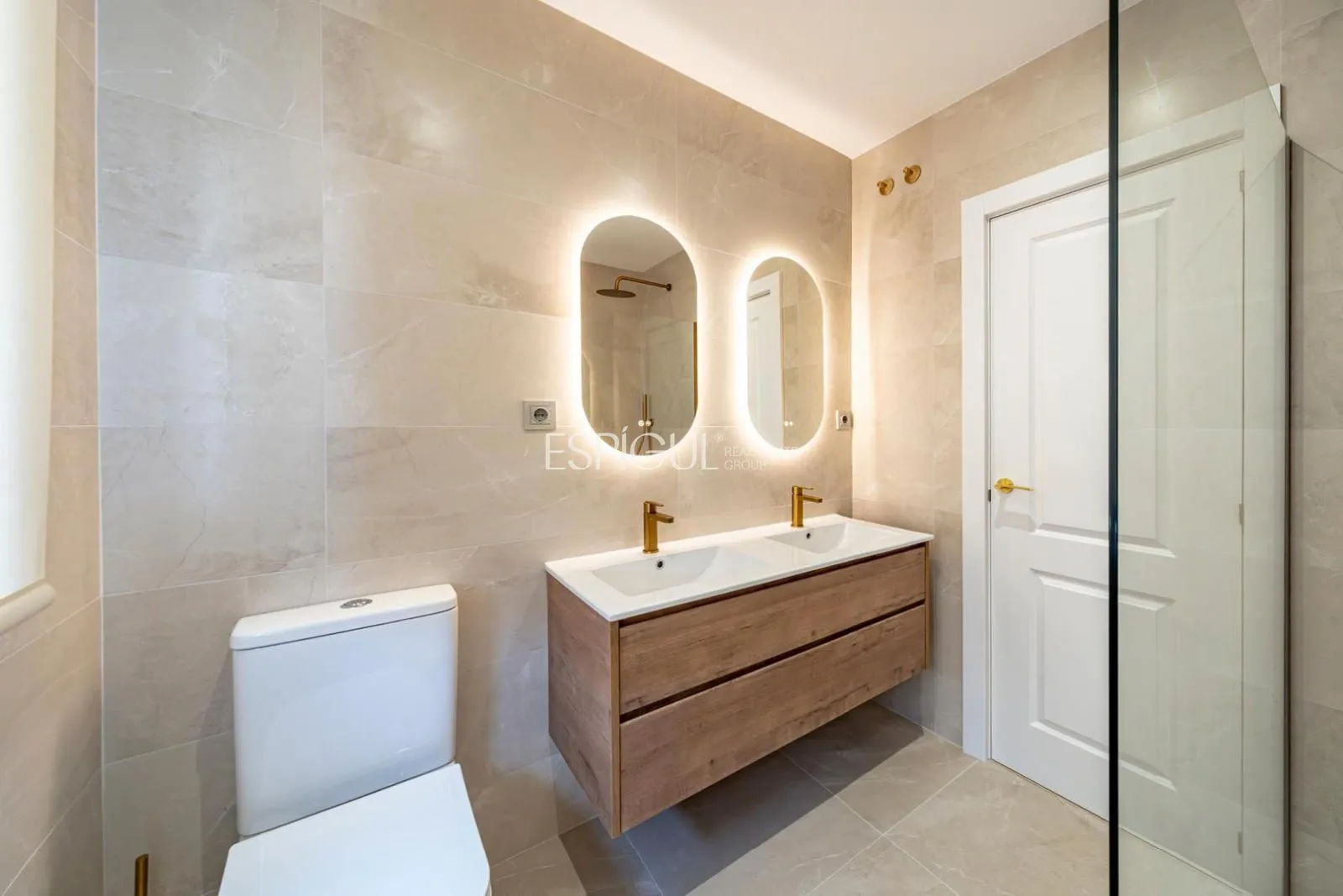 In terms of equipment, it incorporates centralized air conditioning with an Airzone system, which allows you to regulate the temperature of each room independently thanks to integrated home automation. The floors combine large-format porcelain tiles in bathrooms with a high-resistance oak-effect laminate flooring in the rest of the apartment. The PVC Unik exterior carpentry with Elegant Infinity Thermofibra profiles guarantees maximum thermal and acoustic insulation, reinforced by a thermal bridge break system and complete perimeter insulation.