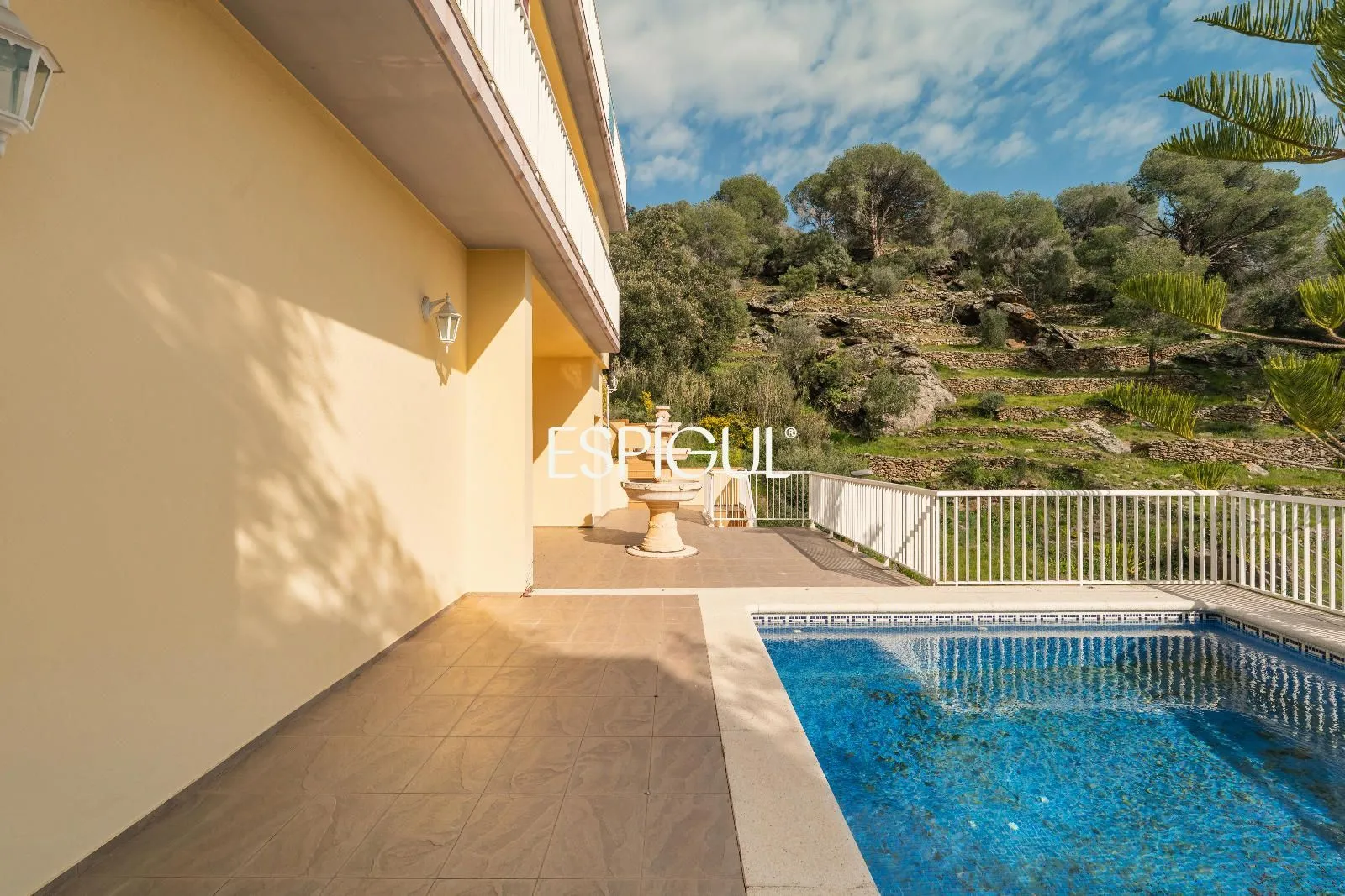 The outdoor area features spacious sunny terraces and a private pool, ideal for enjoying the Mediterranean climate, with direct access to the garden and spectacular views.