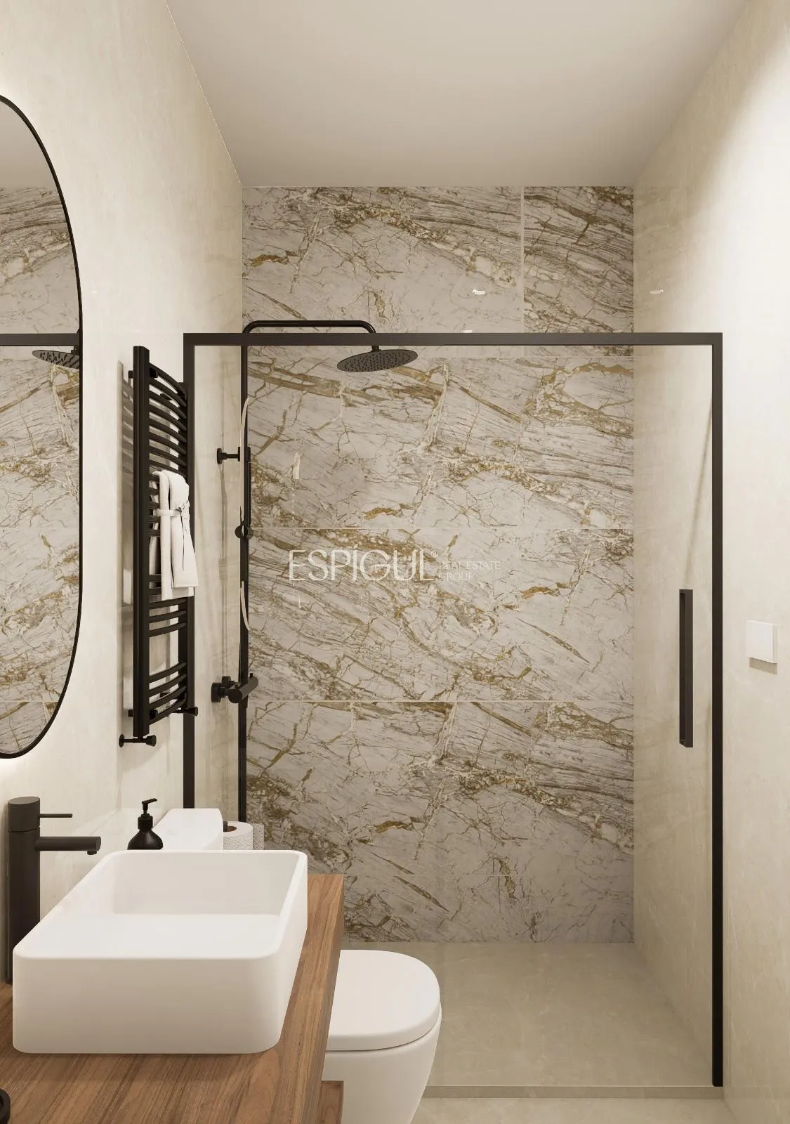 The interior design is based on the serenity of neutral tones and natural materials, achieving a warm and timeless atmosphere. The architectural details, careful lighting, and high-quality finishes add character and sophistication.