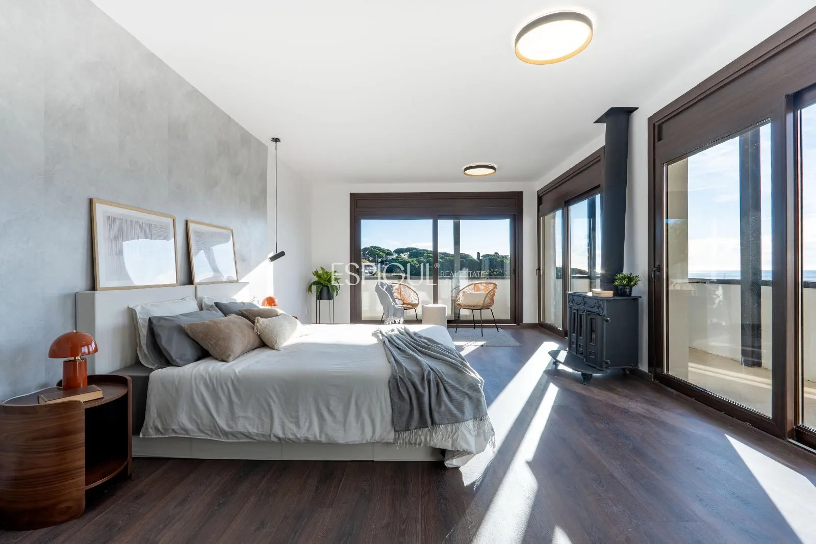 Completely renovated, the house has four bedrooms and four full bathrooms, including an exclusive master suite with a private terrace and panoramic views of the Mediterranean. The parquet floors, the fireplace in the living room, and the large windows bring light, warmth, and elegance to each room.