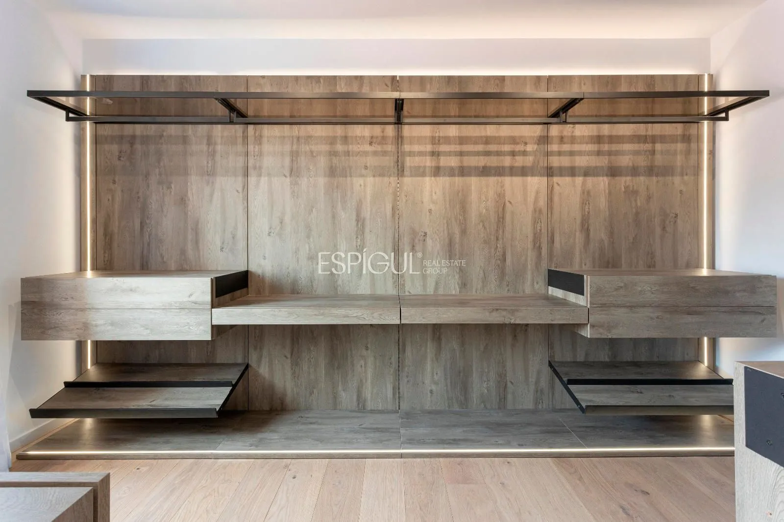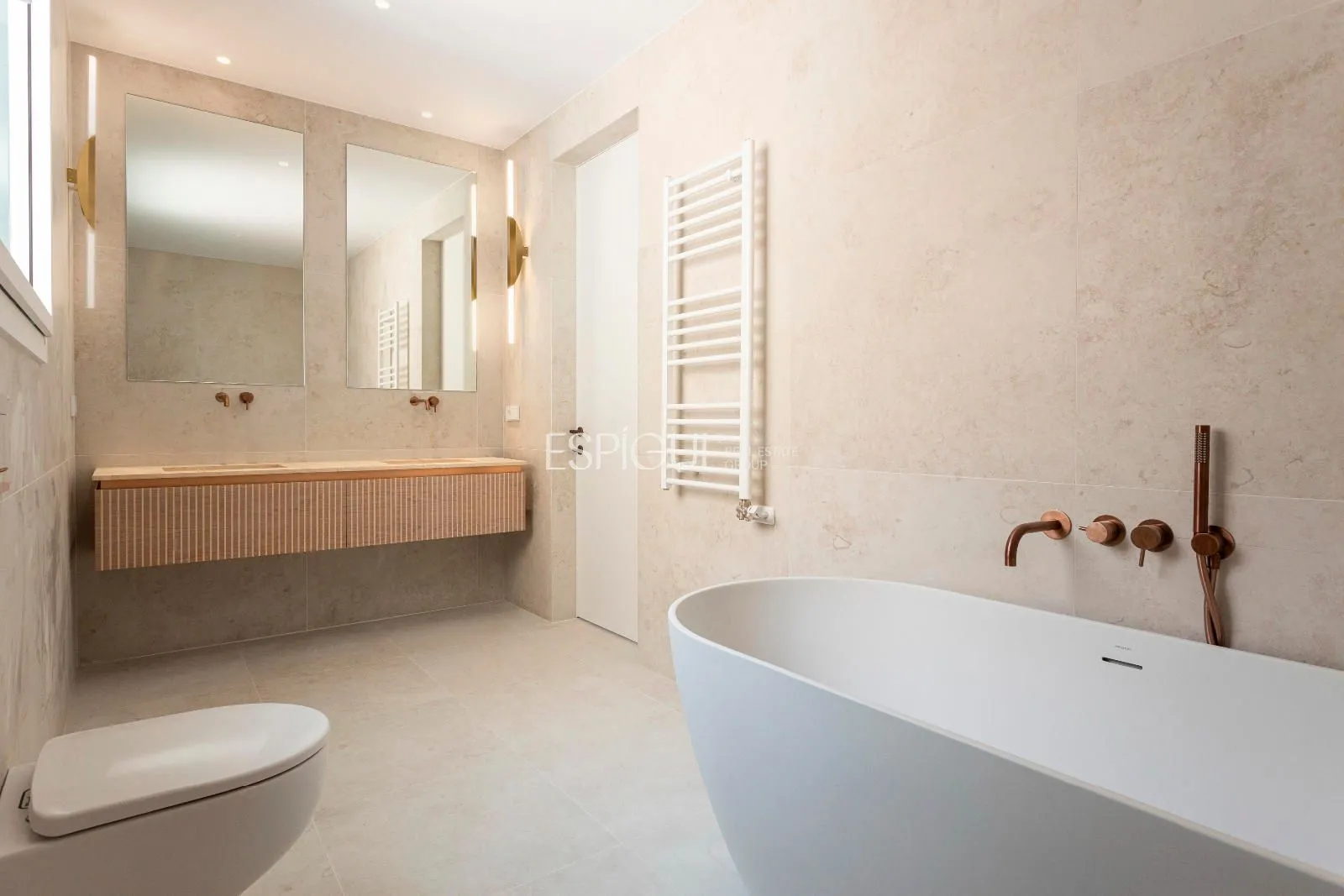 En la zona de noche se distribuyen tres dormitorios dobles con personalidades diferenciadas. La suite principal, de 45 m², cuenta con vestidor hecho a medida y baño en suite con bañera exenta y ducha de gran formato. El segundo dormitorio, también con baño propio, puede destinarse a despacho o invitados. El tercero dispone de baño independiente accesible desde el pasillo.