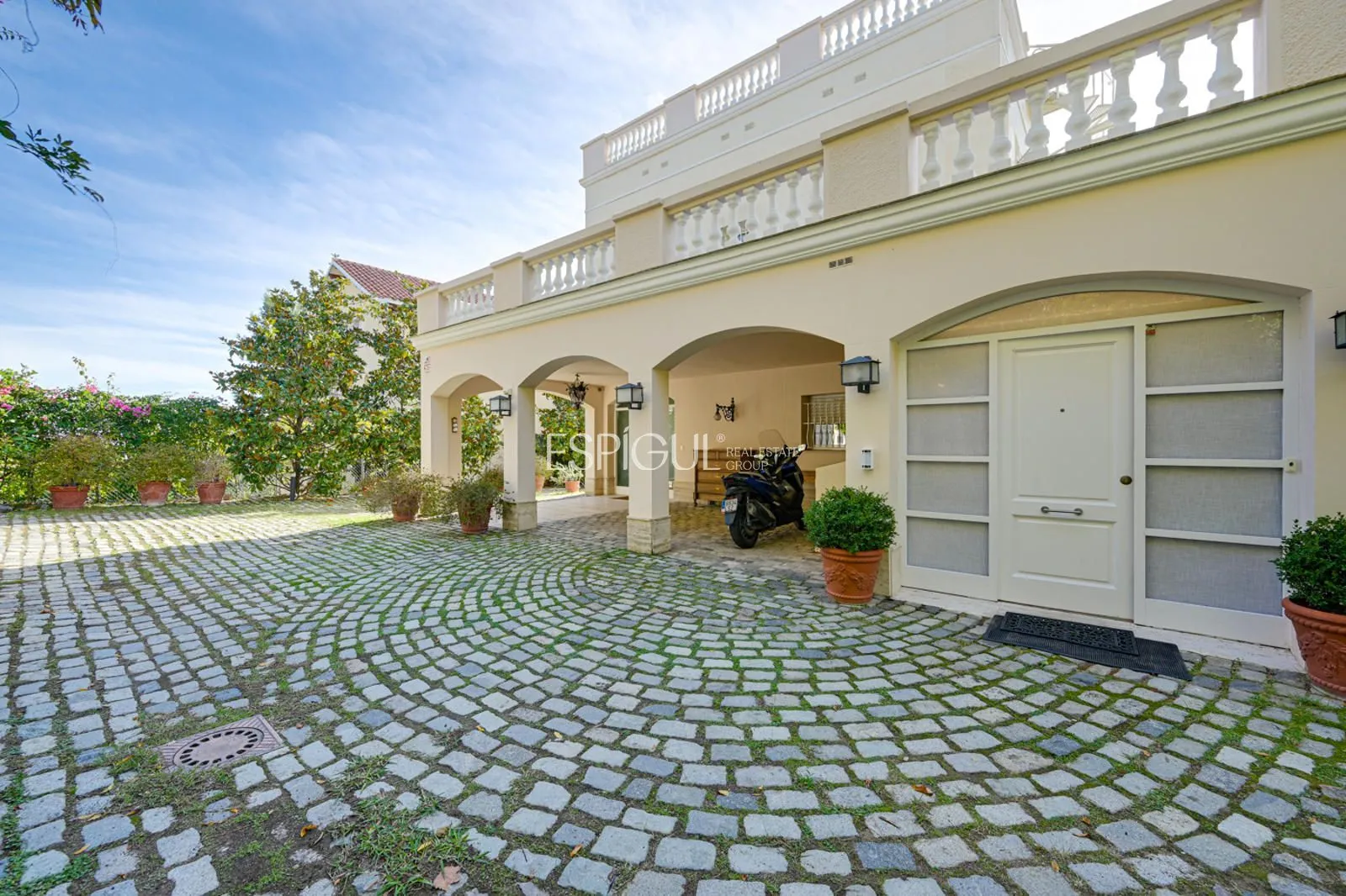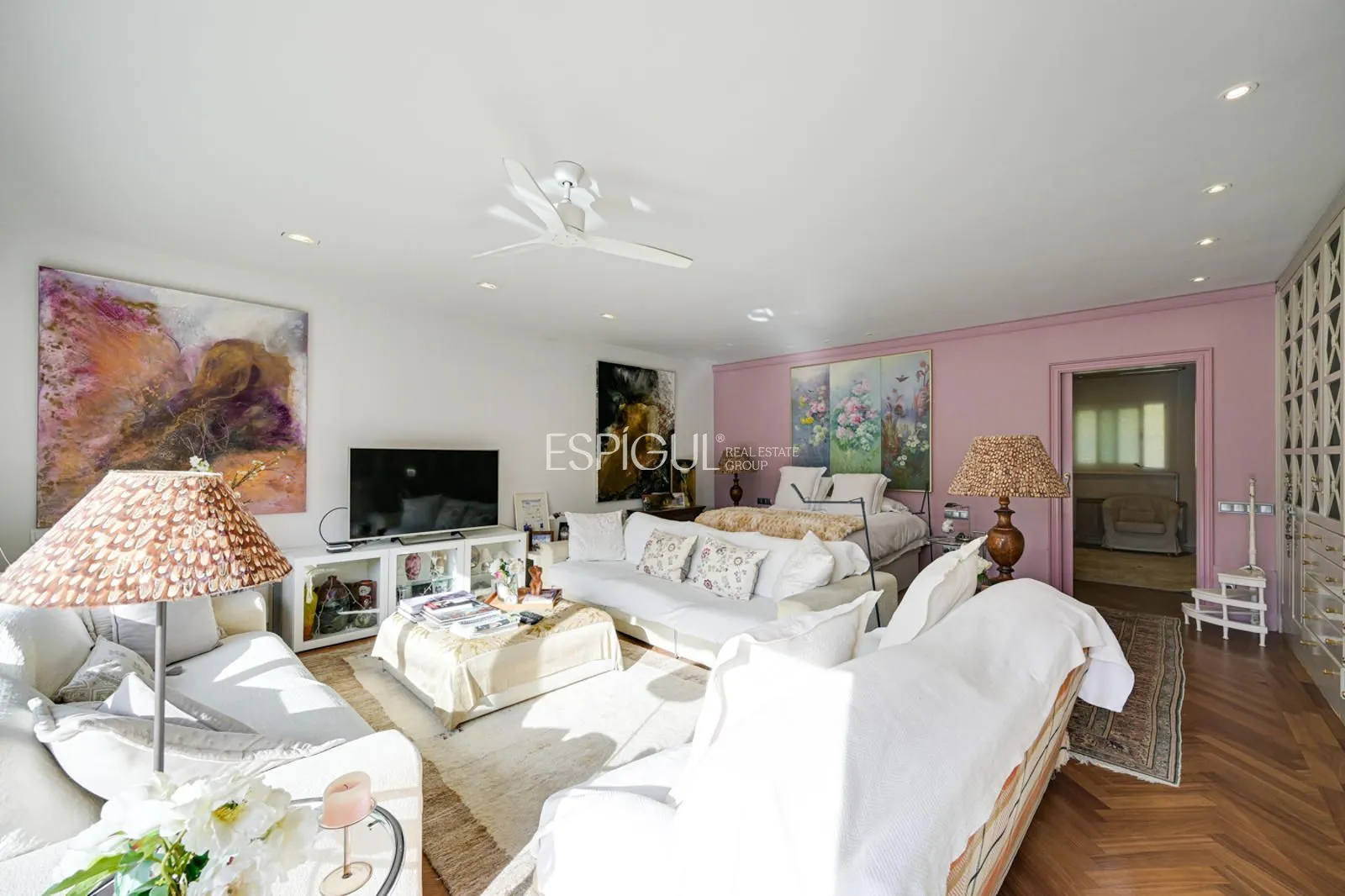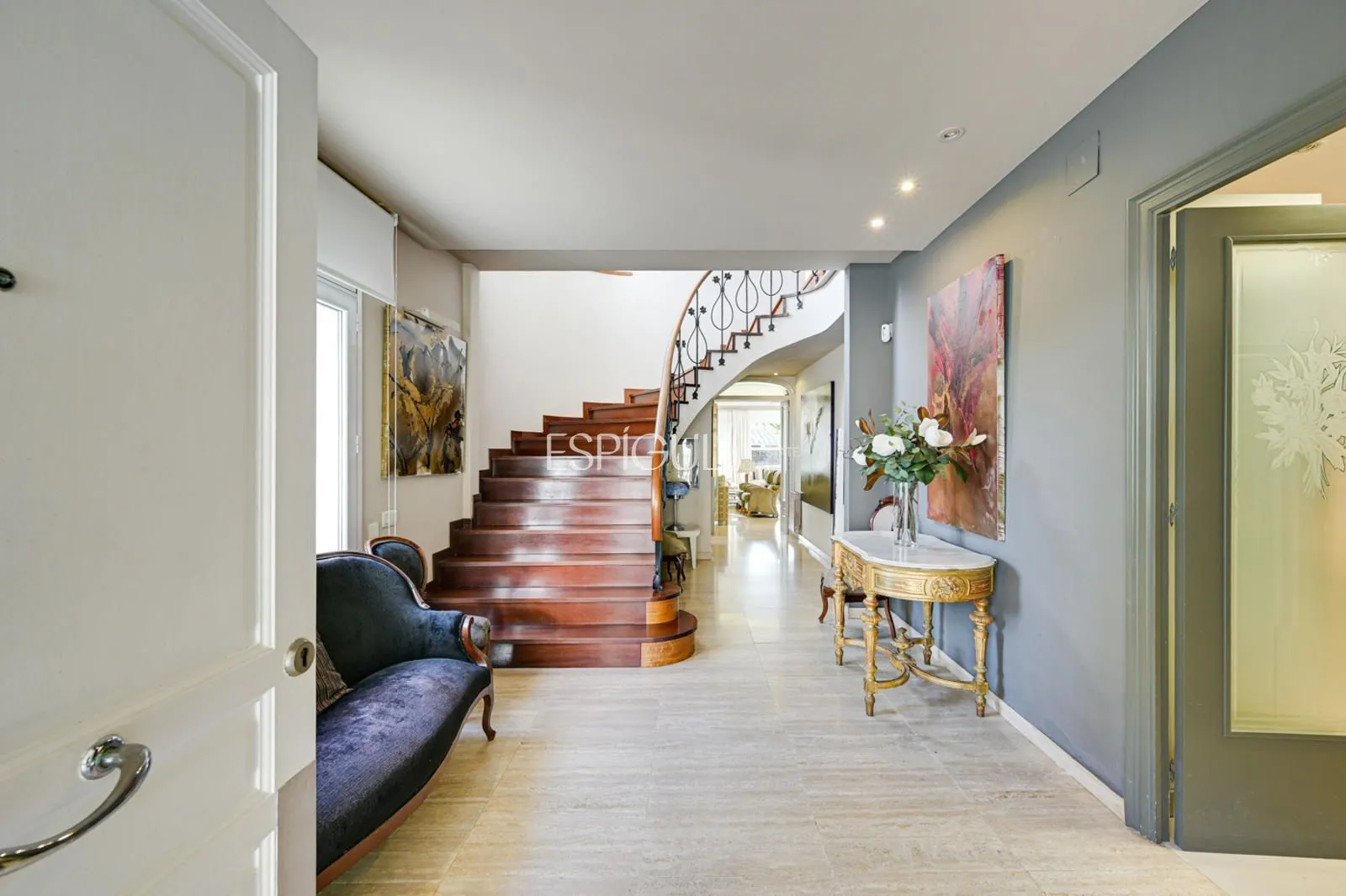 El exterior es un auténtico refugio privado: piscina, solárium, jardines de gran amplitud y un espacio de aparcamiento para hasta cinco vehículos.