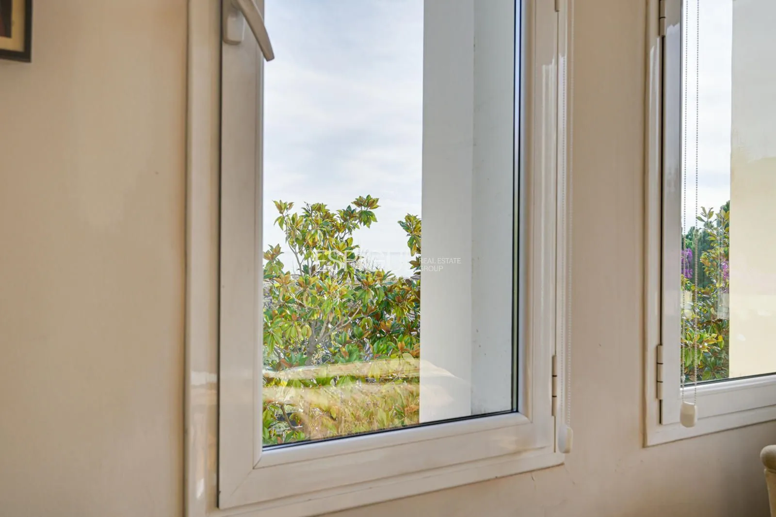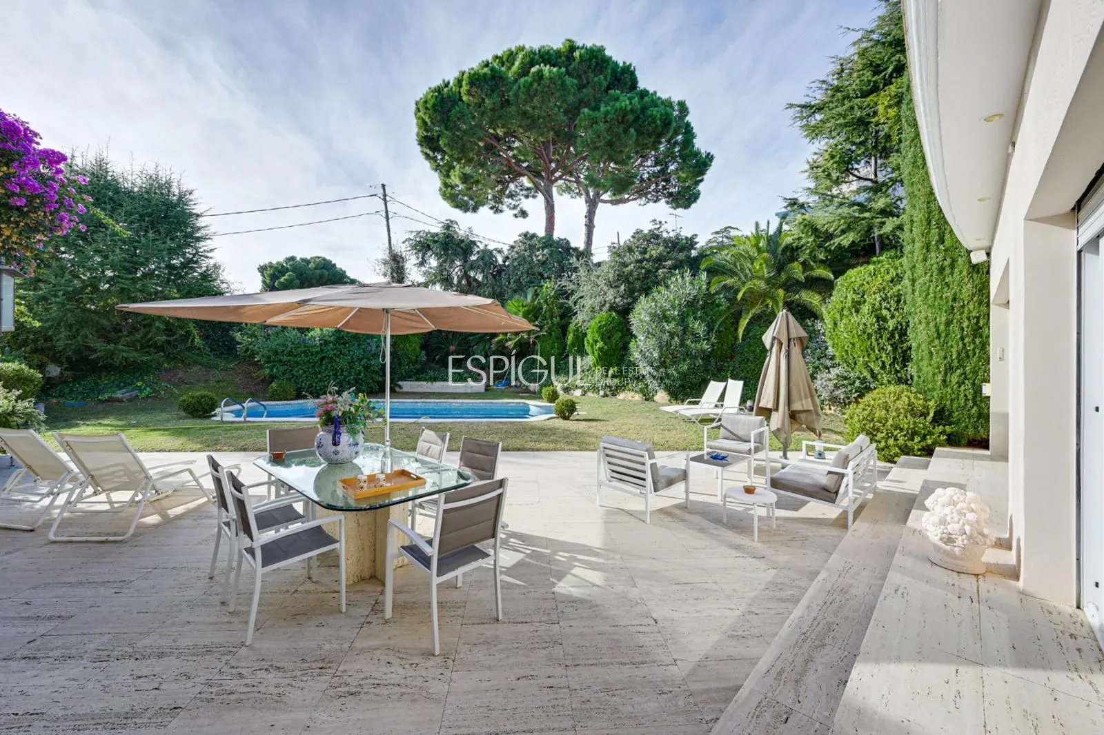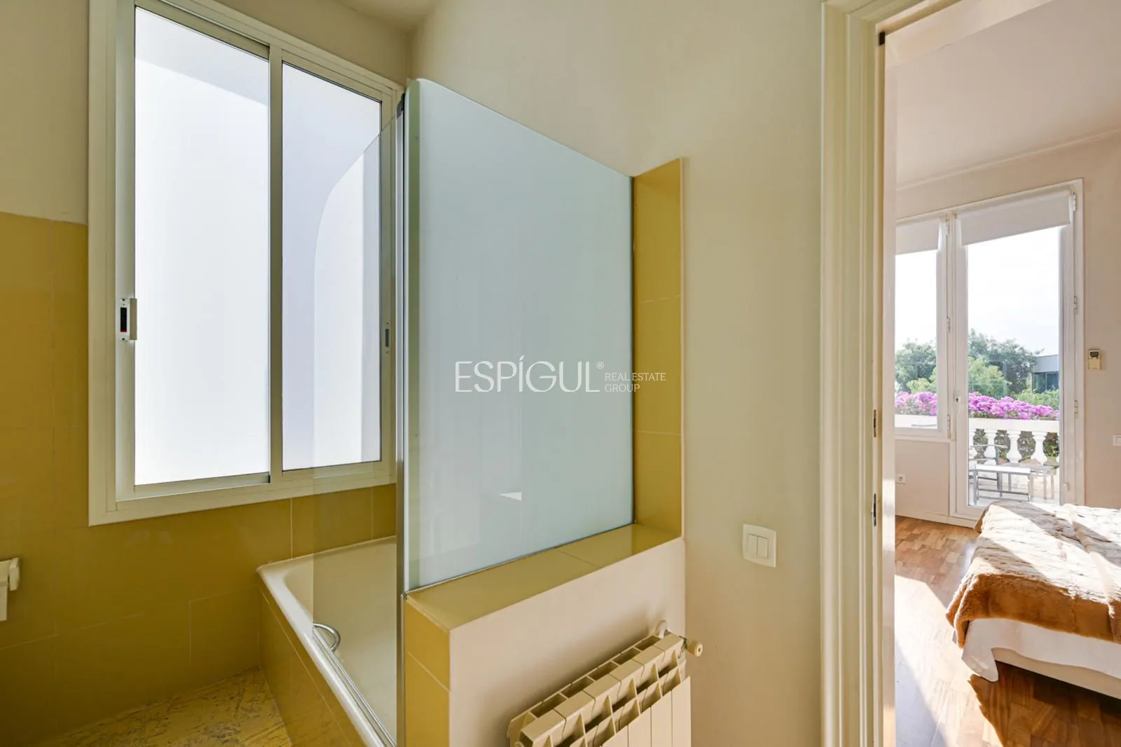 El exterior es un auténtico refugio privado: piscina, solárium, jardines de gran amplitud y un espacio de aparcamiento para hasta cinco vehículos.