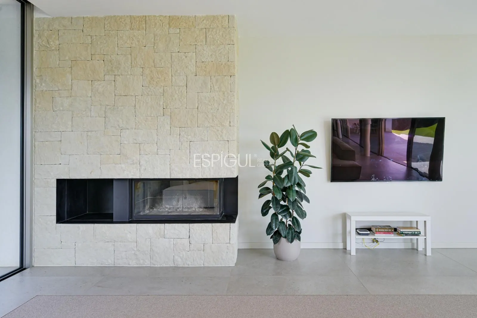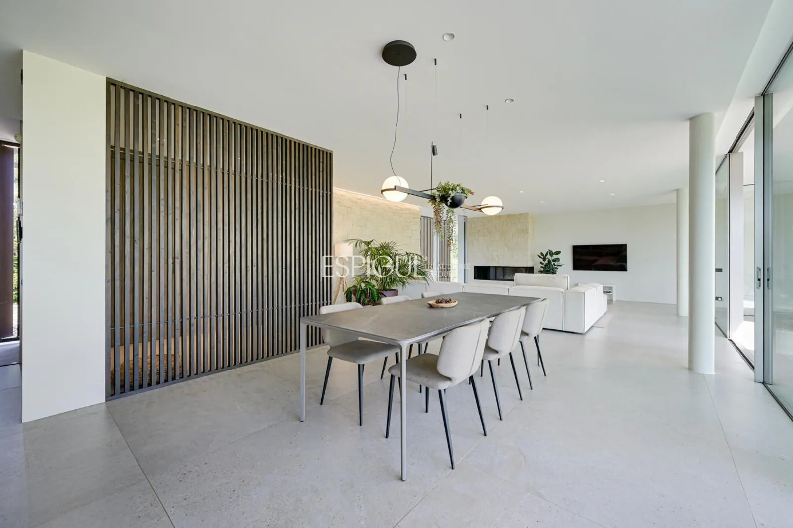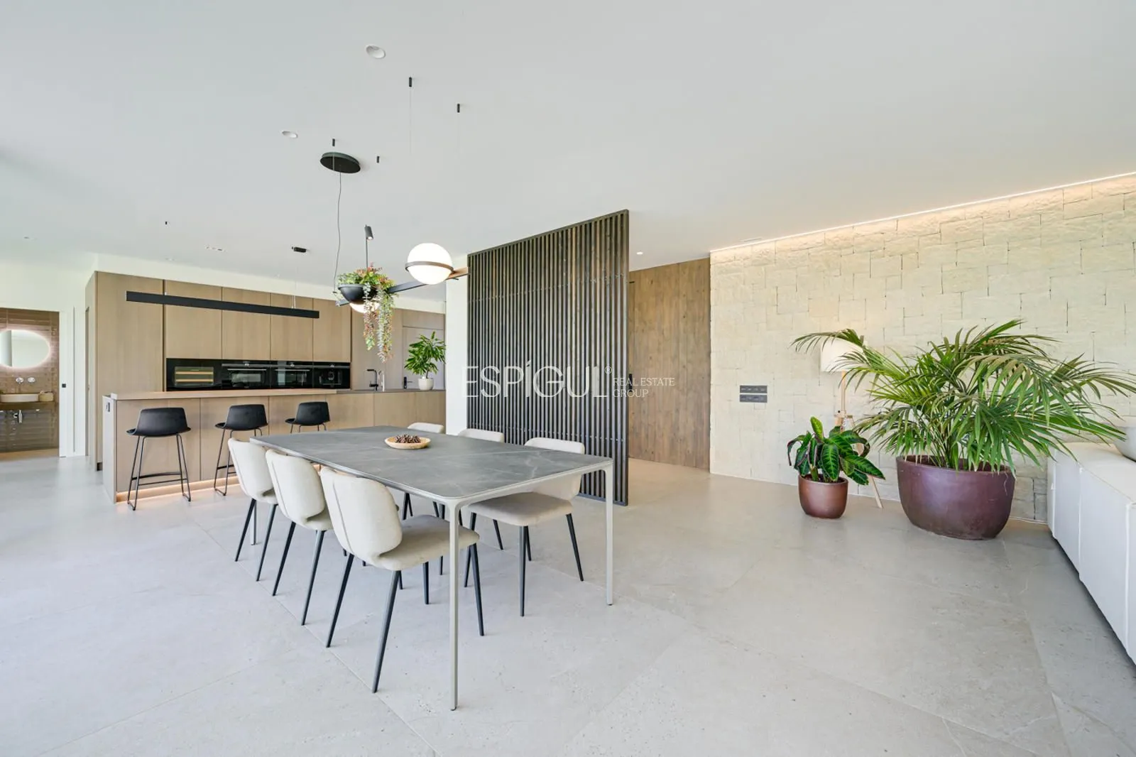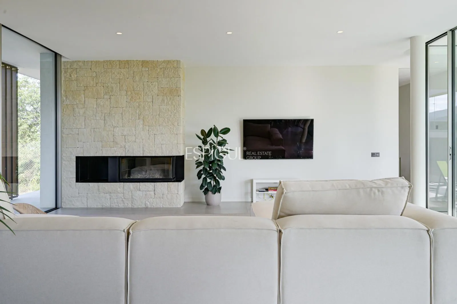 Al acceder a la villa, un amplio y luminoso vestíbulo conduce al elegante salón-comedor, inundado de luz natural gracias a sus grandes ventanales que enmarcan las impresionantes vistas. La moderna chimenea y los acabados de diseño crean un ambiente cálido y acogedor, ideal tanto para el descanso como para el entretenimiento.