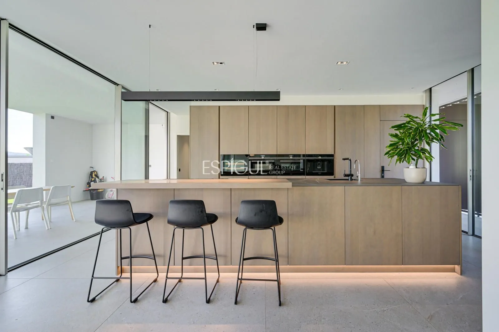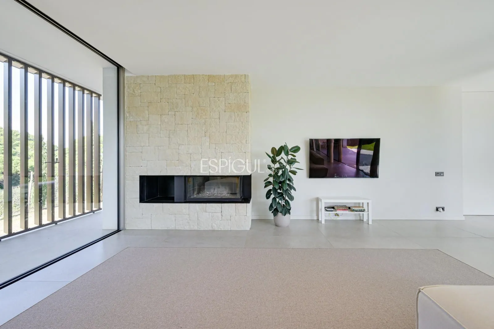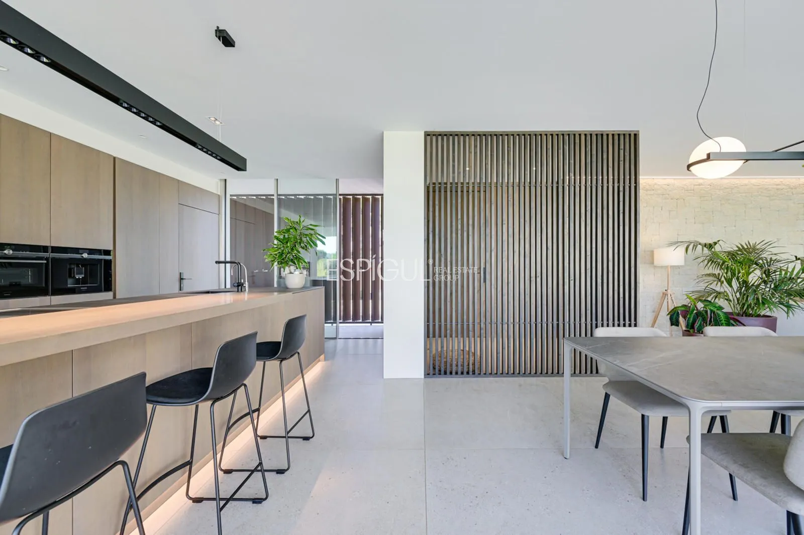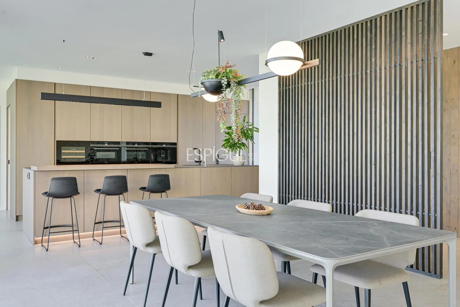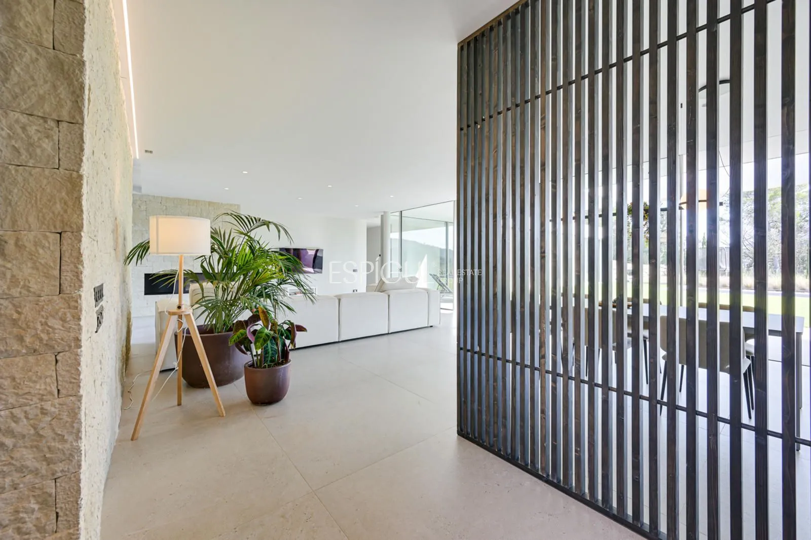 Al acceder a la villa, un amplio y luminoso vestíbulo conduce al elegante salón-comedor, inundado de luz natural gracias a sus grandes ventanales que enmarcan las impresionantes vistas. La moderna chimenea y los acabados de diseño crean un ambiente cálido y acogedor, ideal tanto para el descanso como para el entretenimiento.