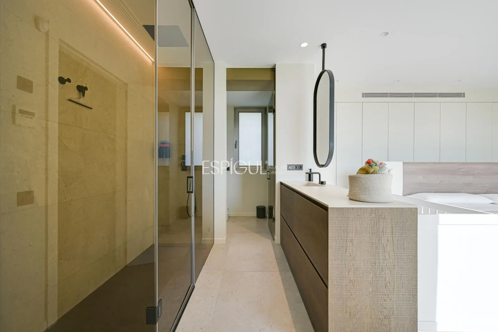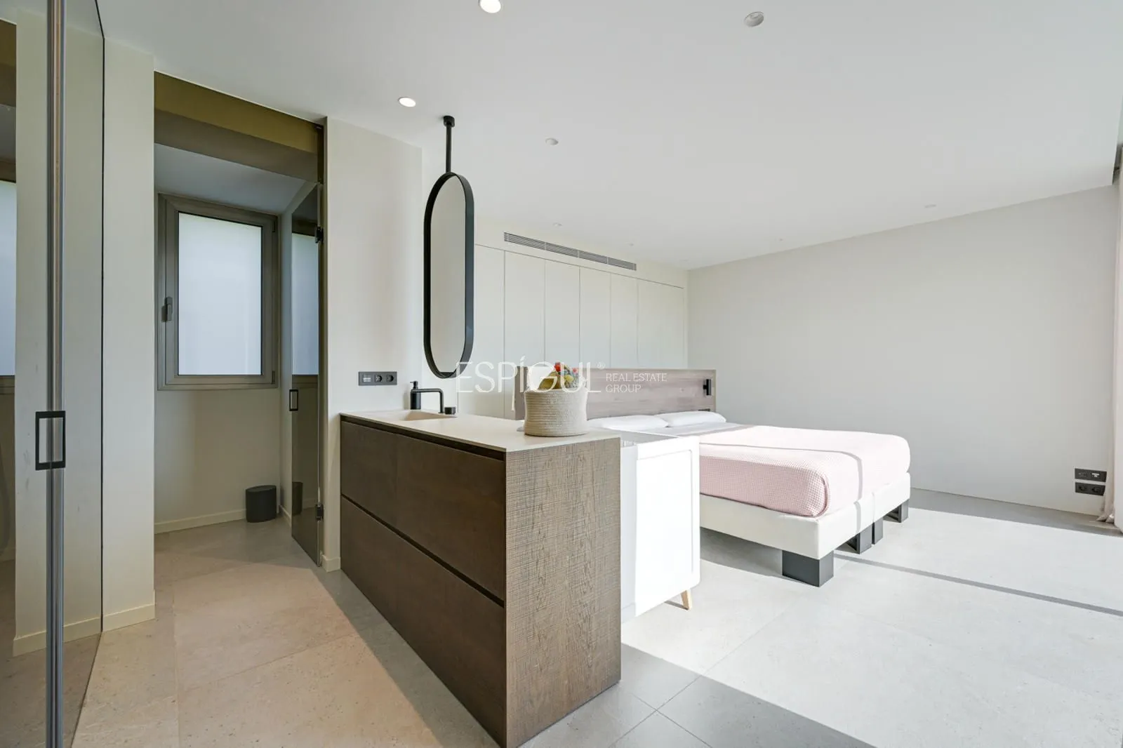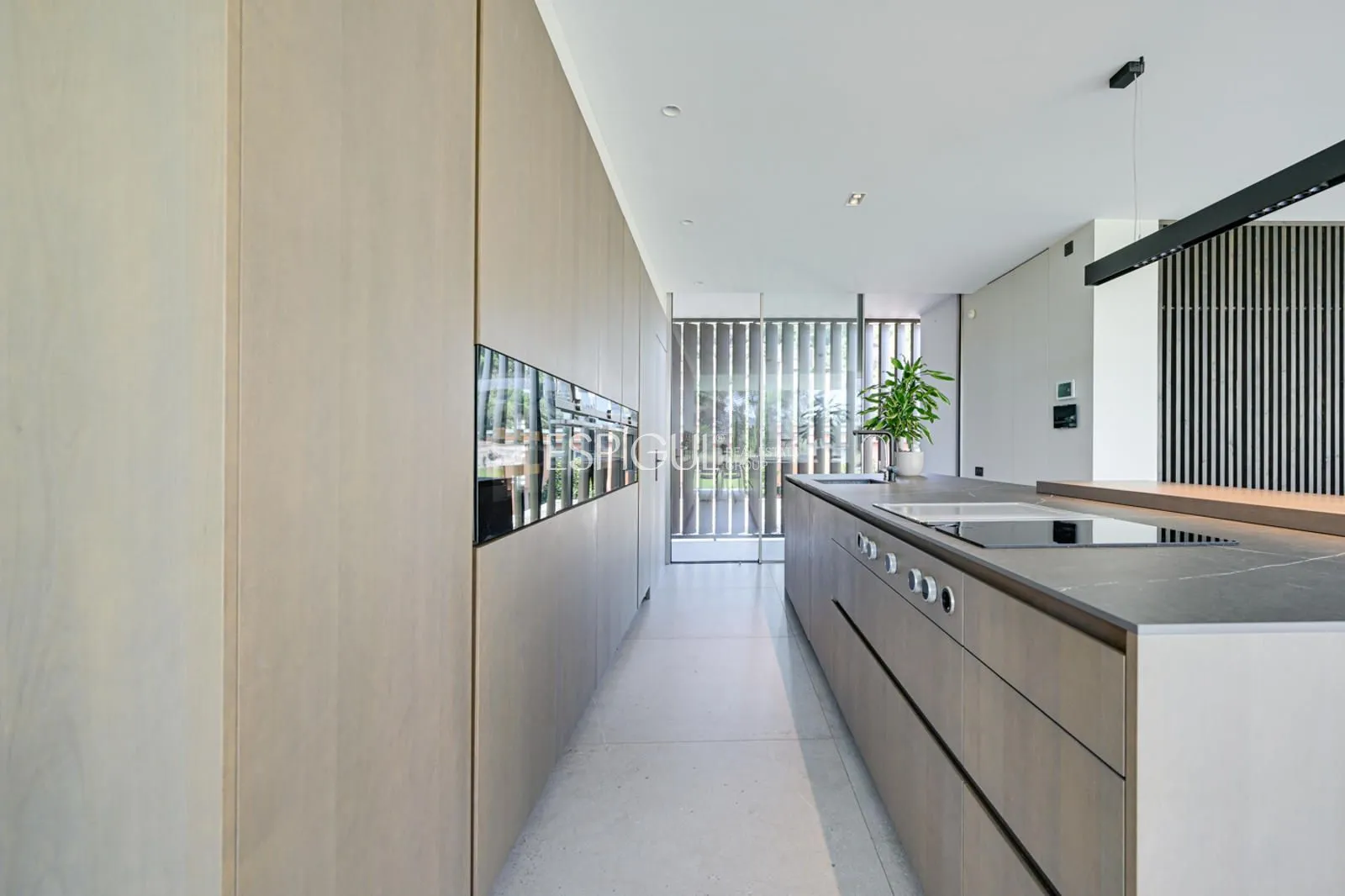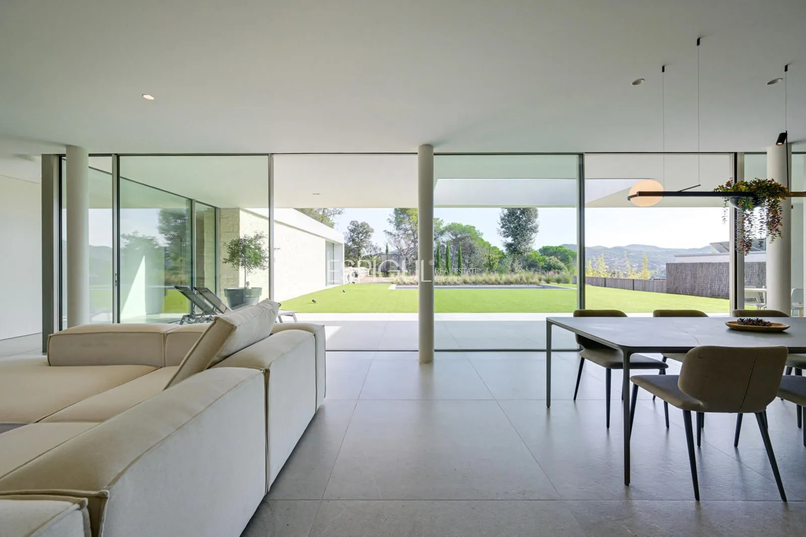 Al acceder a la villa, un amplio y luminoso vestíbulo conduce al elegante salón-comedor, inundado de luz natural gracias a sus grandes ventanales que enmarcan las impresionantes vistas. La moderna chimenea y los acabados de diseño crean un ambiente cálido y acogedor, ideal tanto para el descanso como para el entretenimiento.