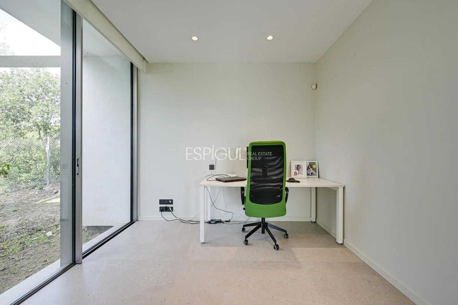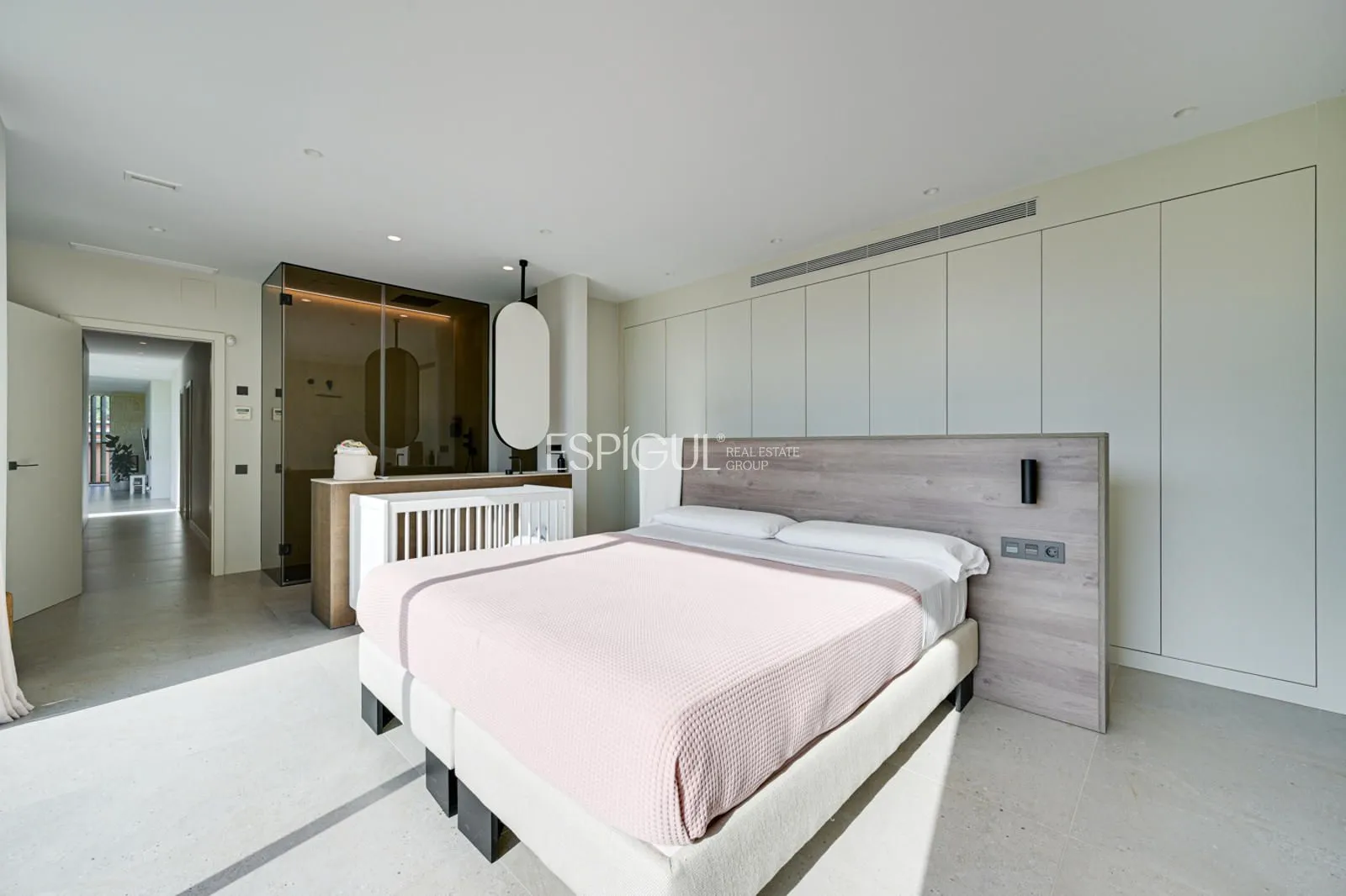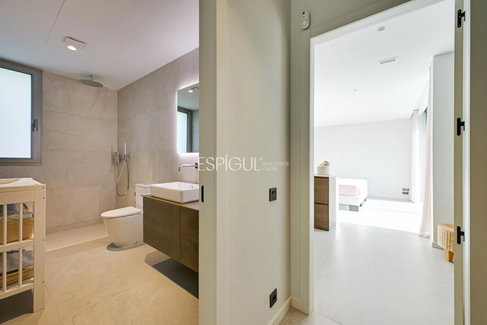 En esta planta también se sitúa un aseo de cortesía, una cómoda oficina perfecta para trabajar desde casa y dos amplios dormitorios que comparten un baño completo. La suite principal es un auténtico santuario de bienestar, con baño privado y acceso directo al jardín y a la zona de piscina.