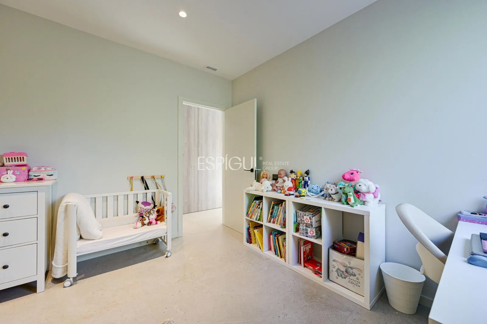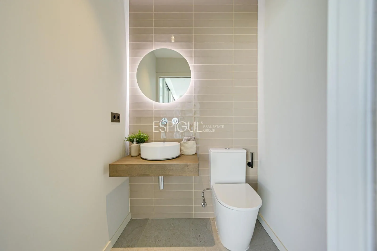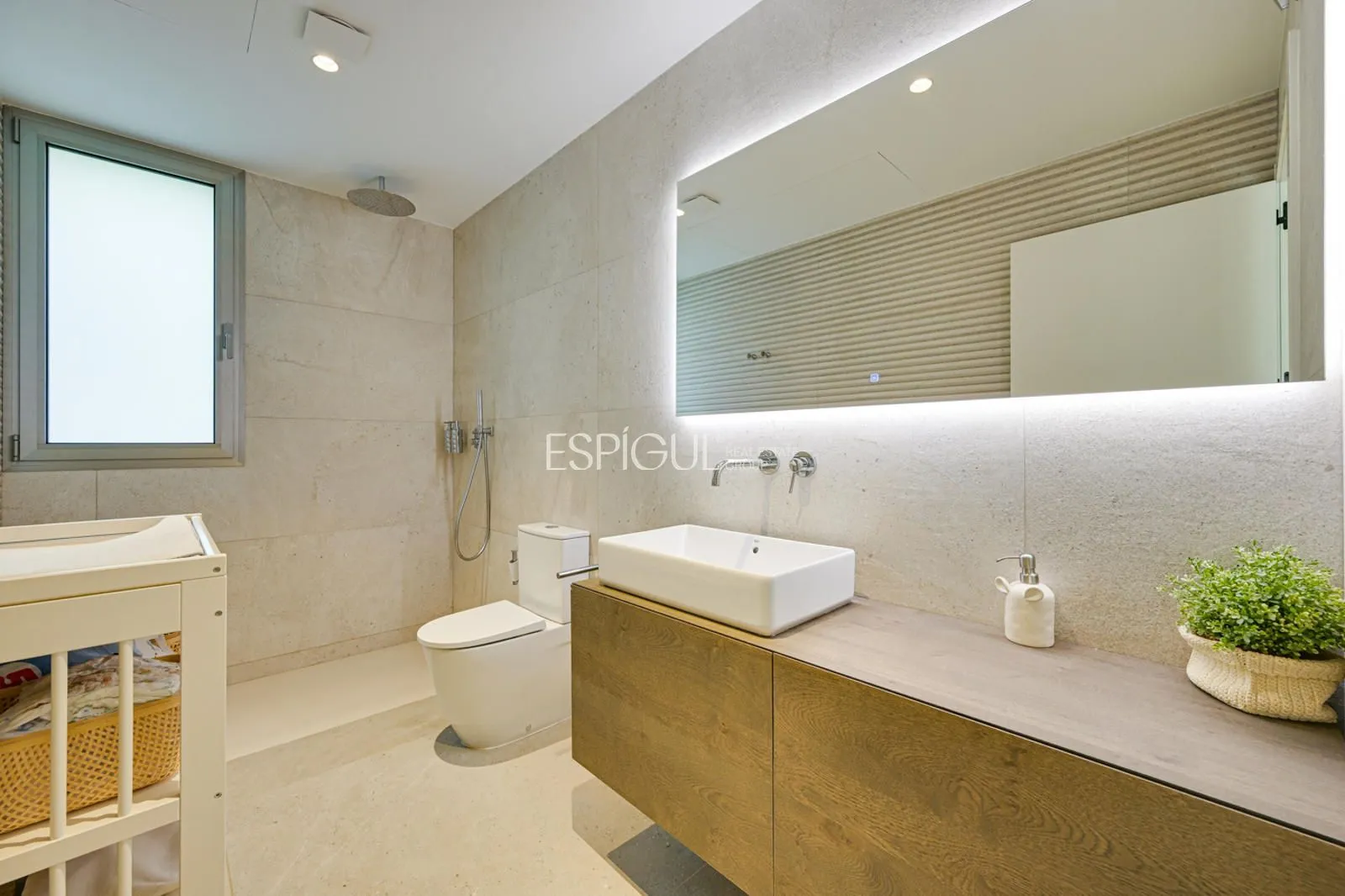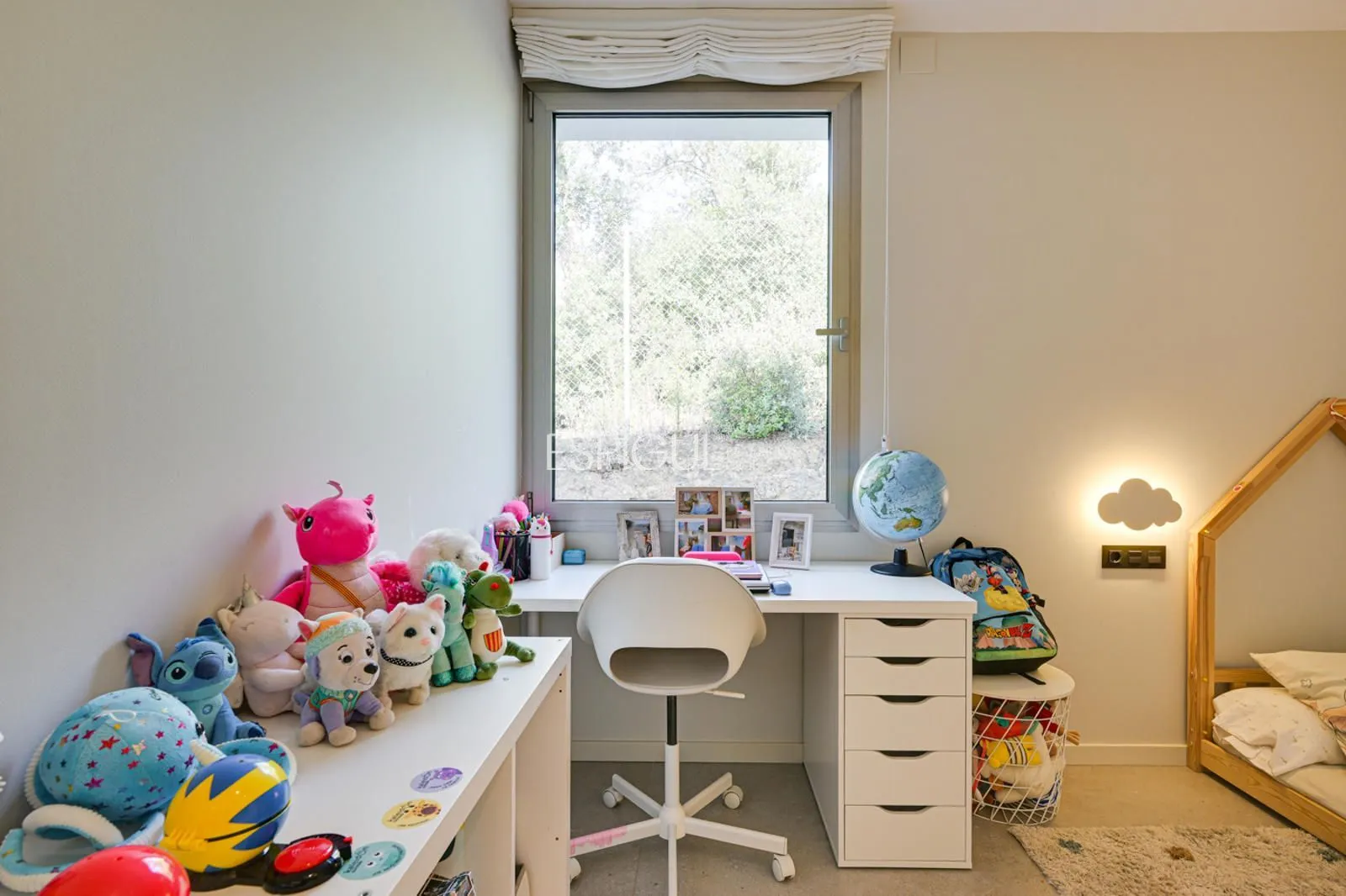 En esta planta también se sitúa un aseo de cortesía, una cómoda oficina perfecta para trabajar desde casa y dos amplios dormitorios que comparten un baño completo. La suite principal es un auténtico santuario de bienestar, con baño privado y acceso directo al jardín y a la zona de piscina.