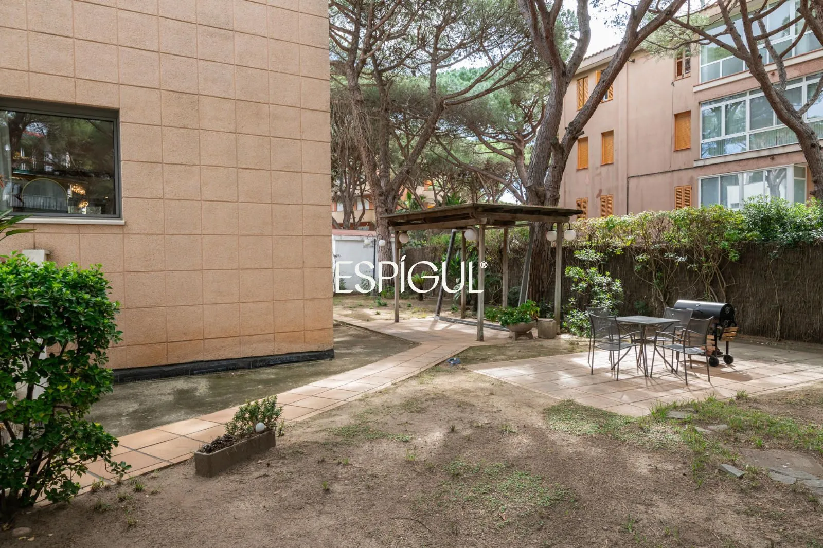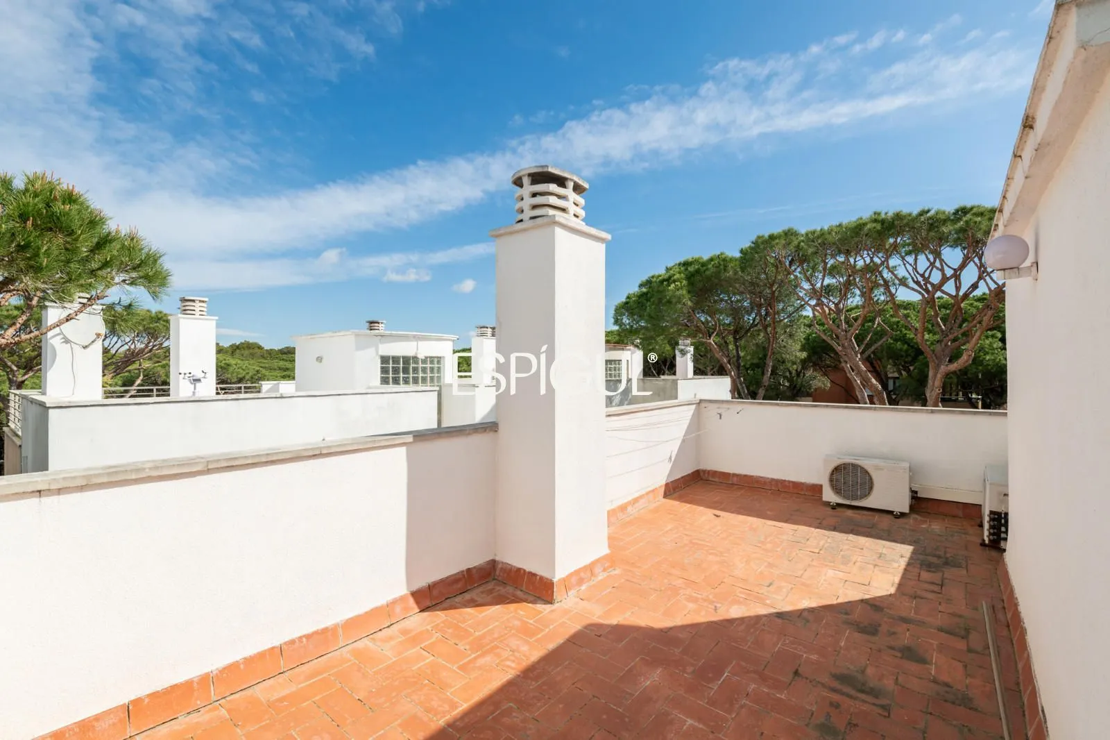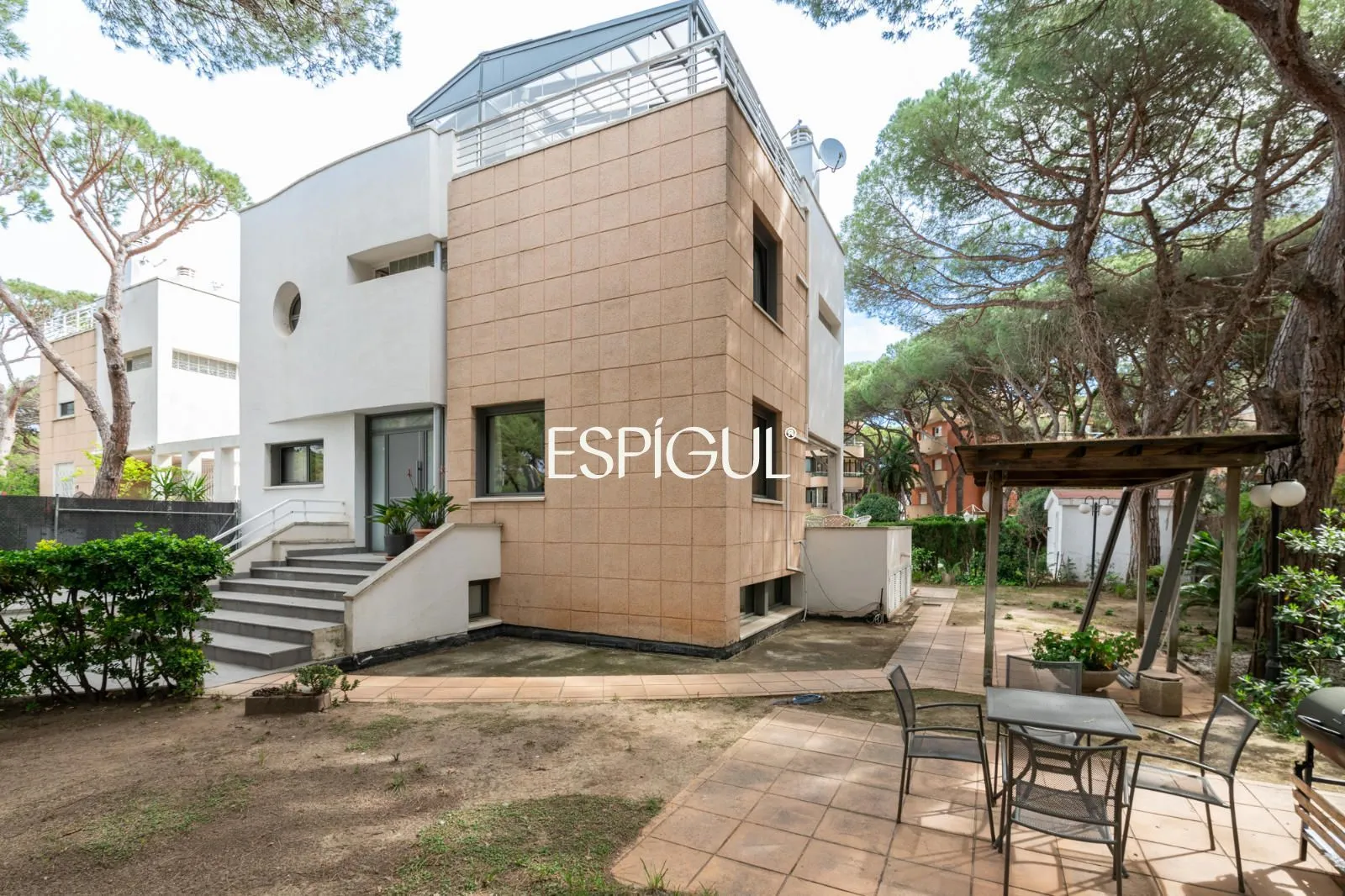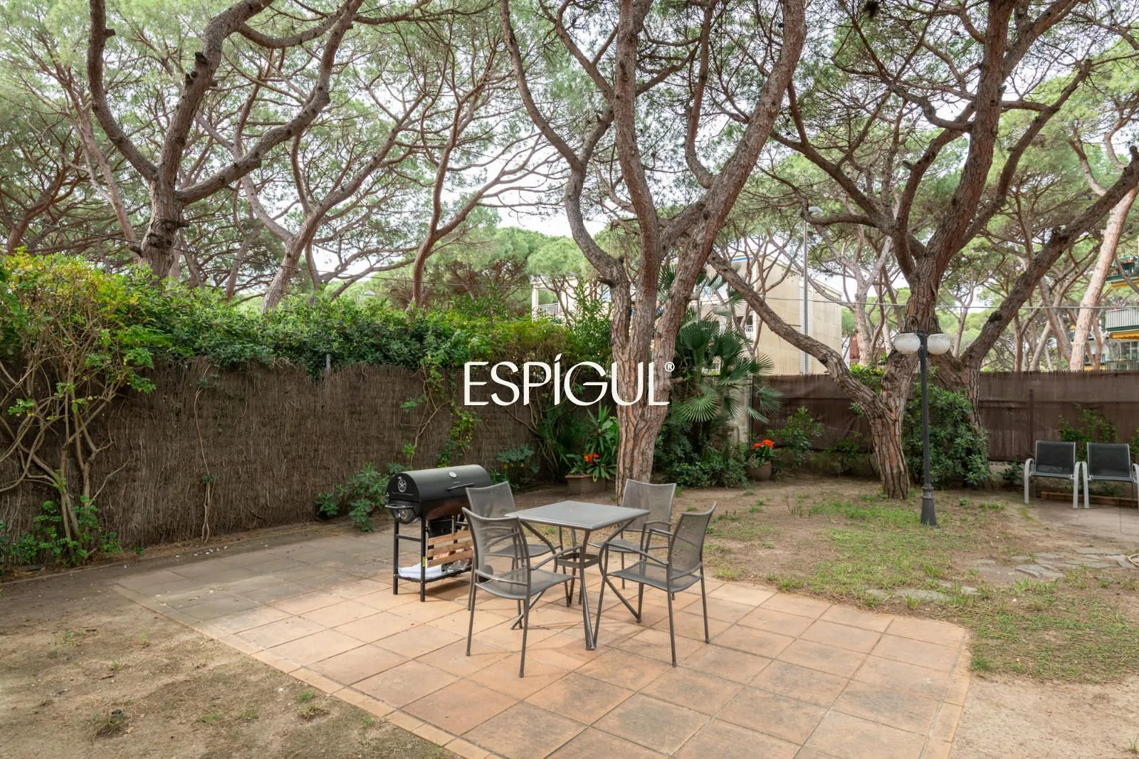 En el exterior, la casa ofrece una terraza con agradables vistas a los pinos, así como un jardín privado con zona de barbacoa, un entorno perfecto para disfrutar del clima mediterráneo en un ambiente íntimo y relajado.
