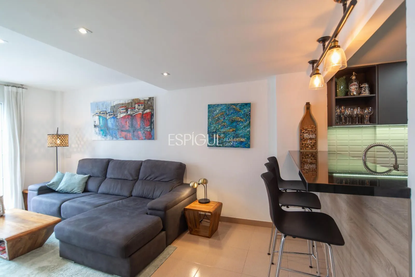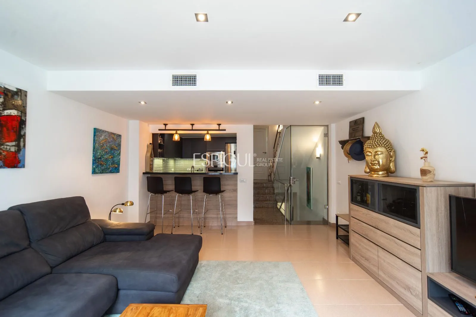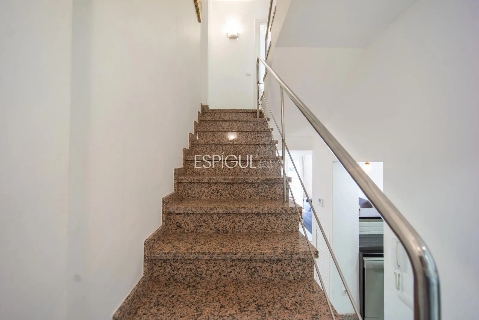 El acceso a la vivienda se realiza a través de un vestíbulo privado con escalera que conecta directamente con la primera planta, donde se encuentran el salón-comedor, una moderna cocina americana y una acogedora terraza chill-out. La distribución en medias plantas permite una excelente organización de los espacios, con un primer dormitorio doble con balcón y un baño completo con lavadero en la primera planta superior.