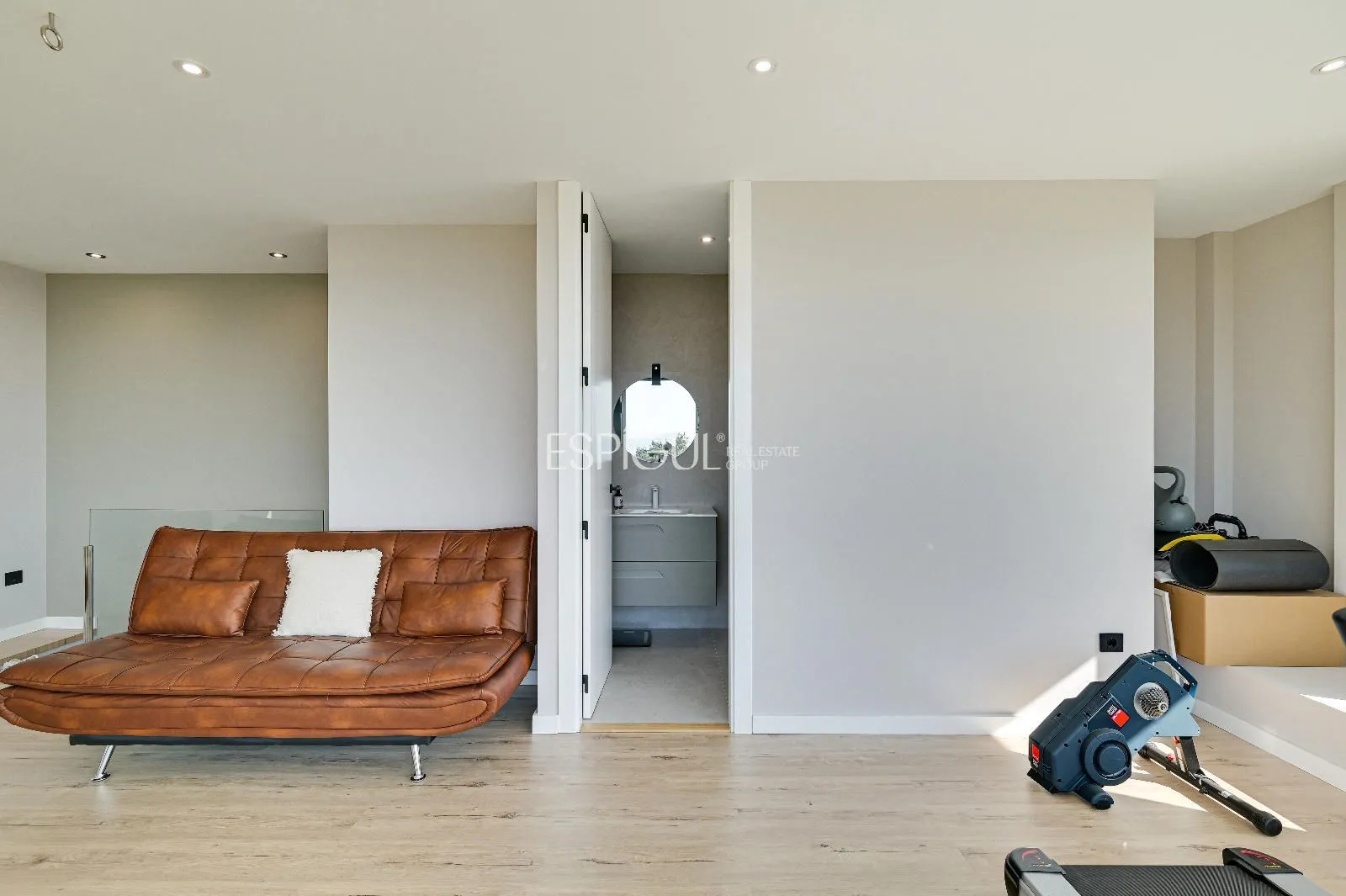 La primera planta está destinada al descanso e integra una habitación doble, un baño completo y una imponente suite principal con baño privado, dotado de ducha y bañera, y un generoso vestidor. Además ofrece una zona de aguas independiente. En la segunda planta se despliega la zona de día, presidida por un luminoso salón-comedor de concepto abierto que se fusiona con una cocina de diseño con isla central. Este espacio diáfano se prolonga hacia el exterior, conectando con el jardín donde destacan la piscina de agua salada, una terraza solárium, ideal para el relax y, una zona de barbacoa perfecta para el entretenimiento al aire libre, siempre con el mar como telón de fondo. La planta se completa con un aseo de cortesía y una amplia habitación, actualmente destinada a oficina privada. Finalmente, la planta superior alberga una gran sala polivalente, actualmente destinada a gimnasio, acompañada de un baño completo y un balcón privado que enmarca unas vistas privilegiadas.