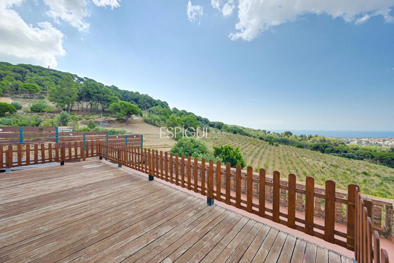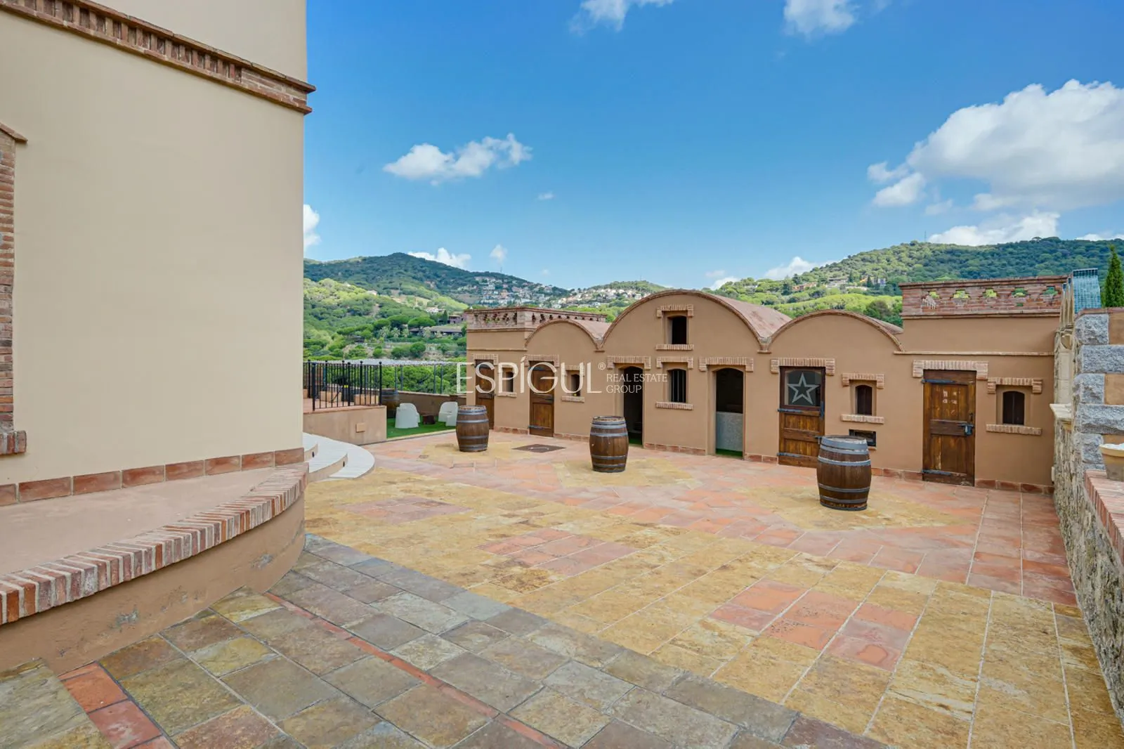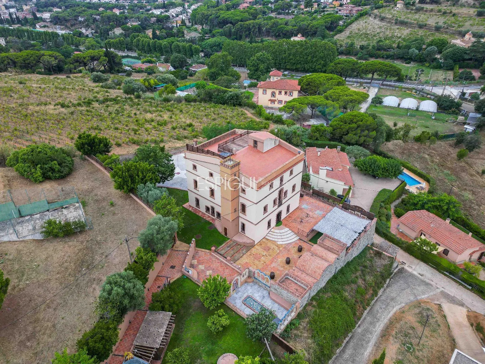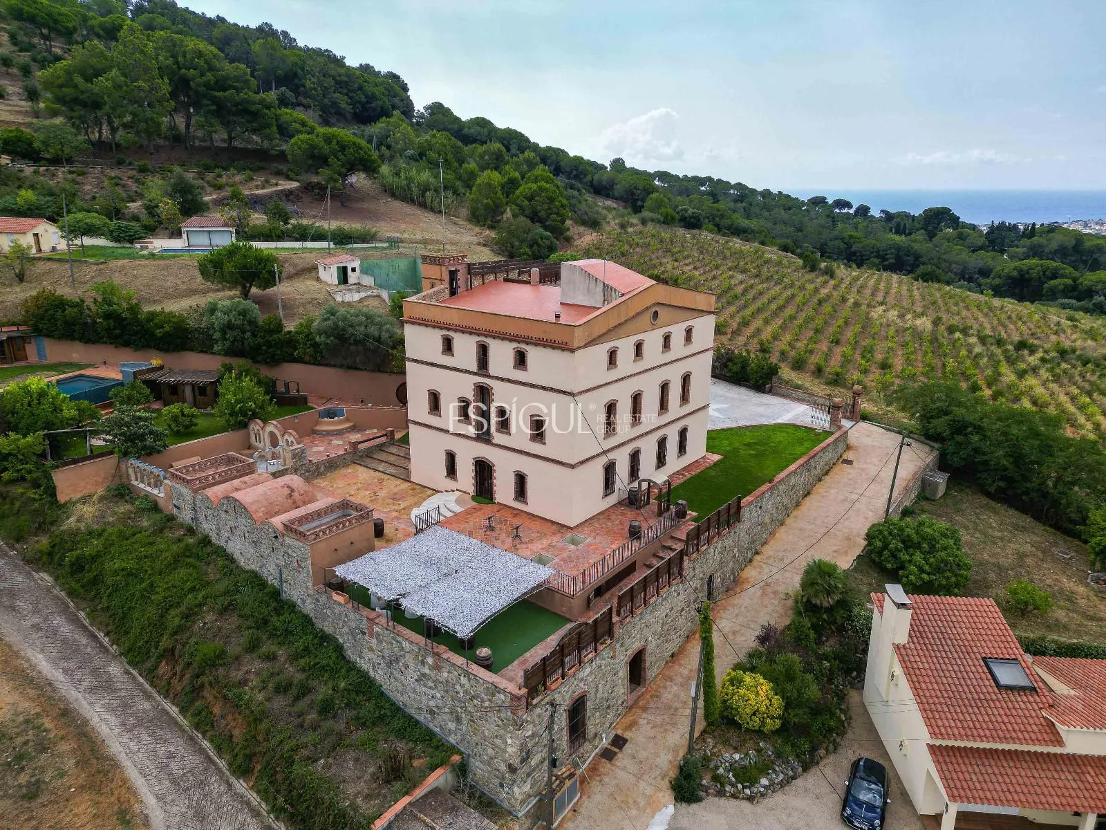 En el exterior, la finca ofrece un jardín con césped y zonas ornamentales, una piscina privada de 10 x 4 m con jacuzzi y ducha exterior, amplias terrazas para disfrutar del aire libre, y una azotea con vistas panorámicas de 360º sobre los viñedos y el Mediterráneo. Además, dispone de parking privado para varios vehículos y un depósito subterráneo de agua de lluvia de 100.000 litros.