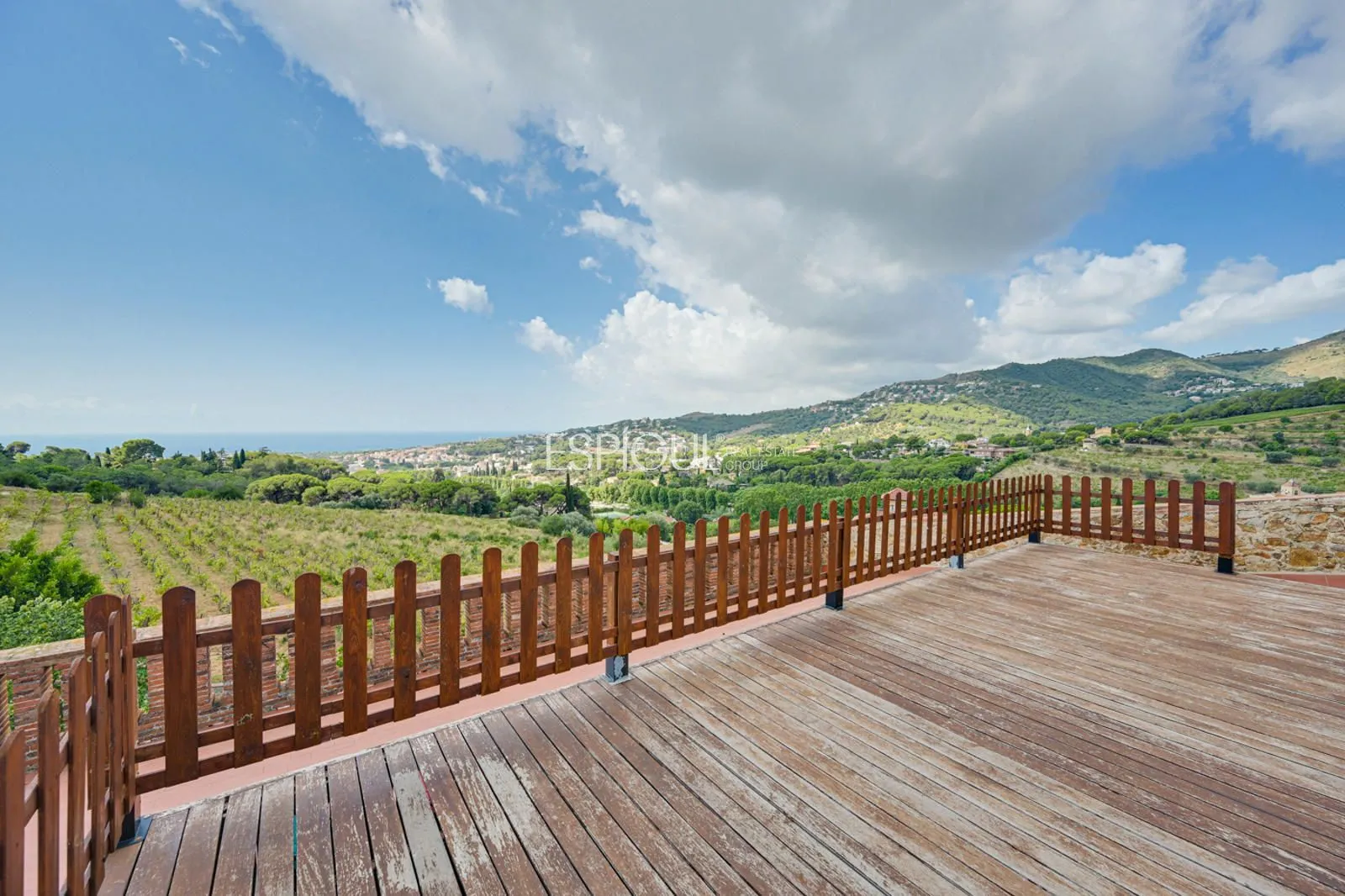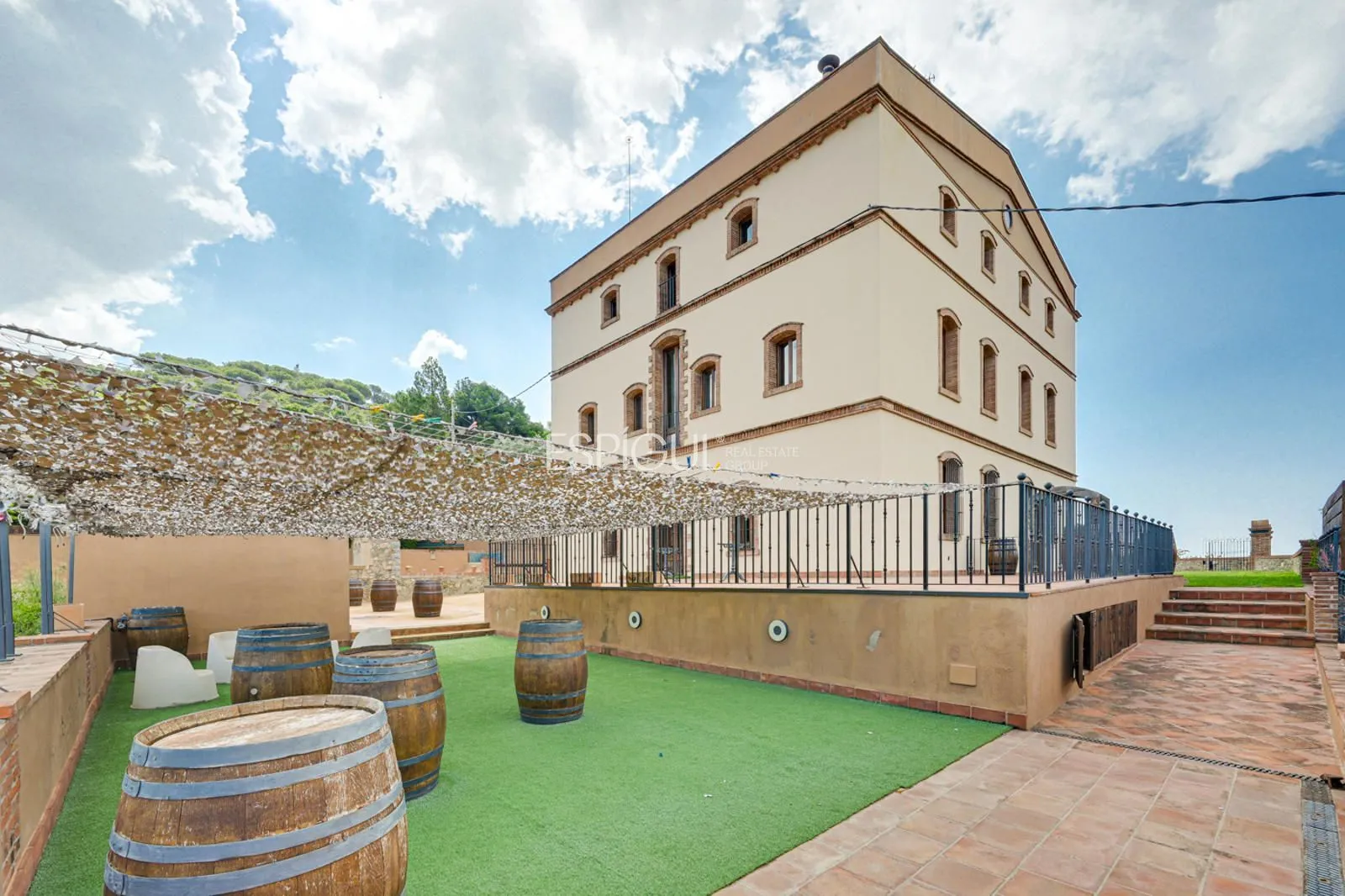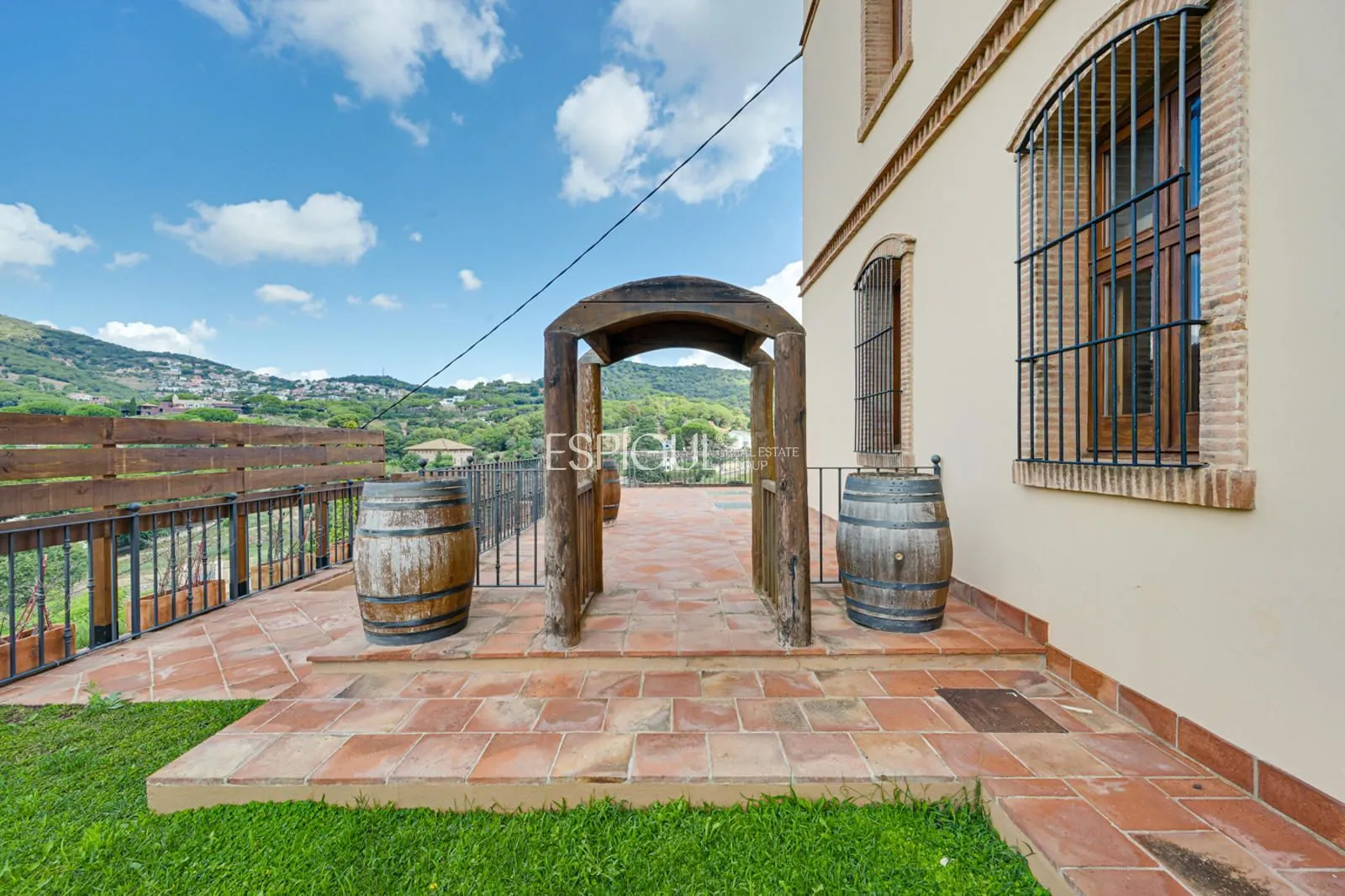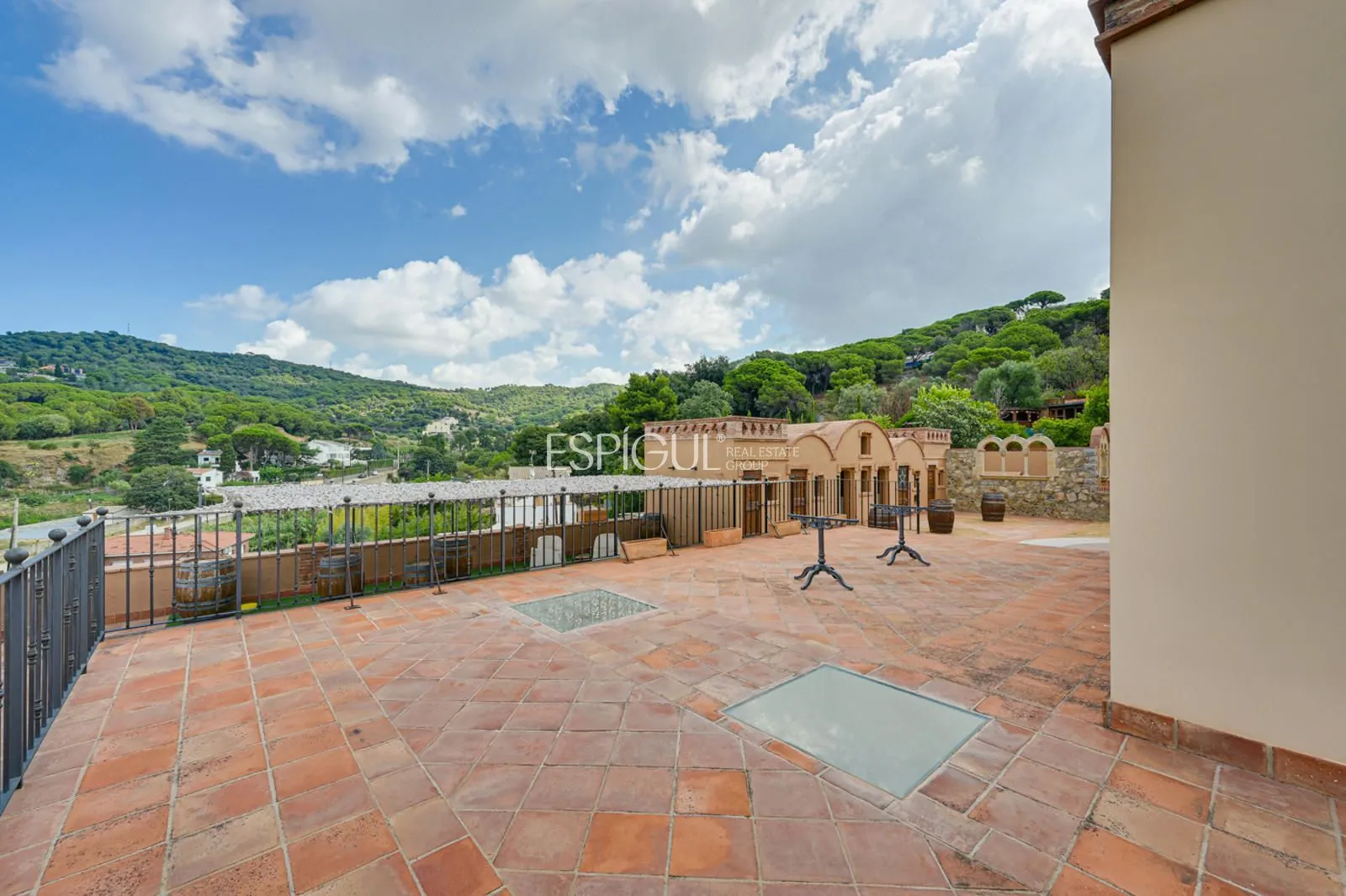 En el exterior, la finca ofrece un jardín con césped y zonas ornamentales, una piscina privada de 10 x 4 m con jacuzzi y ducha exterior, amplias terrazas para disfrutar del aire libre, y una azotea con vistas panorámicas de 360º sobre los viñedos y el Mediterráneo. Además, dispone de parking privado para varios vehículos y un depósito subterráneo de agua de lluvia de 100.000 litros.