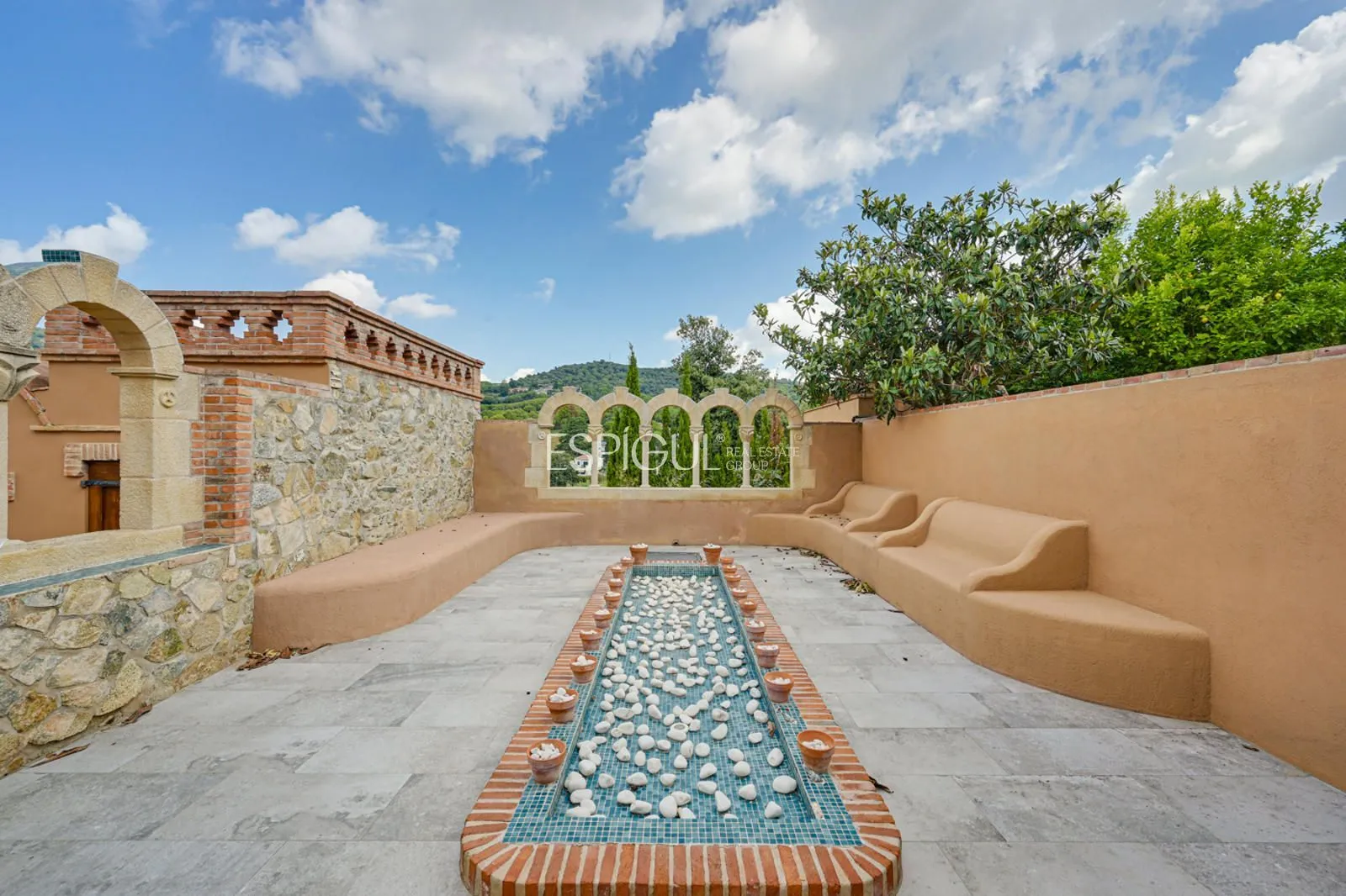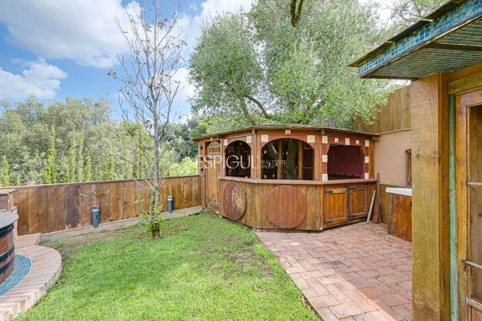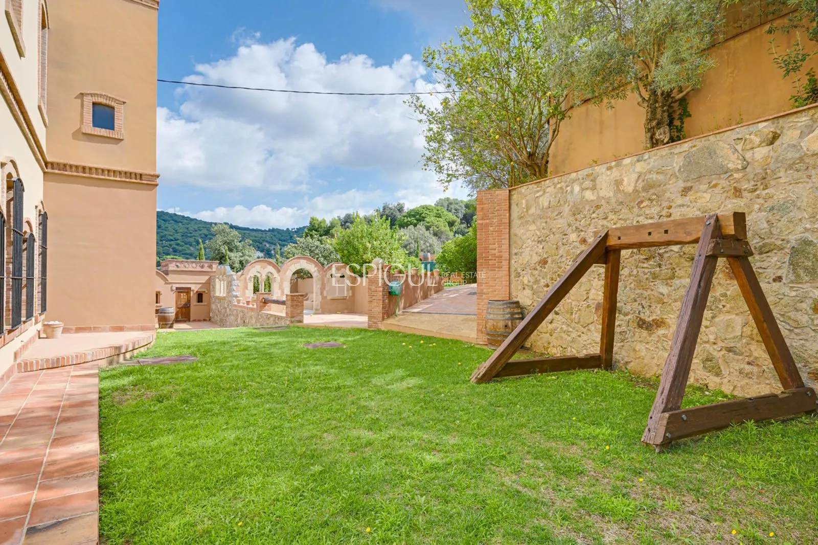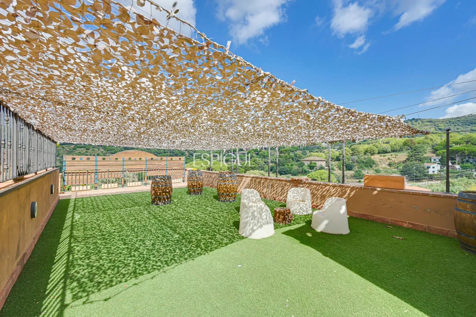 En el exterior, la finca ofrece un jardín con césped y zonas ornamentales, una piscina privada de 10 x 4 m con jacuzzi y ducha exterior, amplias terrazas para disfrutar del aire libre, y una azotea con vistas panorámicas de 360º sobre los viñedos y el Mediterráneo. Además, dispone de parking privado para varios vehículos y un depósito subterráneo de agua de lluvia de 100.000 litros.