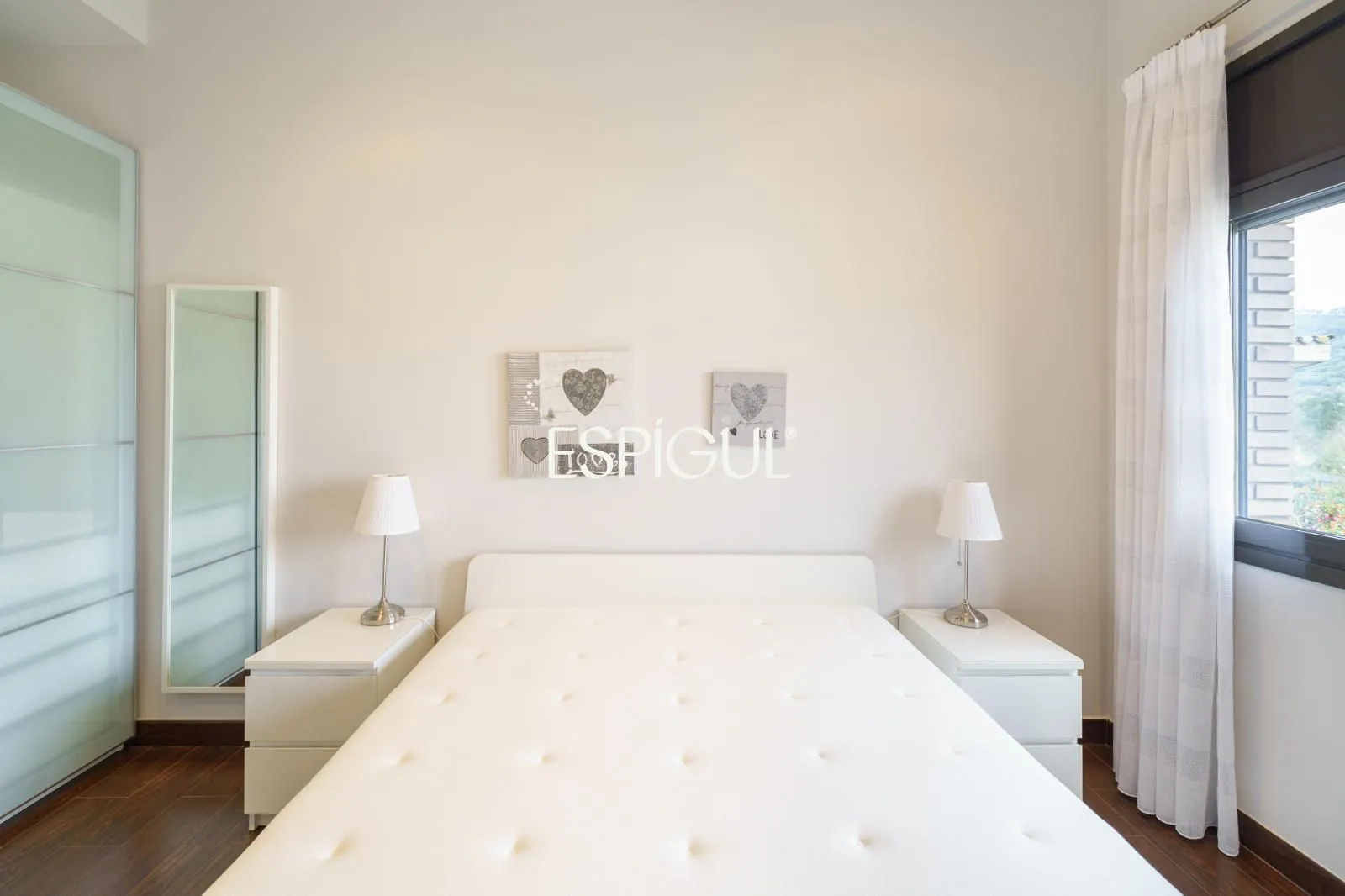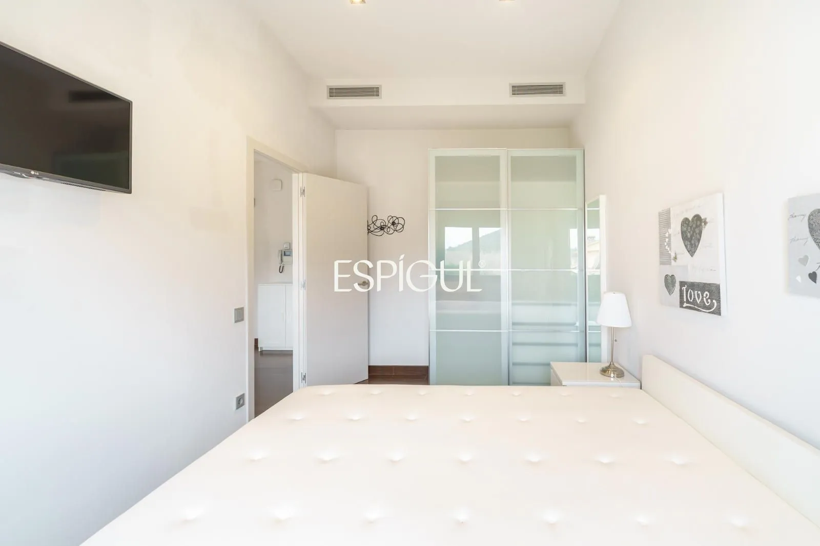 La suite cuenta con una terraza privada desde donde se contempla la piscina y las impresionantes montañas que rodean Vallromanes, creando un escenario perfecto para relajarse y disfrutar del paisaje.