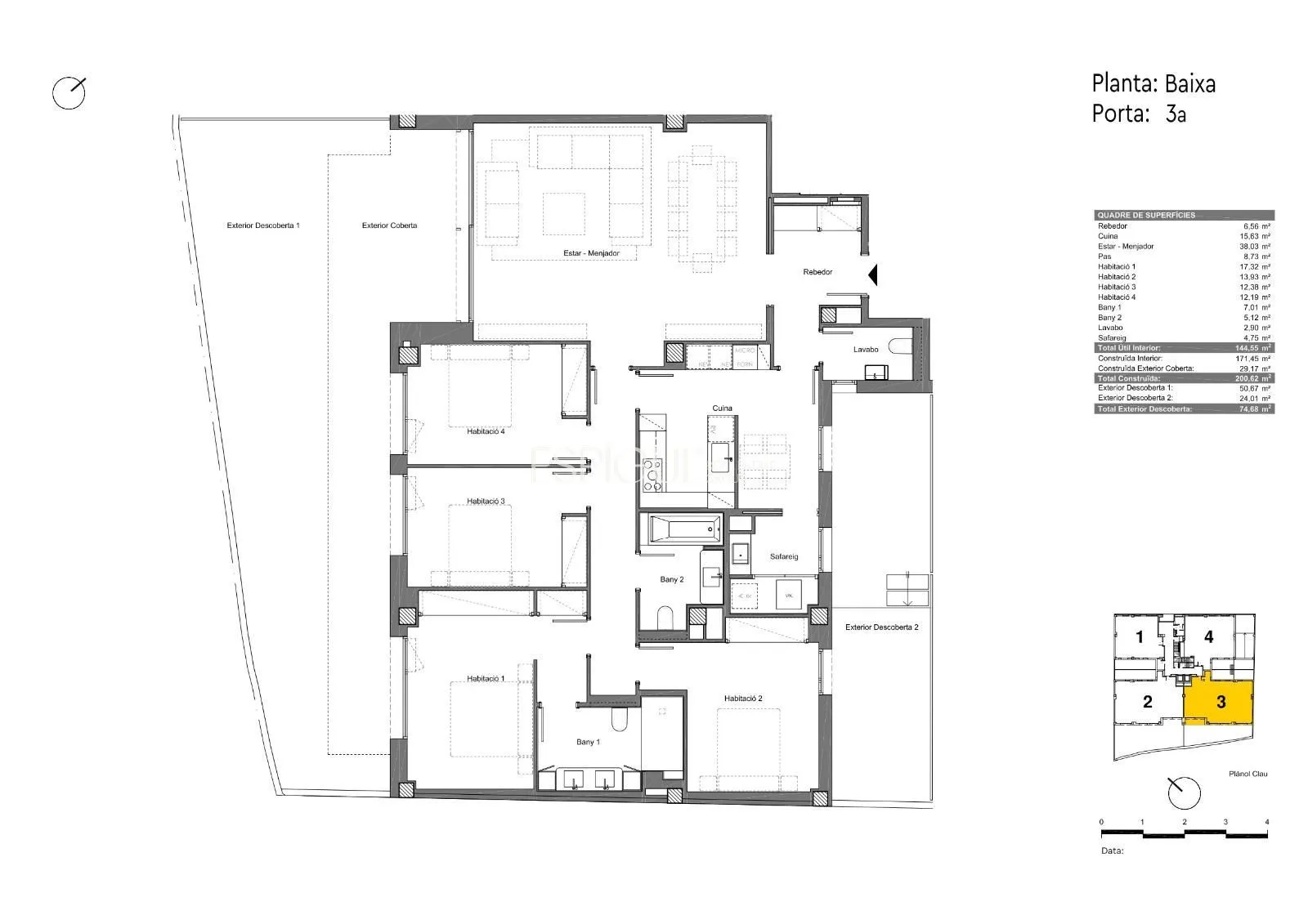 La vivienda se encuentra en planta baja y cuenta con 171 m² interiores. A la entrada, la zona de día incluye un amplio salón-comedor, cocina independiente totalmente equipada y zona de lavadero. La zona de noche dispone de cuatro dormitorios dobles, incluyendo el principal con baño en suite. Tres de los dormitorios tienen acceso directo a una espectacular terraza de 80 m² y el cuarto a una terraza privada de 24 m².