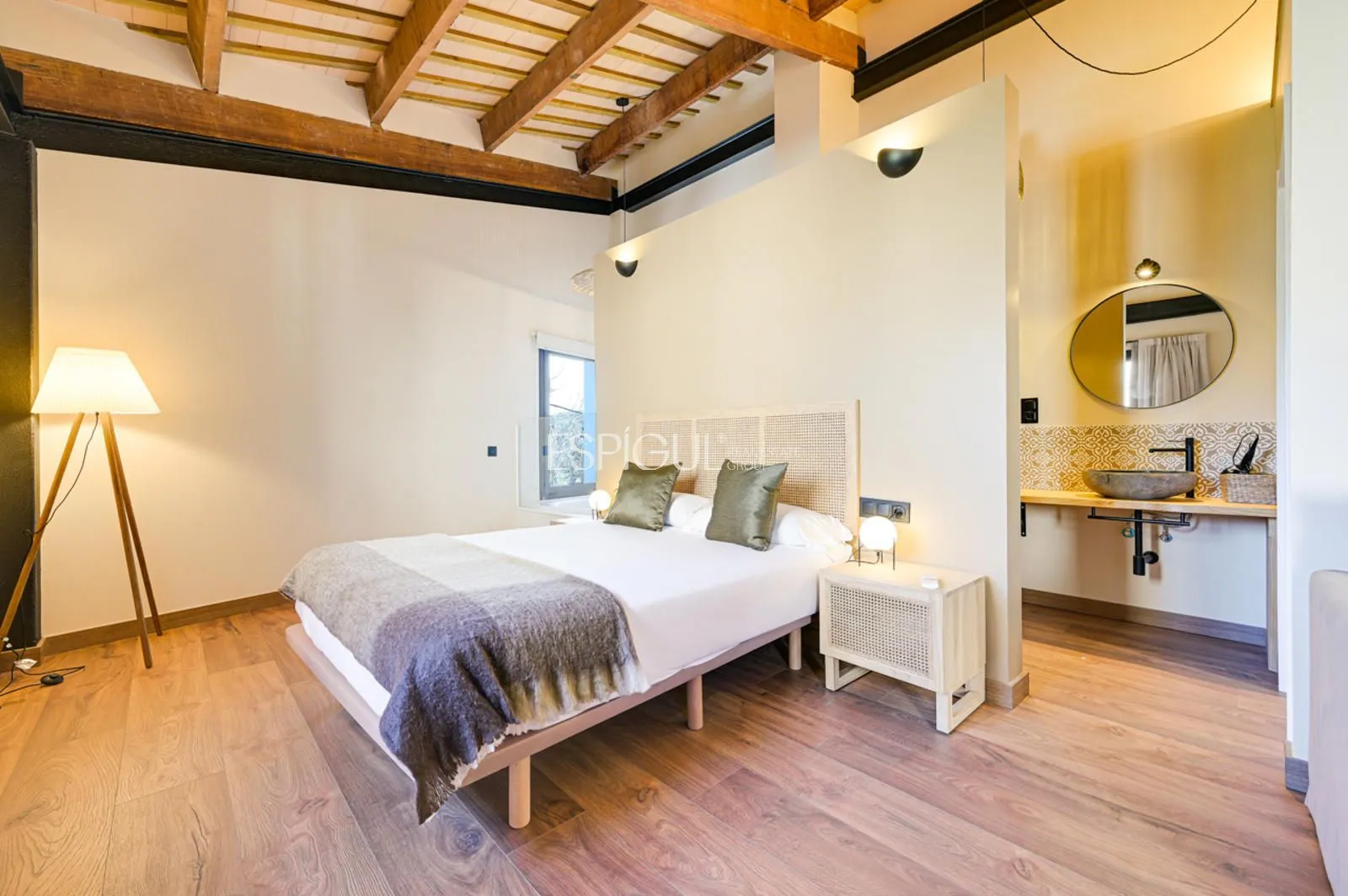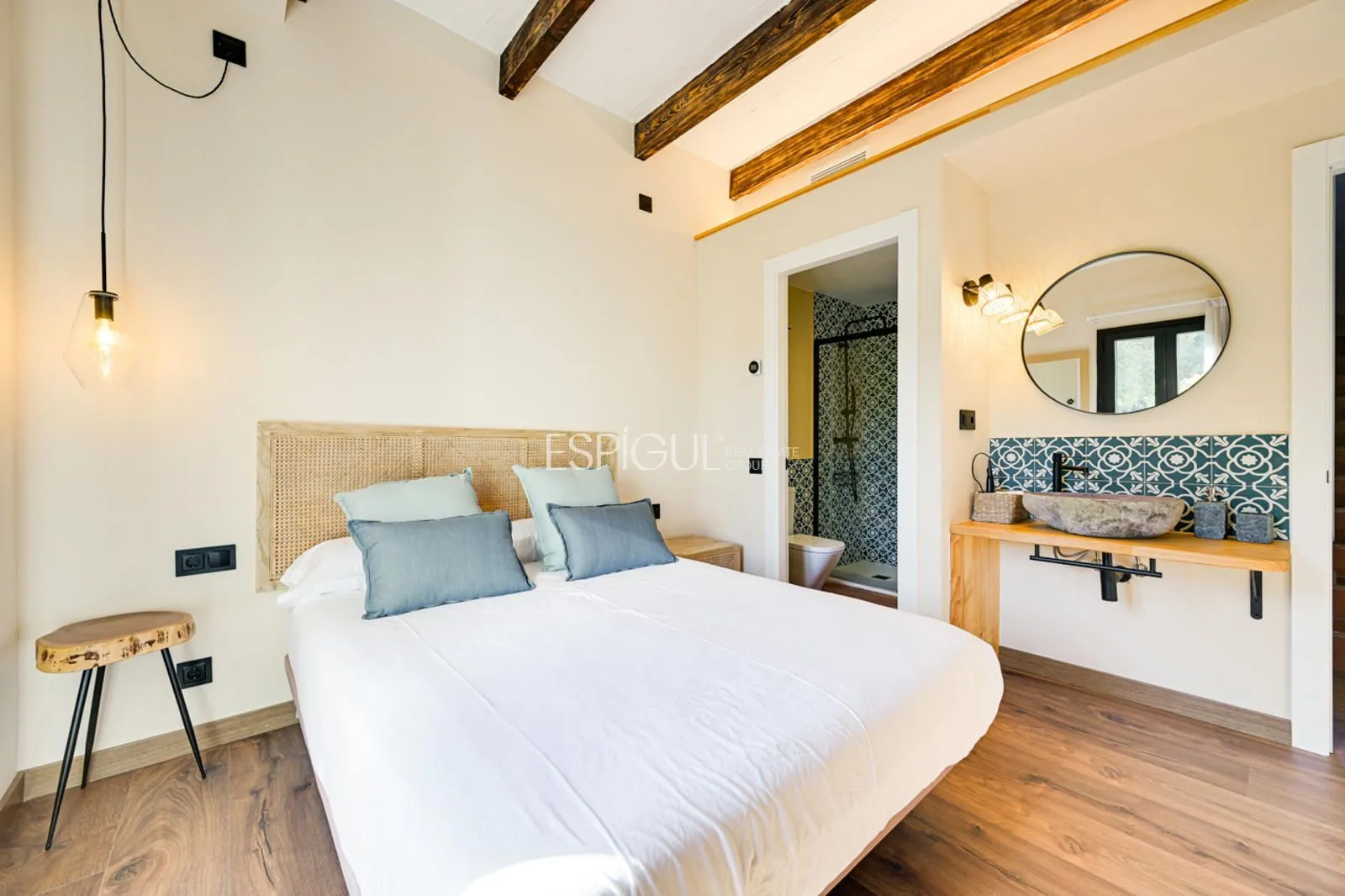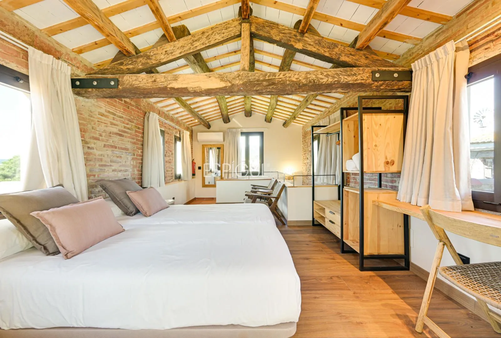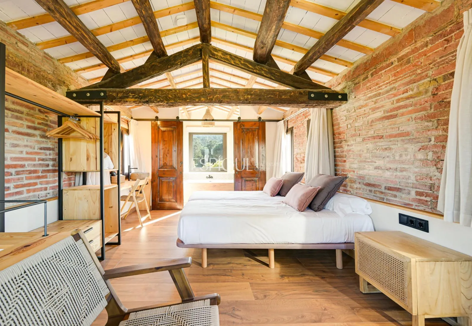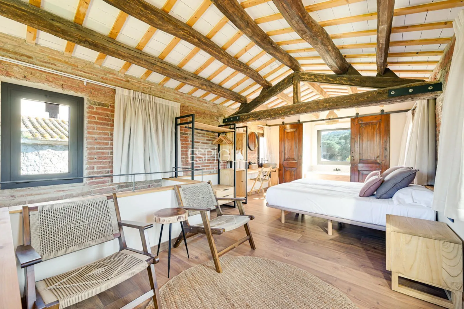 Vivienda principal: rehabilitada conservando su carácter original y adaptada a un uso moderno y funcional. En planta baja se distribuye la cocina abierta al salón comedor, zona de lavandería y aseo de cortesía, con salida al porche con barbacoa y al jardín con piscina junto al antiguo molino histórico. En la primera planta se ubican cuatro dormitorios en suite, y la planta superior cuenta con una buhardilla con dormitorio y bañera exenta con vistas abiertas al entorno.