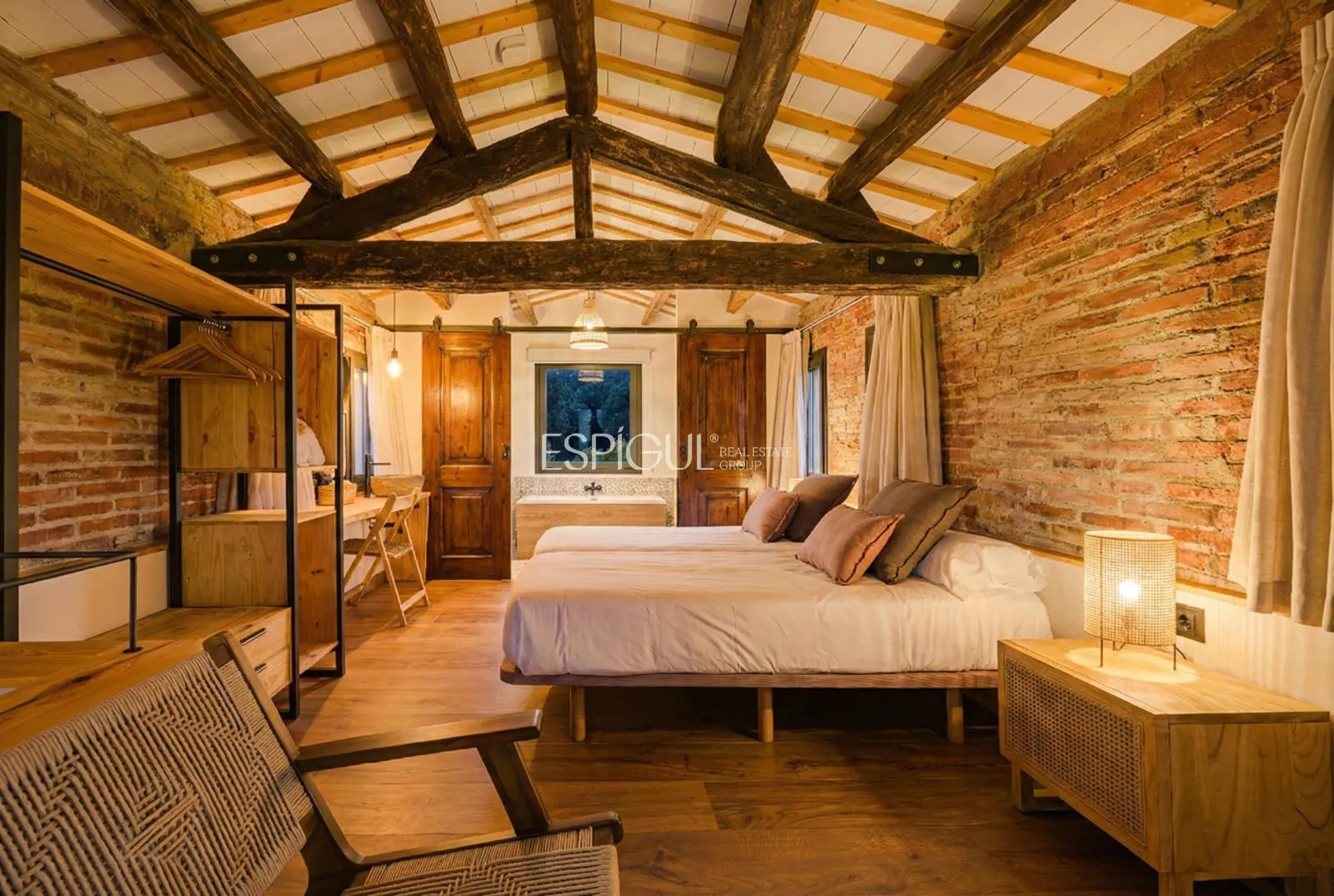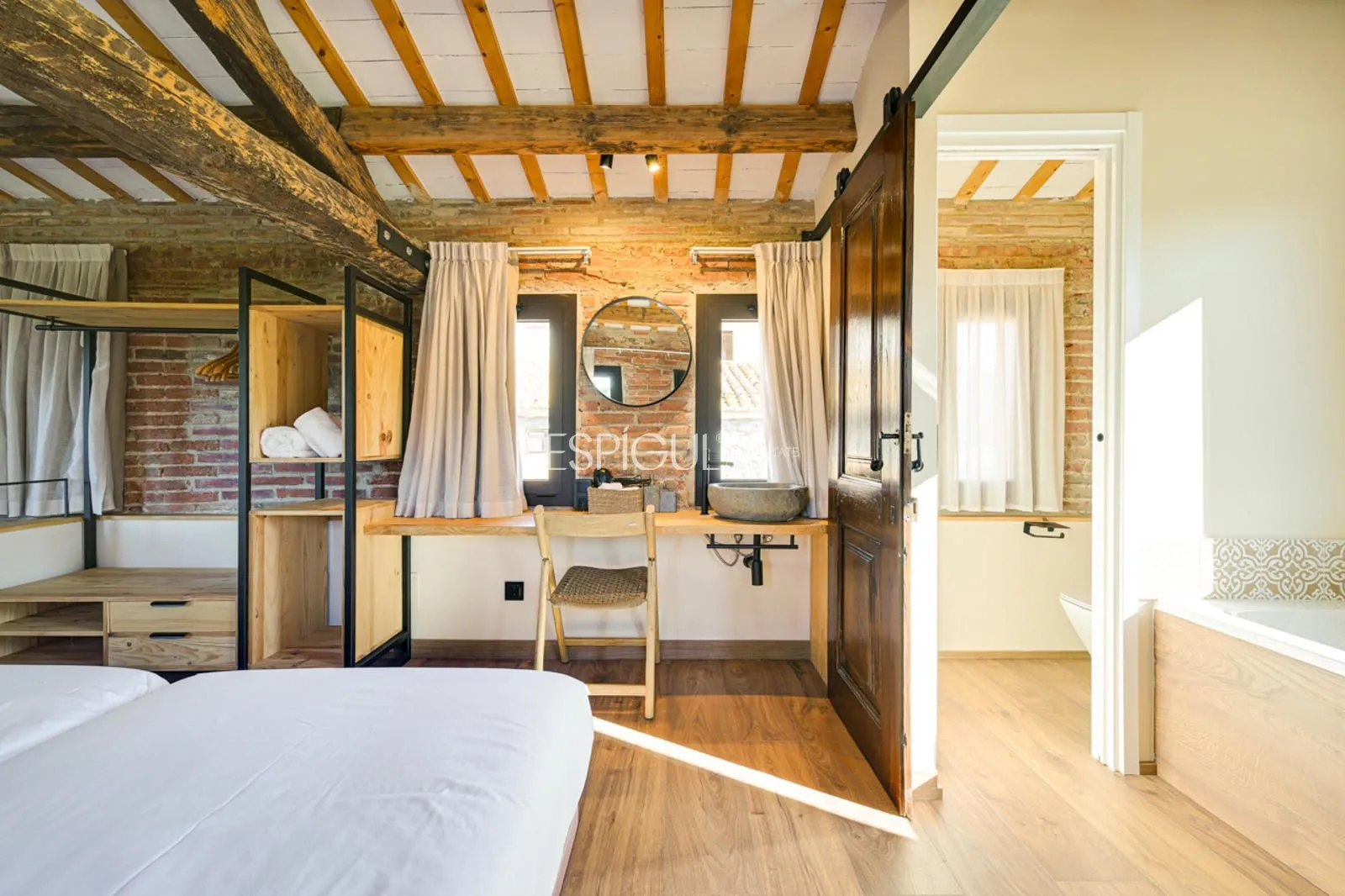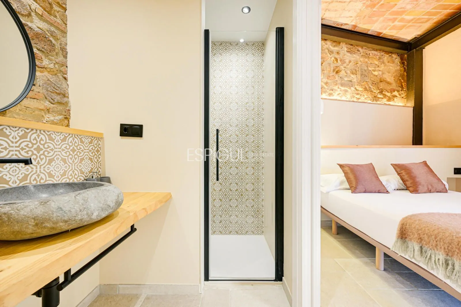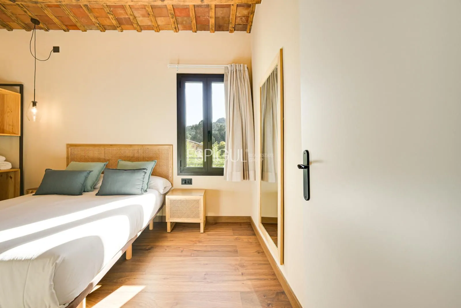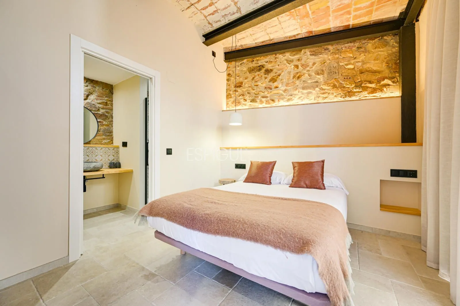 Vivienda principal: rehabilitada conservando su carácter original y adaptada a un uso moderno y funcional. En planta baja se distribuye la cocina abierta al salón comedor, zona de lavandería y aseo de cortesía, con salida al porche con barbacoa y al jardín con piscina junto al antiguo molino histórico. En la primera planta se ubican cuatro dormitorios en suite, y la planta superior cuenta con una buhardilla con dormitorio y bañera exenta con vistas abiertas al entorno.
