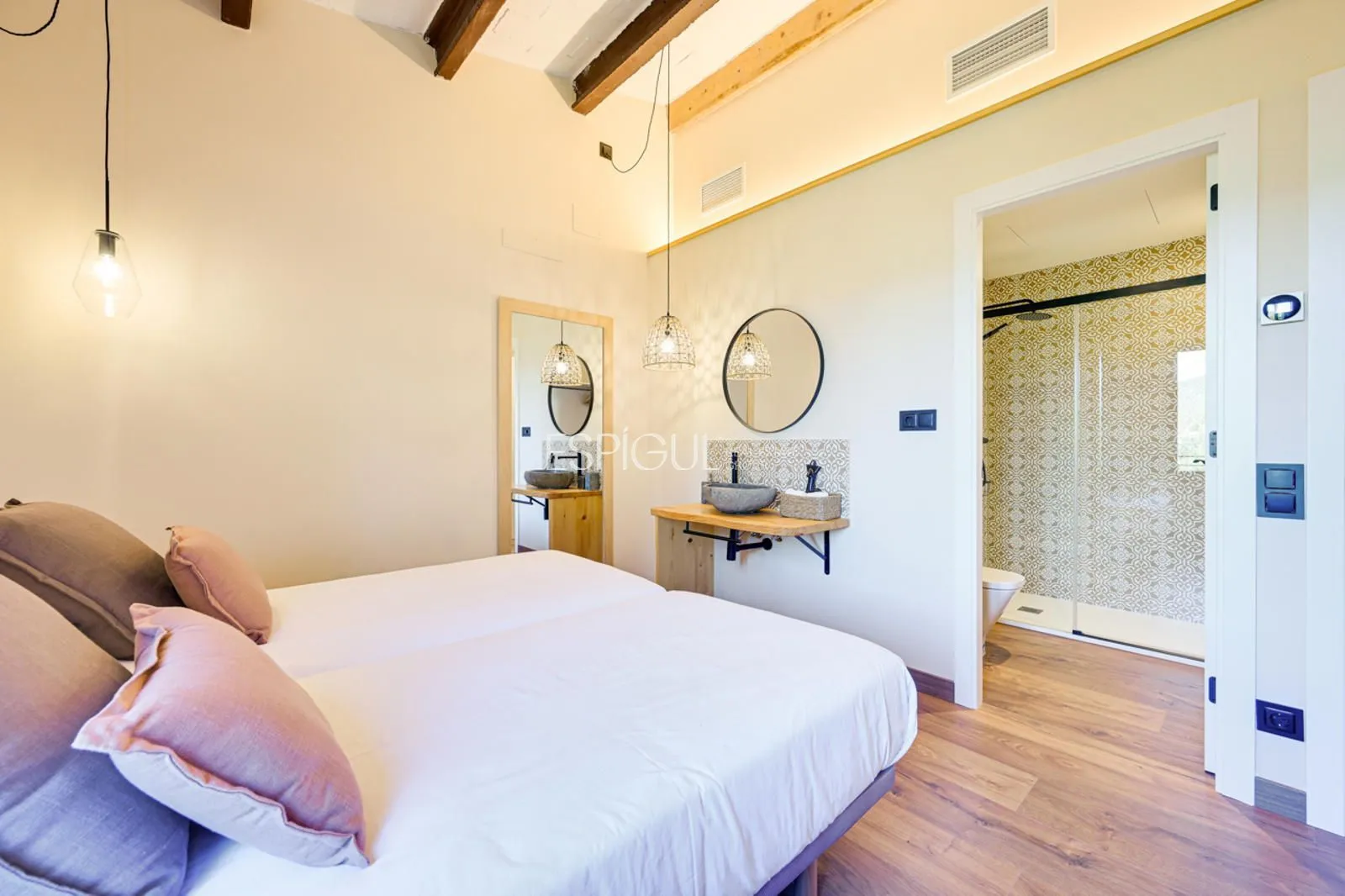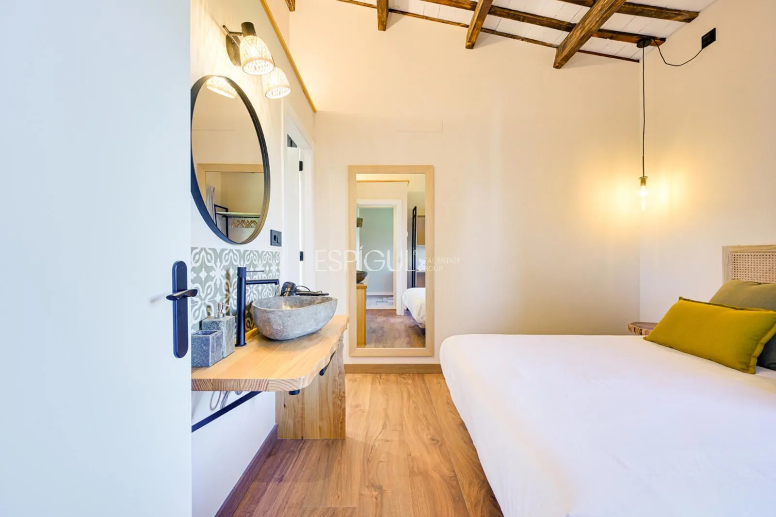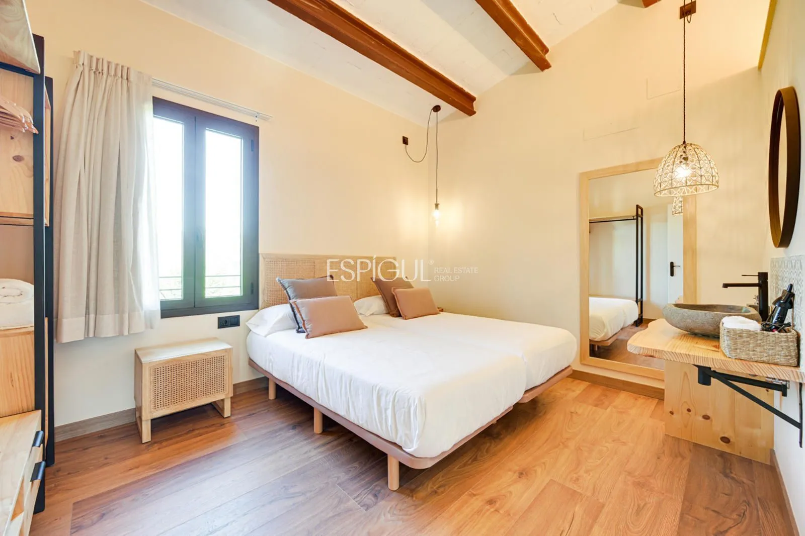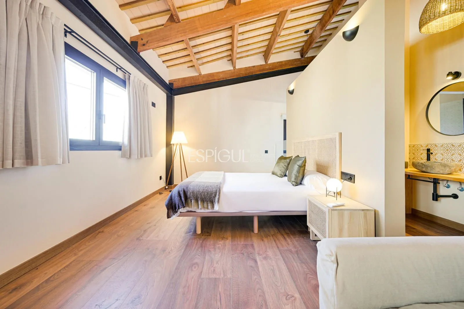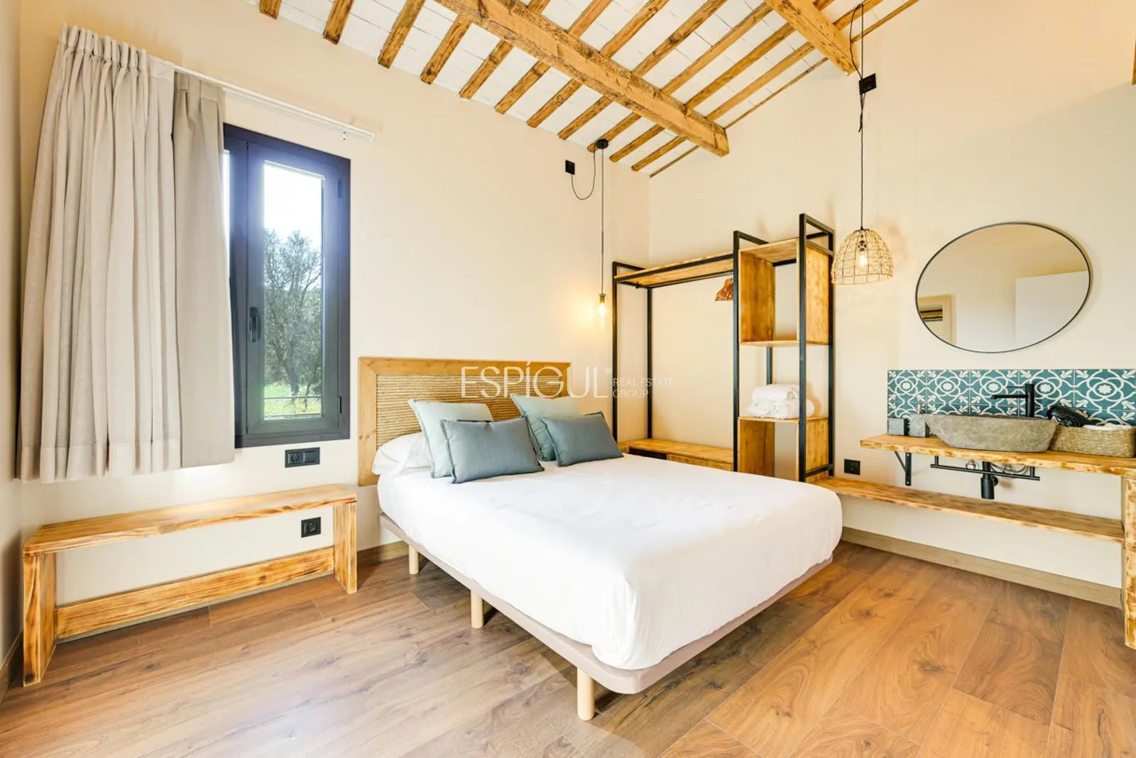 Vivienda principal: rehabilitada conservando su carácter original y adaptada a un uso moderno y funcional. En planta baja se distribuye la cocina abierta al salón comedor, zona de lavandería y aseo de cortesía, con salida al porche con barbacoa y al jardín con piscina junto al antiguo molino histórico. En la primera planta se ubican cuatro dormitorios en suite, y la planta superior cuenta con una buhardilla con dormitorio y bañera exenta con vistas abiertas al entorno.