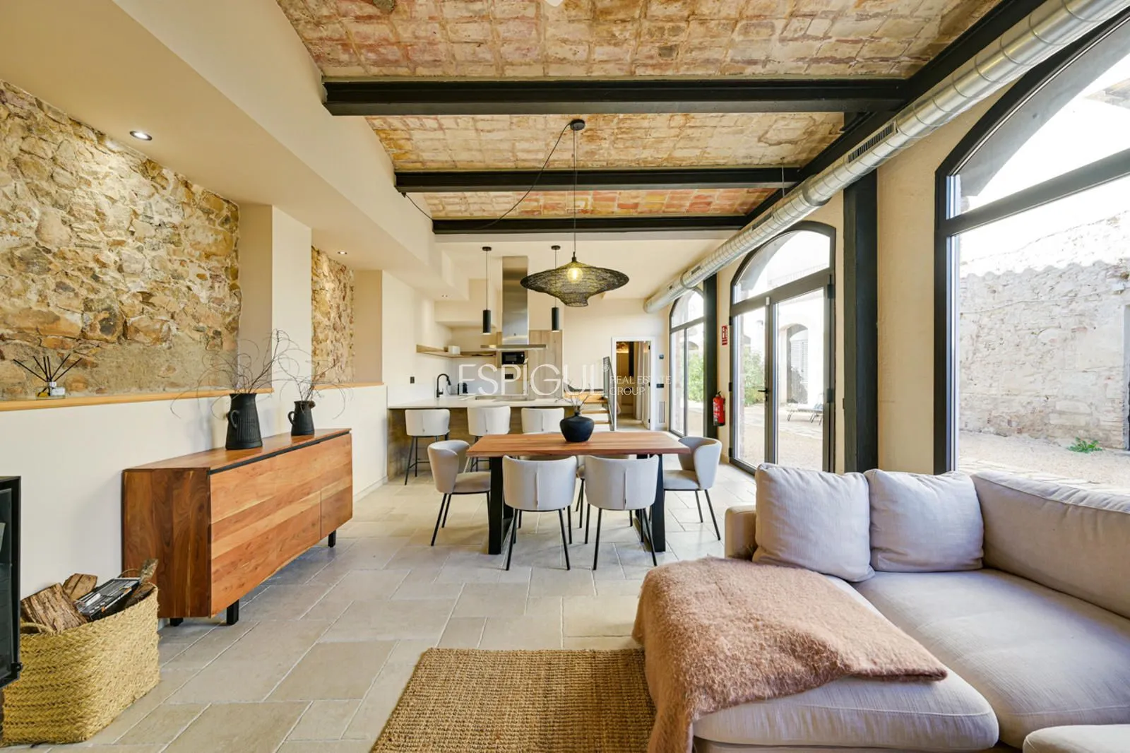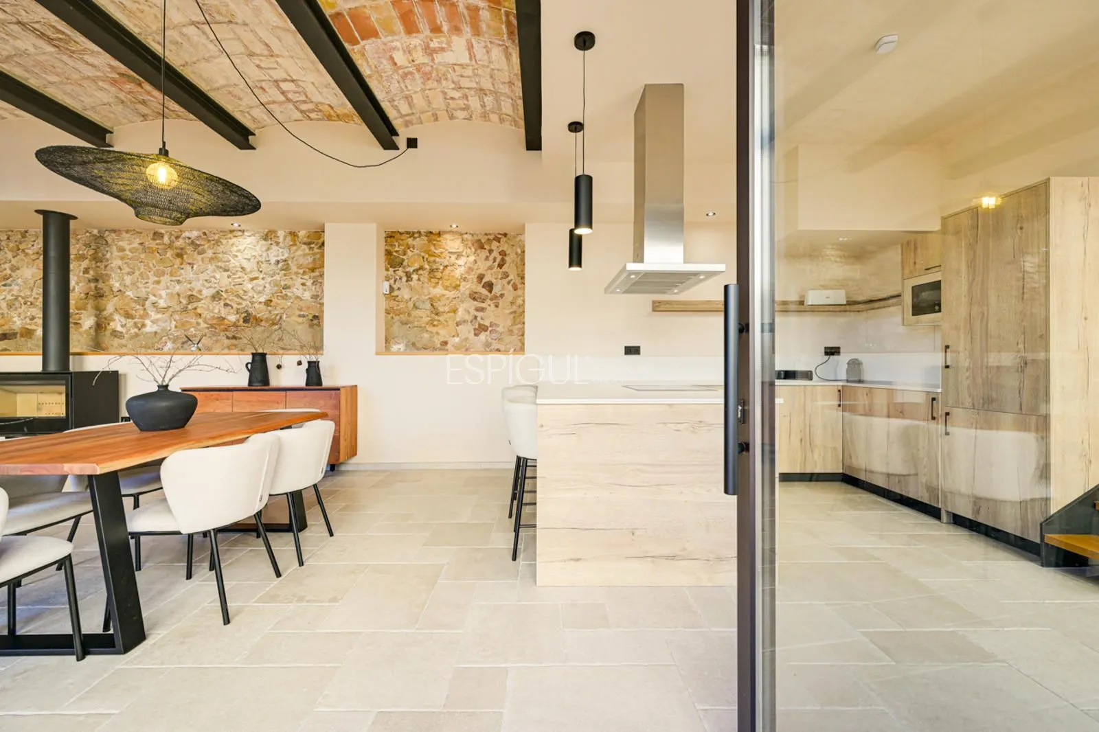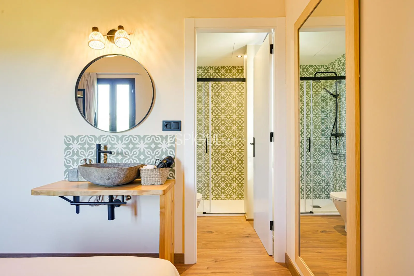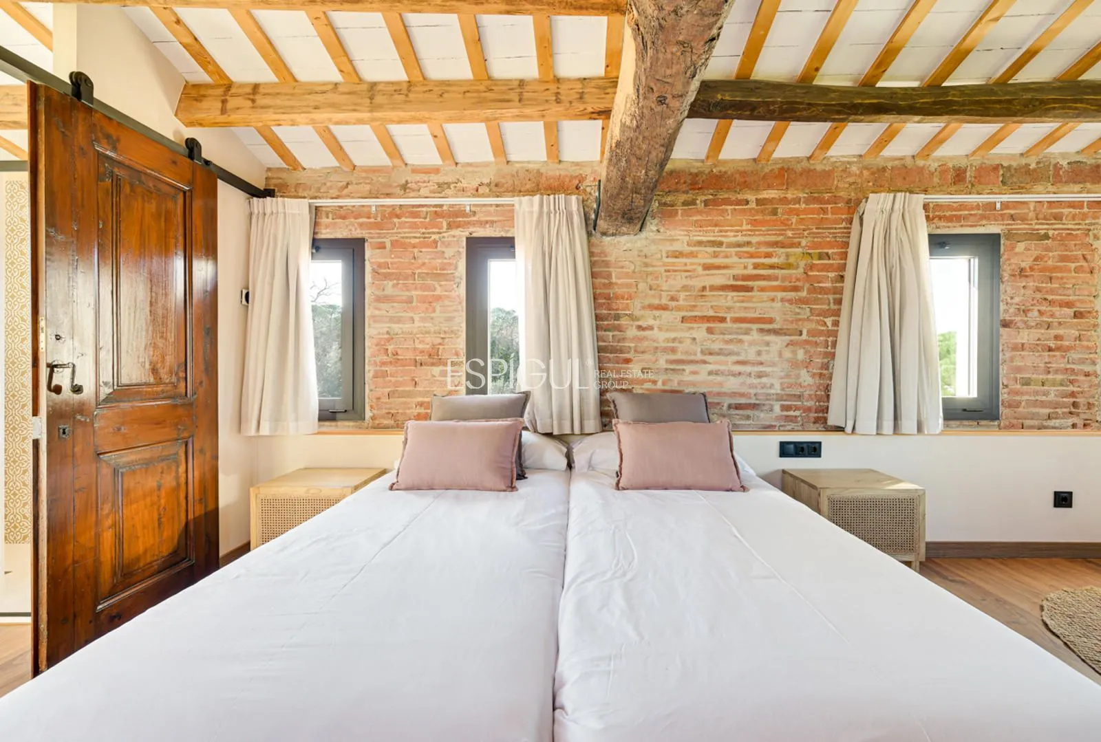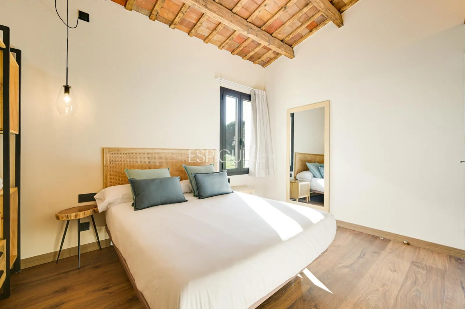 Vivienda principal: rehabilitada conservando su carácter original y adaptada a un uso moderno y funcional. En planta baja se distribuye la cocina abierta al salón comedor, zona de lavandería y aseo de cortesía, con salida al porche con barbacoa y al jardín con piscina junto al antiguo molino histórico. En la primera planta se ubican cuatro dormitorios en suite, y la planta superior cuenta con una buhardilla con dormitorio y bañera exenta con vistas abiertas al entorno.