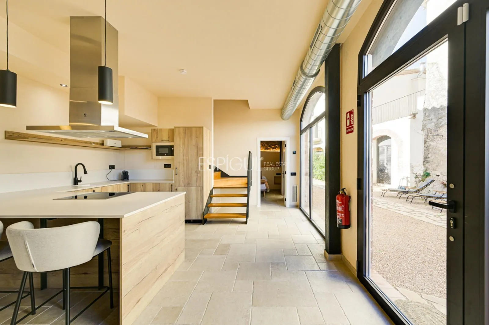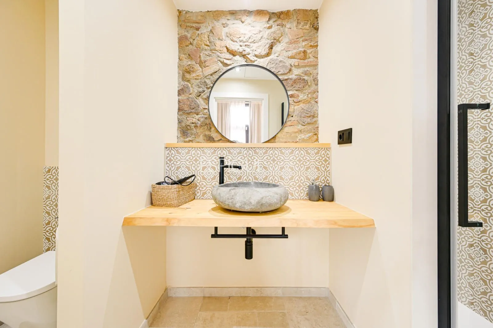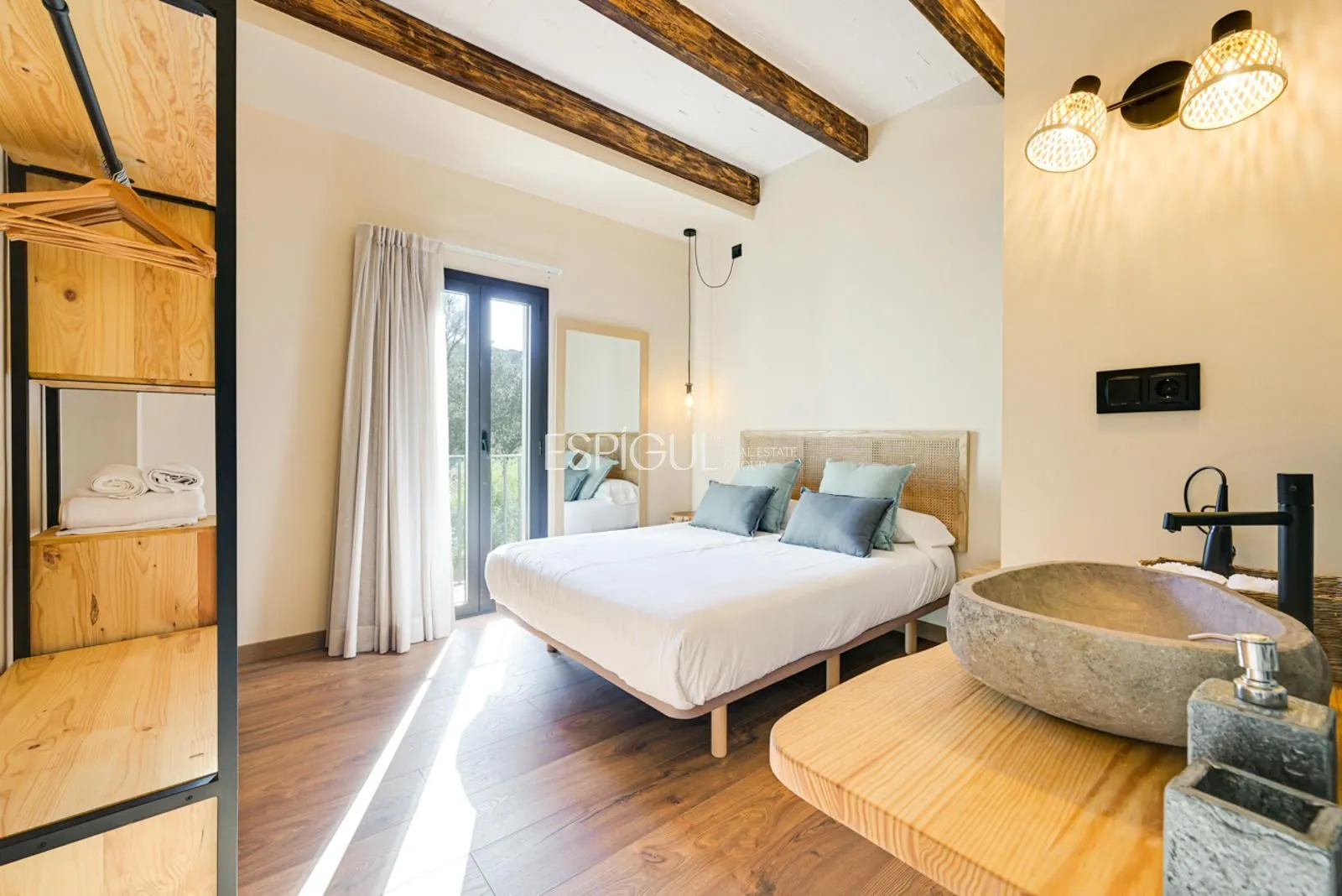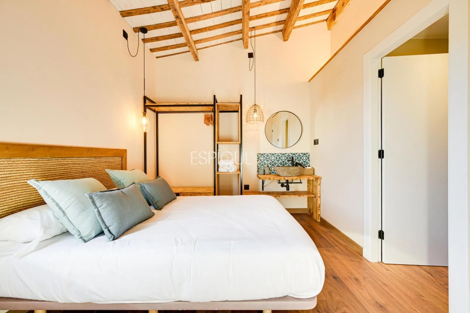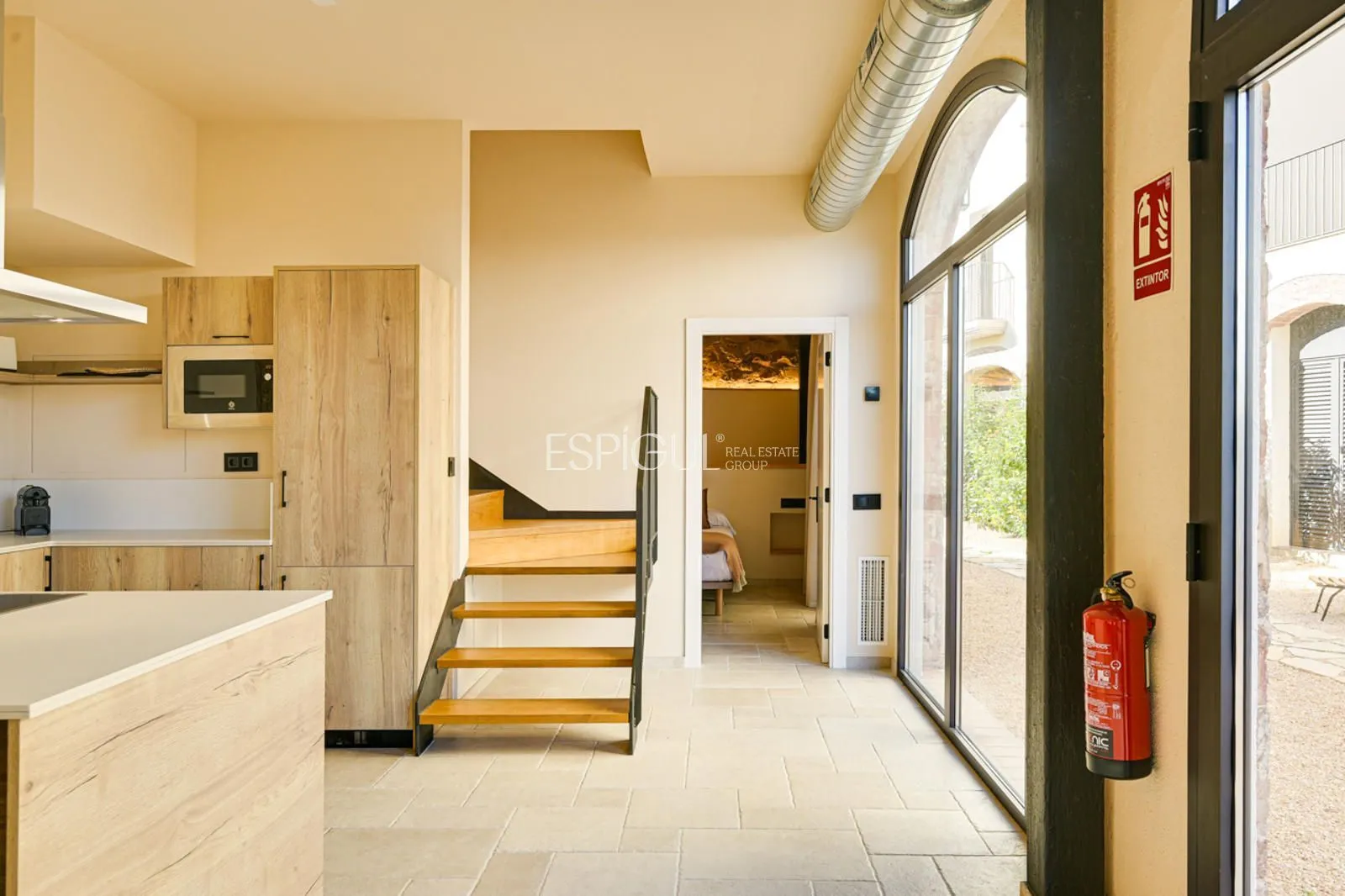 Vivienda principal: rehabilitada conservando su carácter original y adaptada a un uso moderno y funcional. En planta baja se distribuye la cocina abierta al salón comedor, zona de lavandería y aseo de cortesía, con salida al porche con barbacoa y al jardín con piscina junto al antiguo molino histórico. En la primera planta se ubican cuatro dormitorios en suite, y la planta superior cuenta con una buhardilla con dormitorio y bañera exenta con vistas abiertas al entorno.