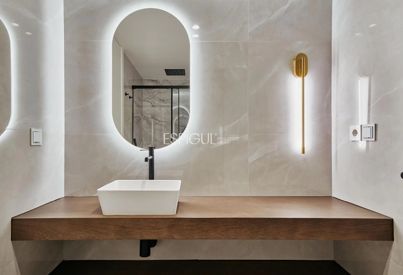 La distribución contempla tres dormitorios, dos baños completos y un vestidor, además de cocina equipada. La vivienda se entrega completamente amueblada y equipada, con calefacción central, aire acondicionado tipo split y sistema de domótica, garantizando confort durante todo el año.