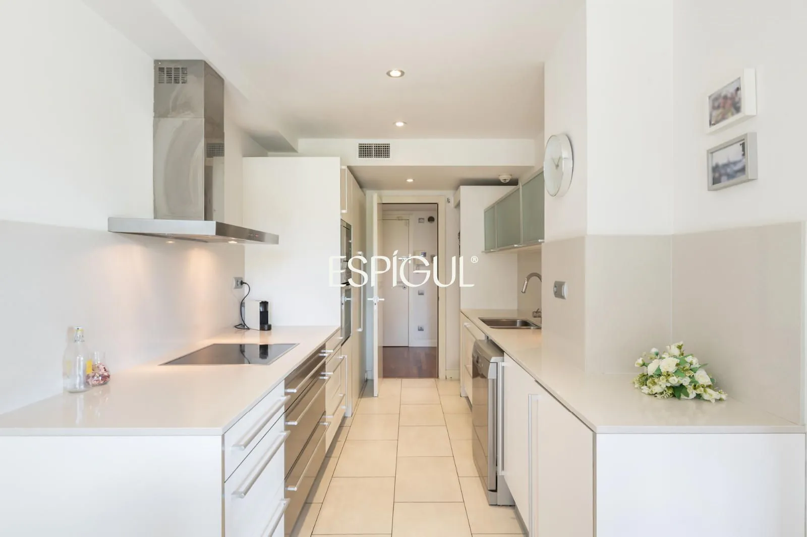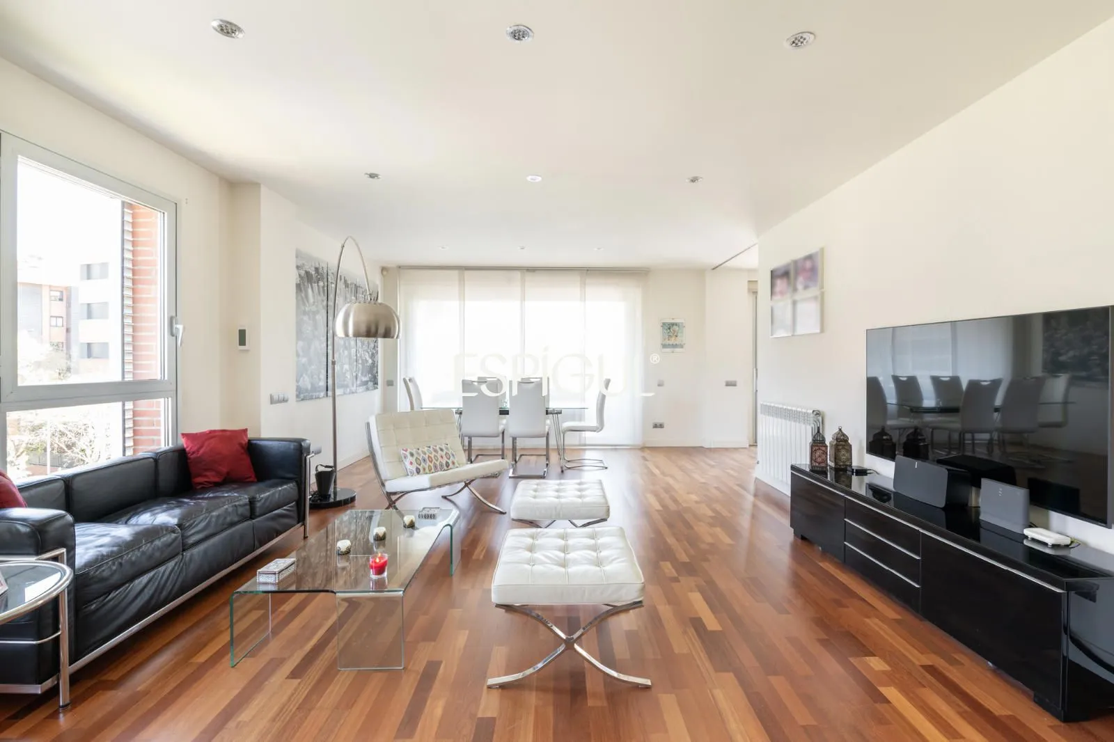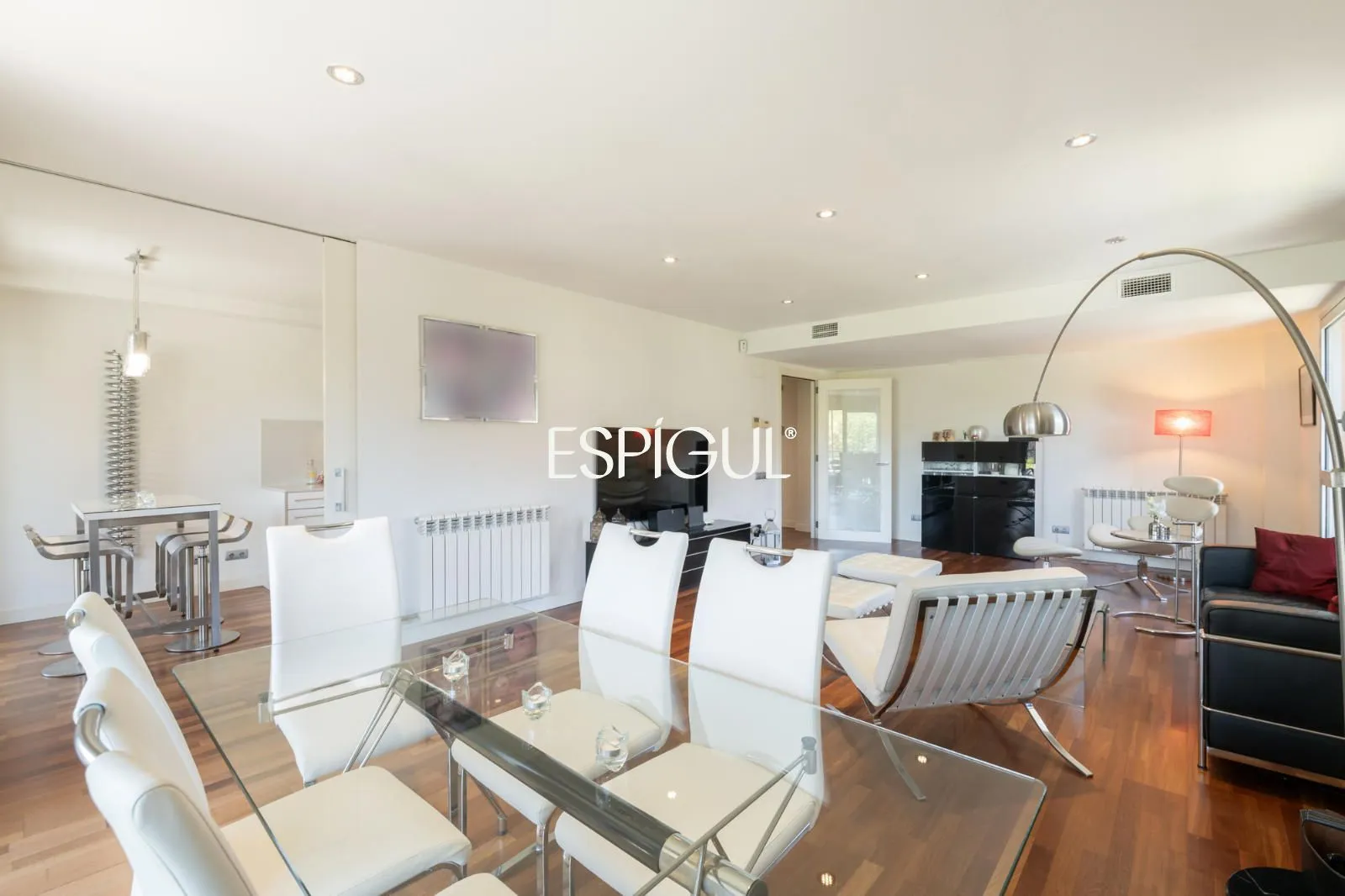La vivienda cuenta con amplio recibidor, gran salón comedor de 38 m² independiente y esquinero, que comunica a través de una gran puerta corredera a su amplia cocina office, equipada con electrodomésticos y zona de aguas totalmente integrada, ambos con salida a una amplia terraza soleada. Vivienda con orientación sur.