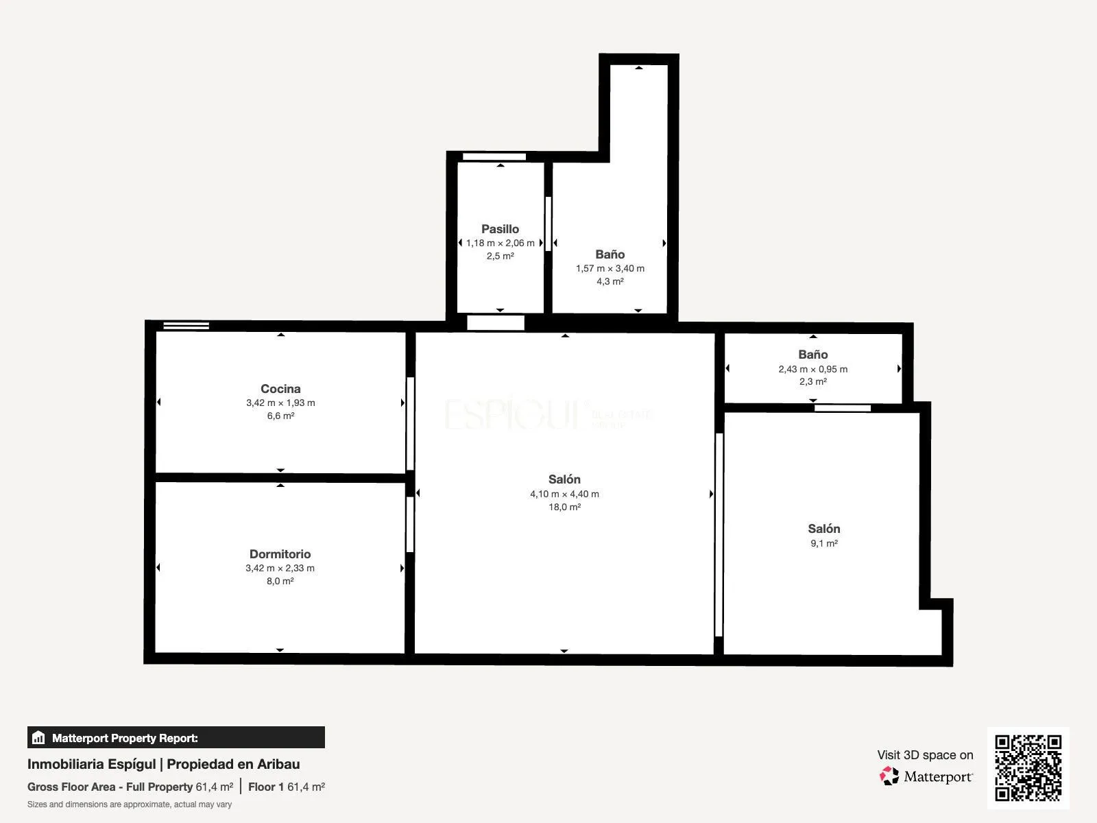 La cocina es independiente y cuenta con zona de aguas, ofreciendo una distribución práctica y funcional. La zona de noche incluye dos dormitorios —uno de ellos en suite— así como un segundo baño completo, garantizando comodidad y privacidad.