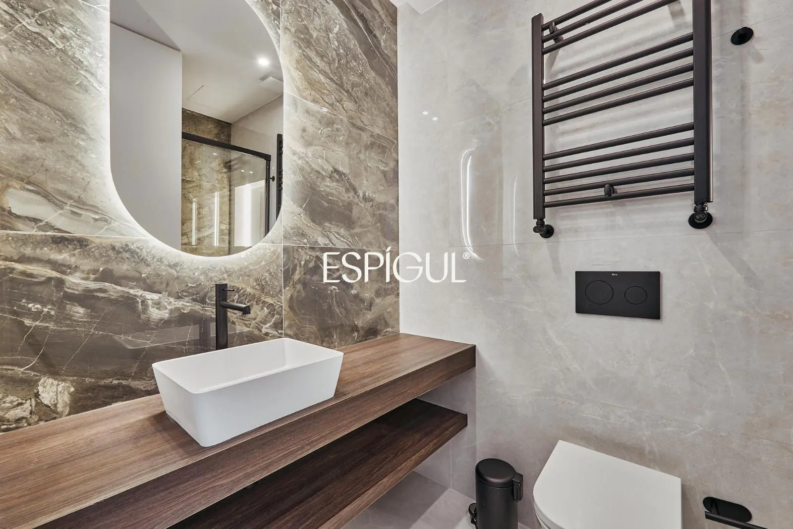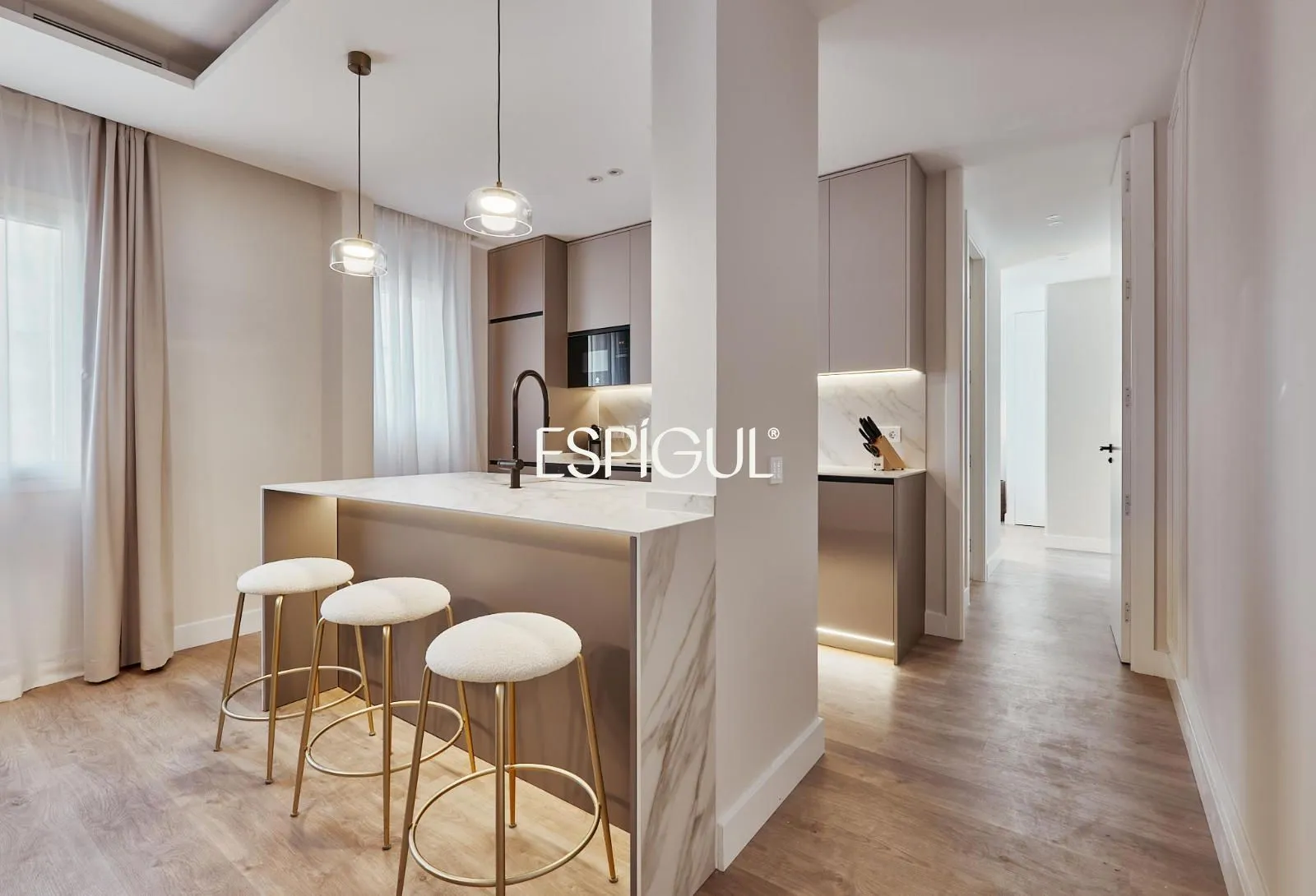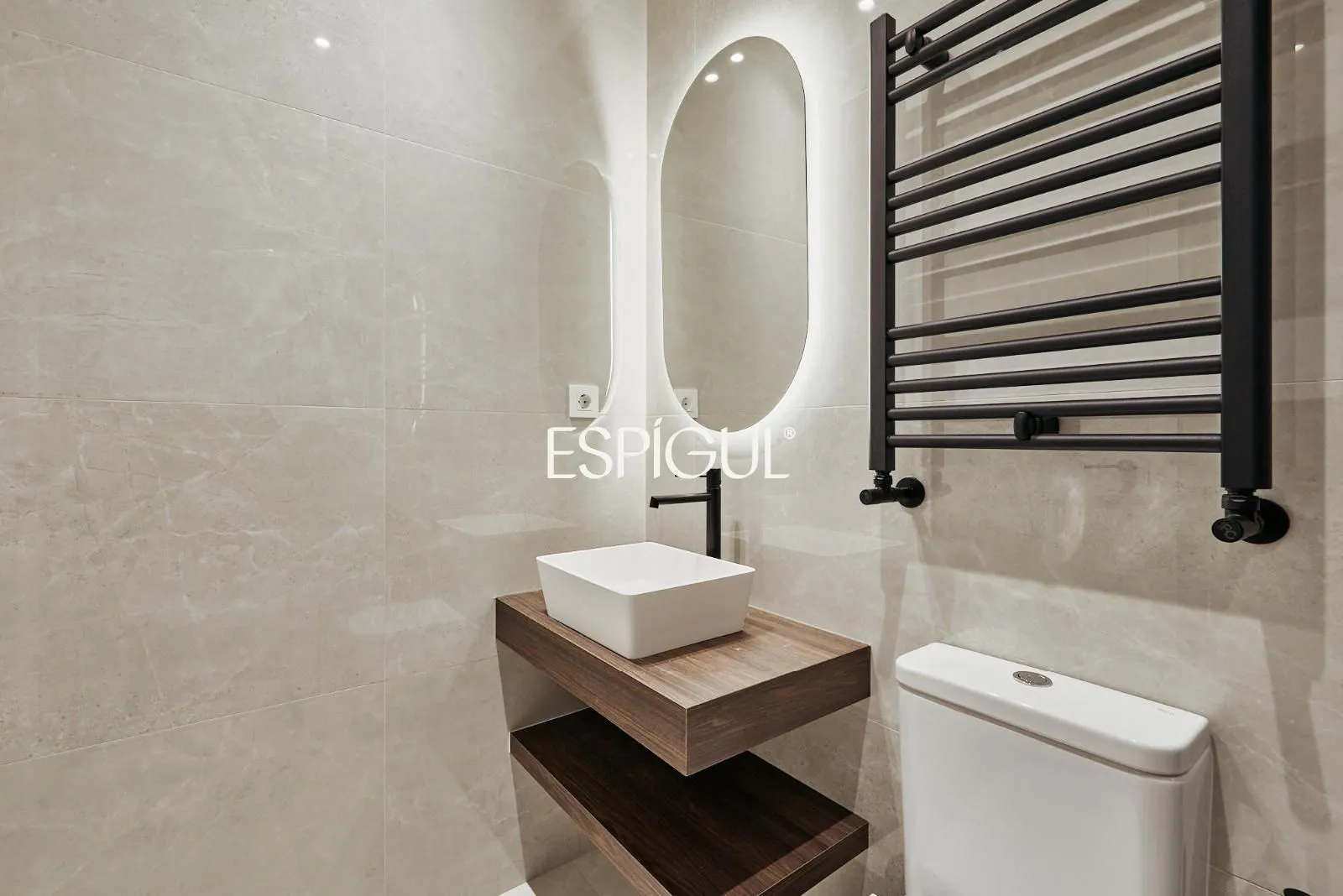Respecto al inmueble, la amplitud de las estancias facilita la creación de diferentes ambientes, desde sala de estar amplia hasta comedor contiguo a la cocina, manteniendo una circulación fluida. Las dos habitaciones permiten configurar una habitación principal con vestidor o despacho, mientras que el segundo dormitorio puede adaptarse como sala de hosting o área de estudio. Los dos baños ofrecen distribución práctica con iluminación adecuada y acabados de calidad.