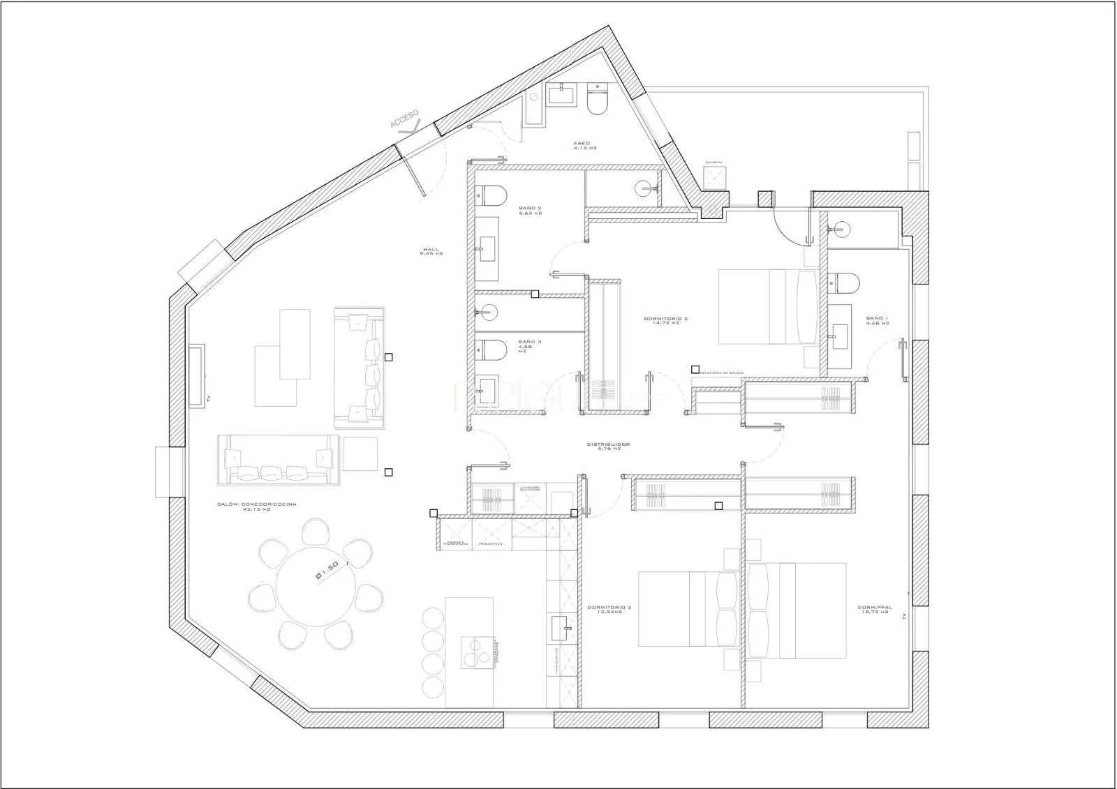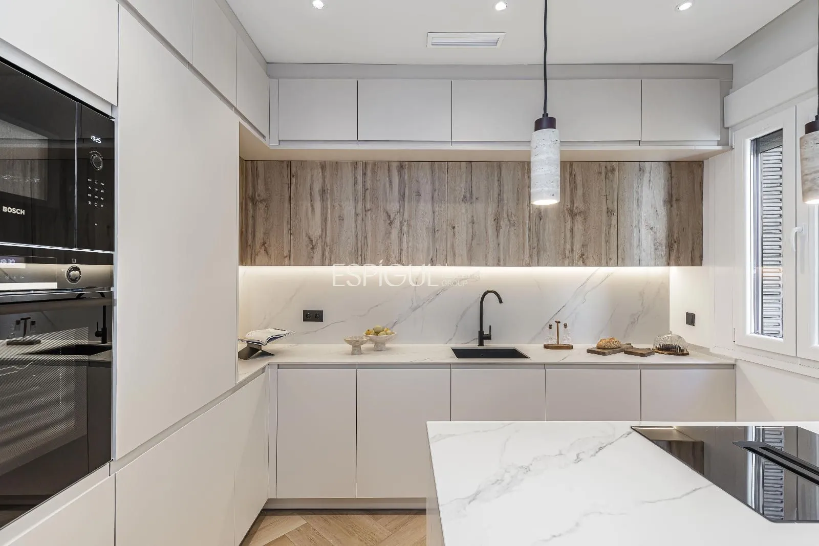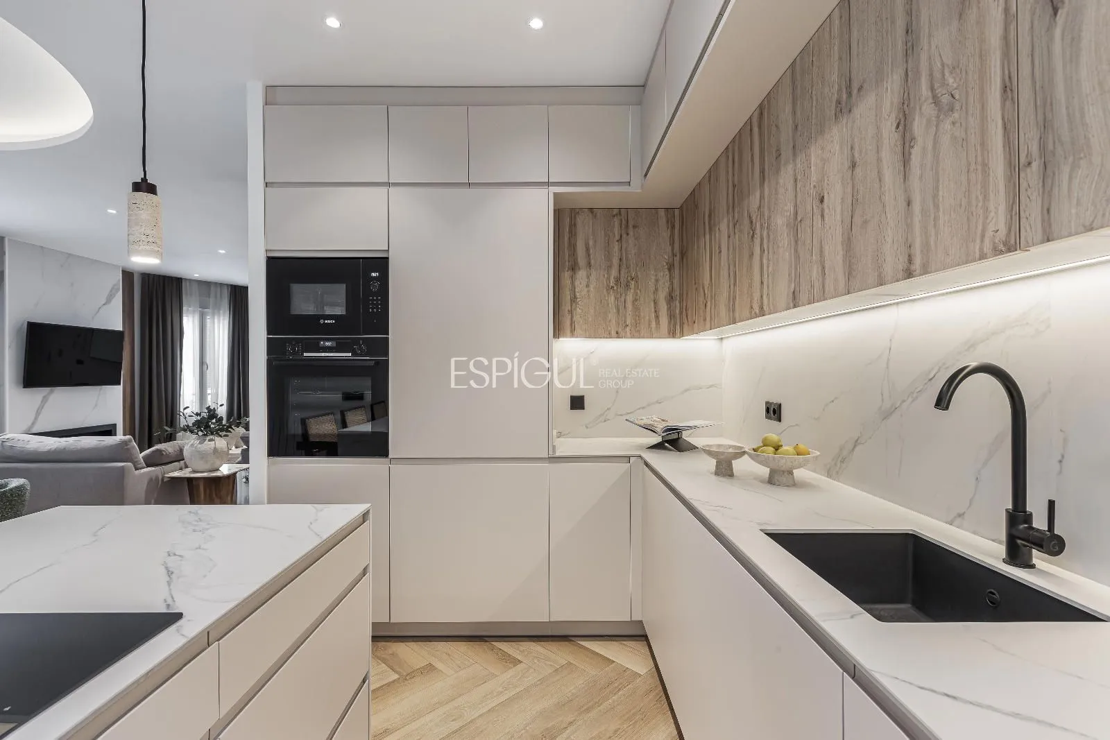 Al acceder al piso, un amplio salón–comedor destaca como el eje principal de la vivienda, caracterizado por su abundante luz natural y amplitud, ideal tanto para la vida cotidiana como para ocasiones sociales. La cocina, equipada con electrodomésticos integrados y una excelente capacidad de almacenaje, combina estética y practicidad, con una distribución que favorece el orden y la eficiencia.