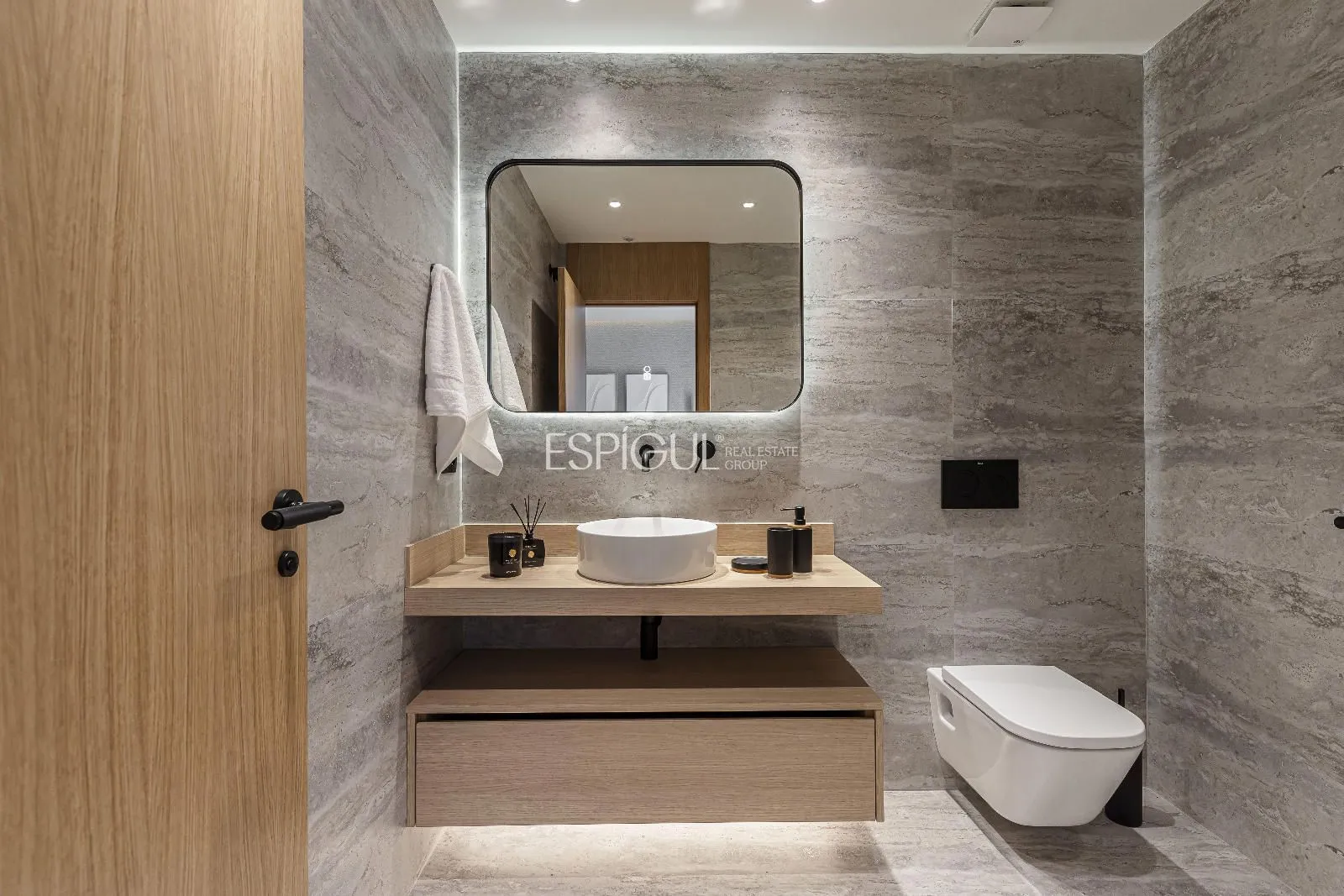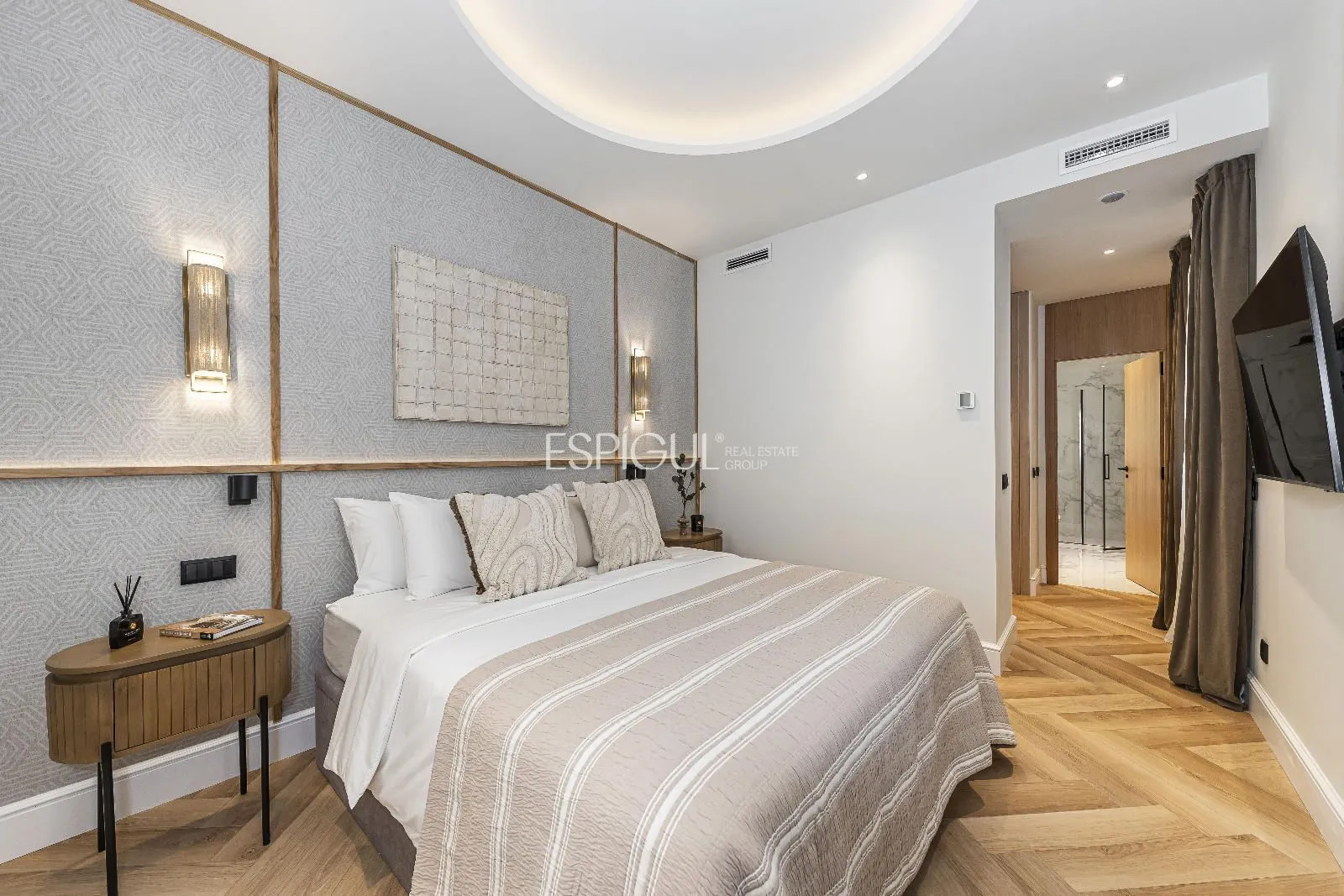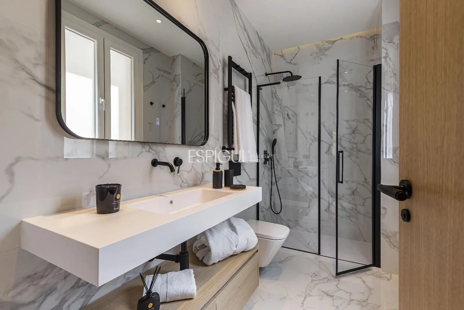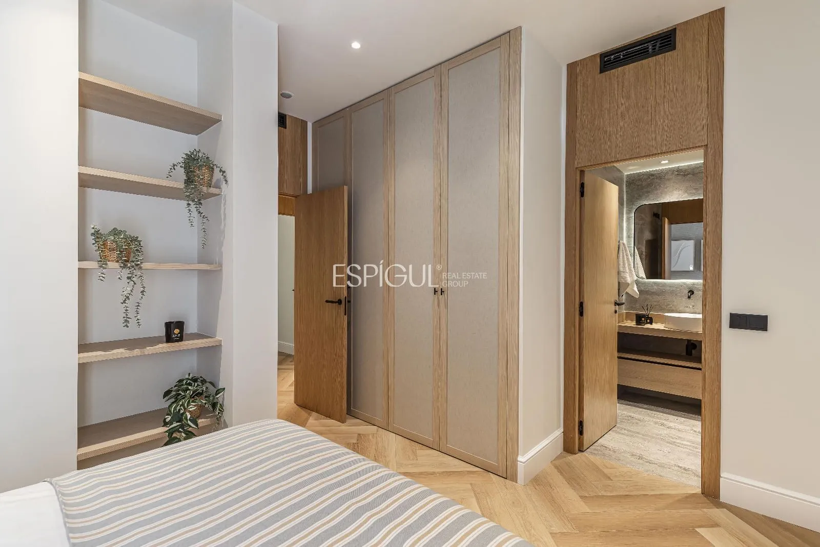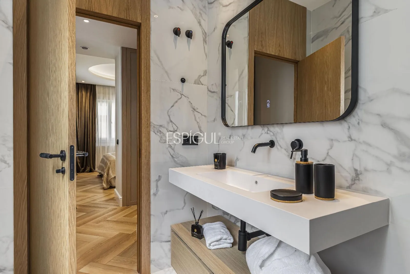 La zona de descanso ofrece tres dormitorios espaciosos y luminosos. El dormitorio principal, concebido como una suite, integra un elegante vestidor, baño en suite con acabados de alta gama y cuatro ventanas que bañan el espacio de luz y ventilación natural, creando un ambiente sereno y confortable. El segundo dormitorio, también en suite, cuenta con un baño de generosas dimensiones realizado con materiales nobles, además de acceso directo a una terraza orientada al sureste, perfecta para disfrutar del sol y el aire libre. El tercer dormitorio, orientado al oeste, ofrece amplitud y flexibilidad para adaptarse como dormitorio, despacho o sala polivalente, contando con un tercer baño completo que da servicio a esta estancia.