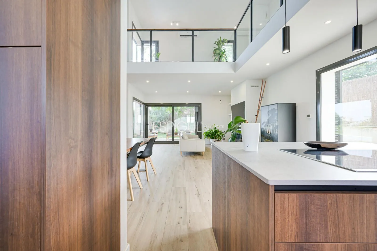 La planta principal distingue de manera clara la zona de día de la de noche. La primera alberga un salón-comedor amplio, bañado por luz natural gracias a sus grandes ventanales que conectan directamente con el jardín y la piscina. La cocina, de diseño contemporáneo y funcional, se presenta totalmente equipada con electrodomésticos de alta gama. La zona de descanso incluye dos dormitorios dobles que comparten un baño completo con bañera y ducha, así como un vestidor adaptable que puede convertirse en un tercer dormitorio según las necesidades.