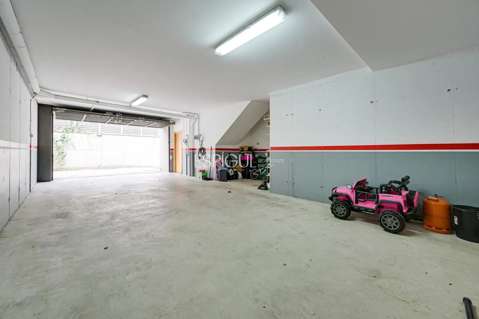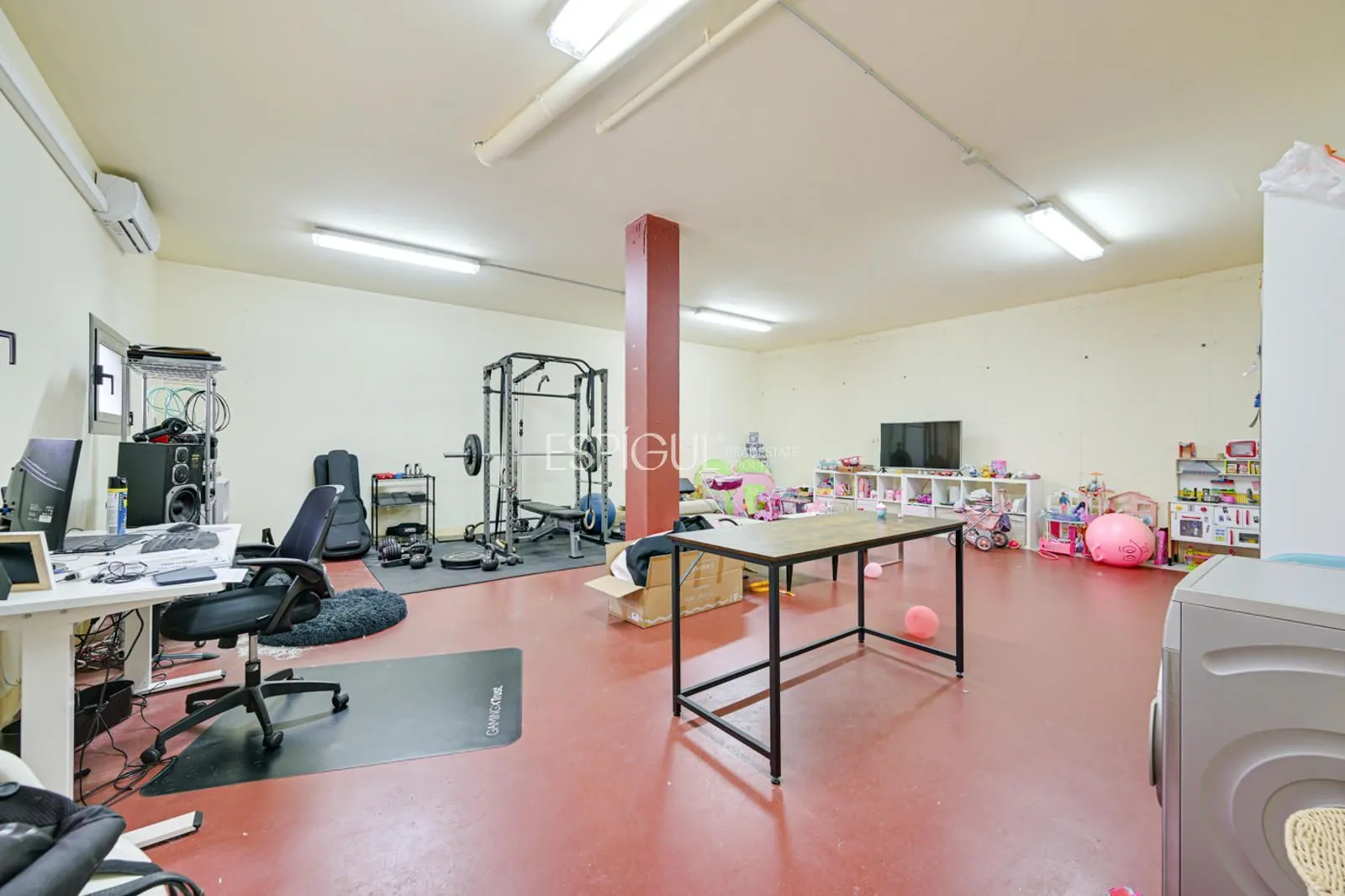 En la planta sótano se encuentra una sala polivalente de gran tamaño, actualmente habilitada como gimnasio y área de almacenamiento, con luz natural y ventilación exterior que garantizan su versatilidad. También dispone de un garaje con capacidad para cuatro vehículos y punto de recarga para coche eléctrico, asegurando comodidad y funcionalidad diaria.