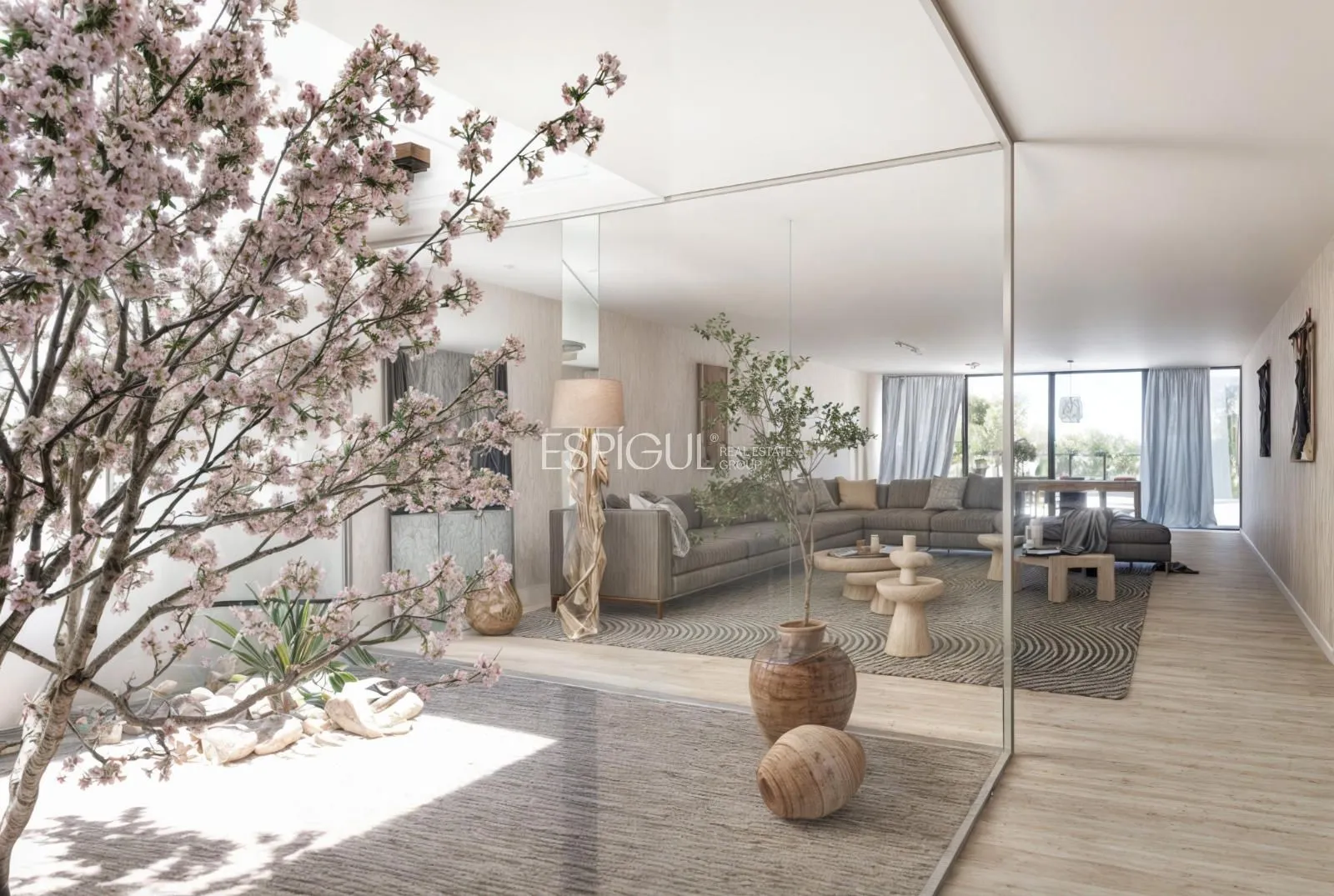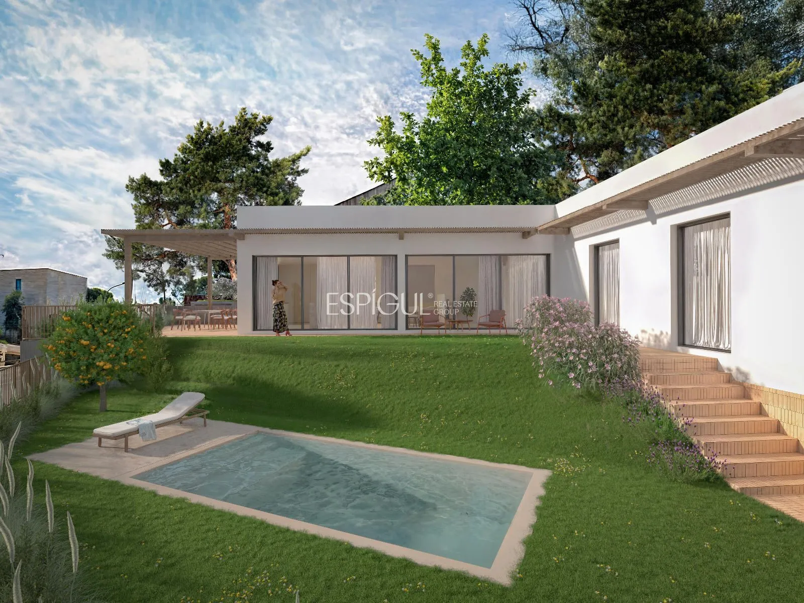 La vivienda se caracteriza por sus espacios amplios, diáfanos y conectados visualmente, donde el interior se funde con el exterior a través de un gran porche que da paso a un jardín con piscina espectacular.